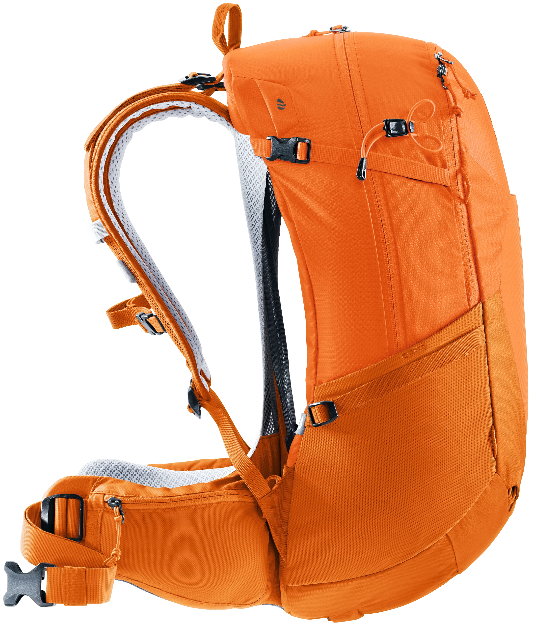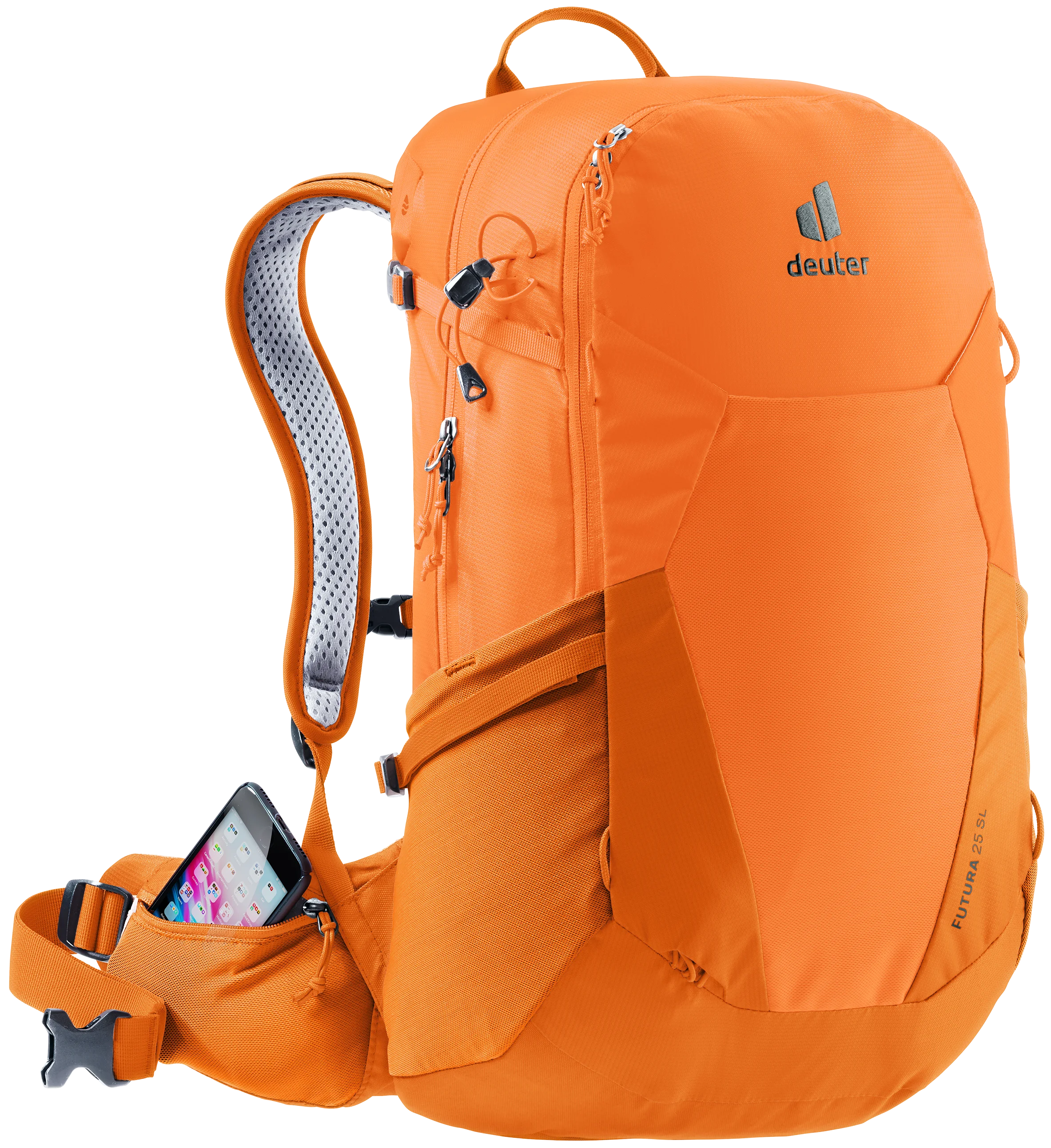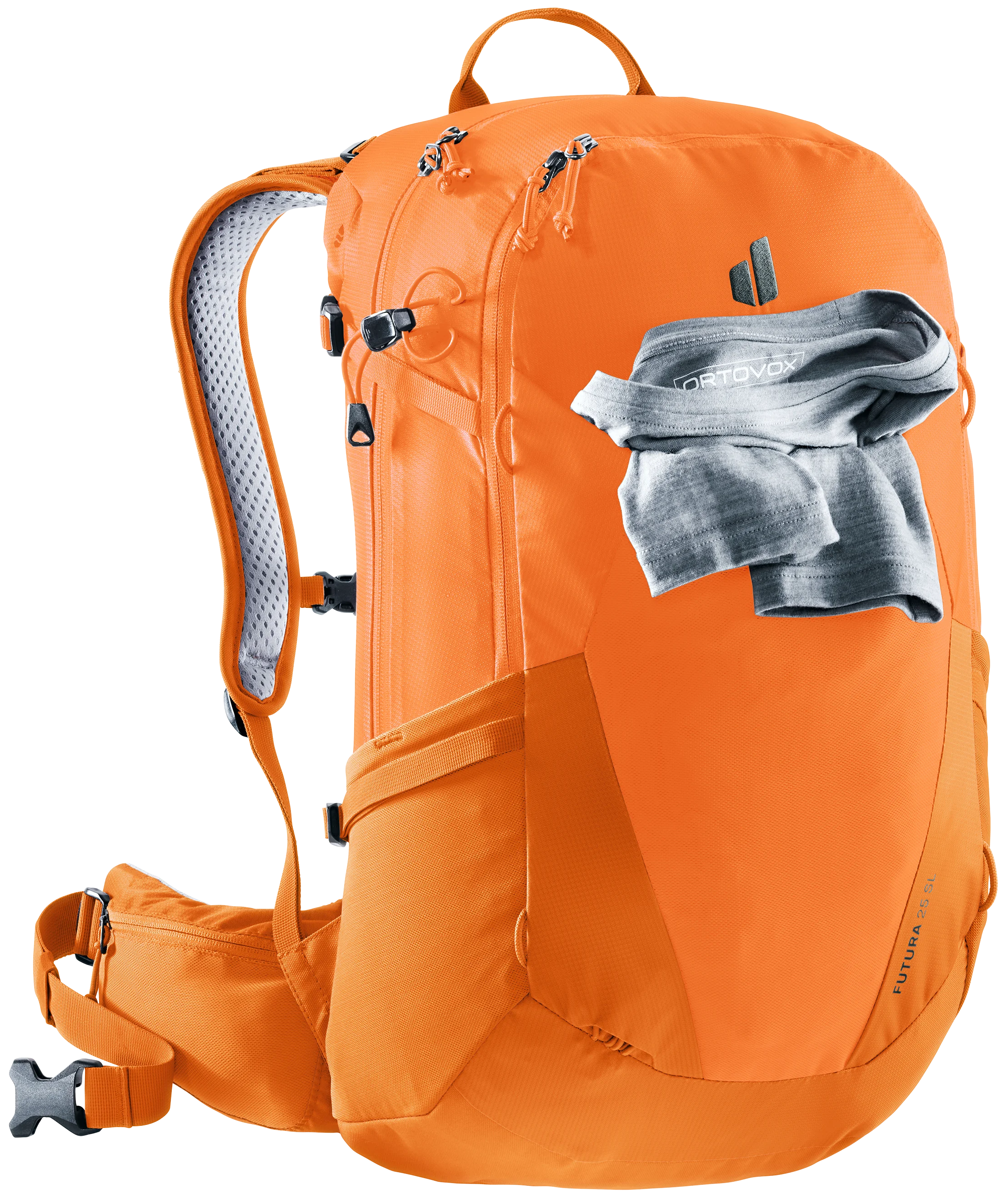 La ligera y funcional mochila de senderismo Futura SL está especialmente diseñada para adaptarse a la anatomía femenina. Con una espalda más corta, tirantes más estrechos y aletas de cadera de forma cónica, el Futura SL se sienta cómodamente en la espalda. El sistema de espalda Aircomfort con la nueva malla asegura la máxima ventilación en la espalda durante las caminatas deportivas de día. Si la ropa se humedece, puede secarse rápidamente en el bolsillo delantero elástico y permeable al aire durante la caminata.
