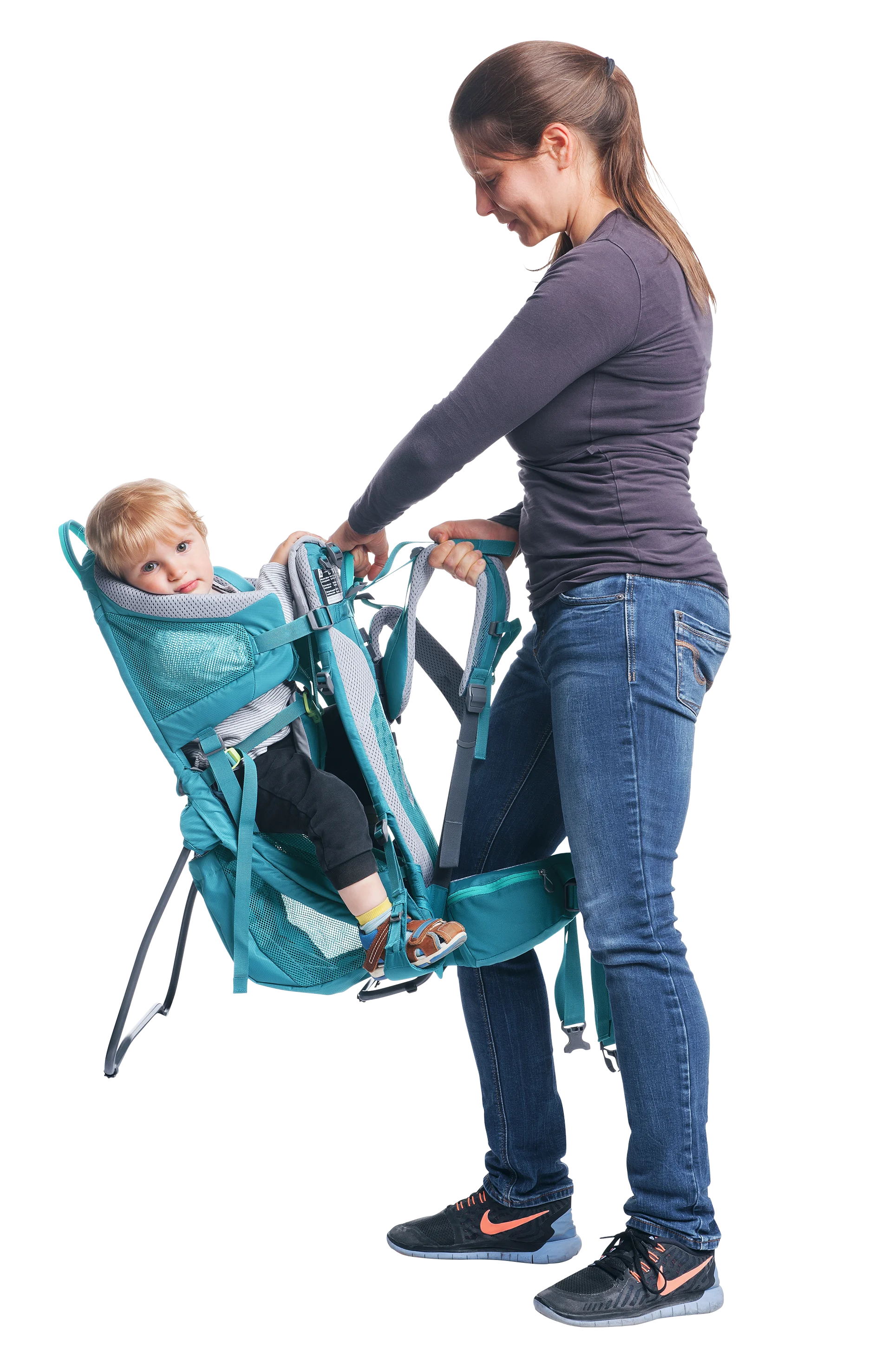 El sistema de transporte se ha adaptado especialmente a la anatomía de la mujer. Es ideal para las madres que buscan una mochila portaniños que se ajuste a ellas a la perfección, con unas correas para los hombros más estrechas y unas aletas para las caderas en forma de cono. El nuevo sistema compacto Lite Air de la parte posterior, provisto de ventilación, hace que esta mochila portaniños resulte absolutamente ligera. Su estructura deportiva ofrece un alto nivel de comodidad y, por supuesto, cuenta con el sello de aprobación de seguridad TÜV GS. La zona de asiento del niño, a la que se accede por el lateral, es muy cómoda, con un arnés de seguridad de uso y de sencillos, y confeccionada en un material muy suave.
