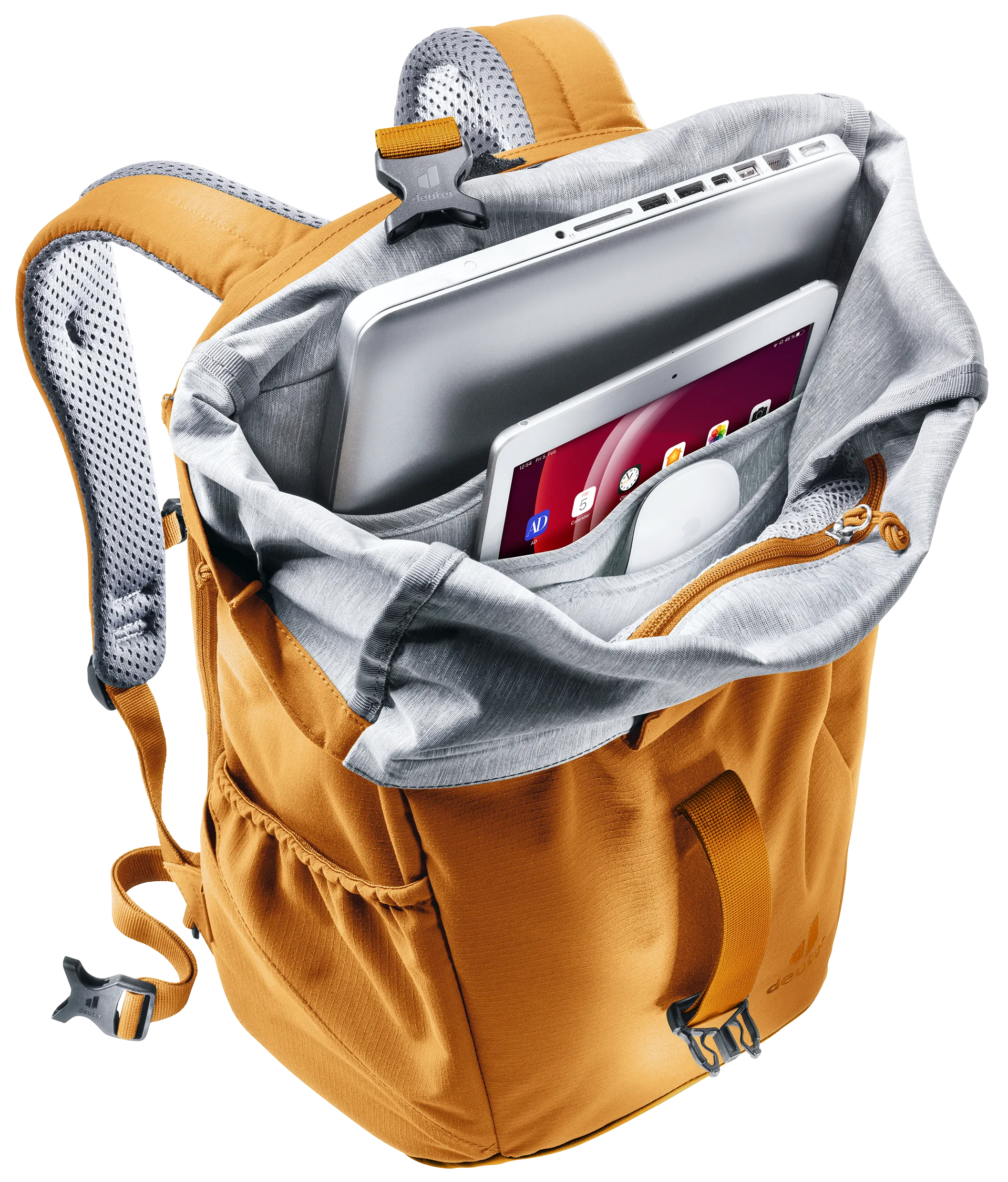 Además del portátil y los documentos de trabajo, que se guardan de forma segura en varios compartimentos interiores, los objetos más grandes de uso cotidiano también encuentran espacio suficiente en la mochila (22L) gracias a la ampliación del volumen de la tapa