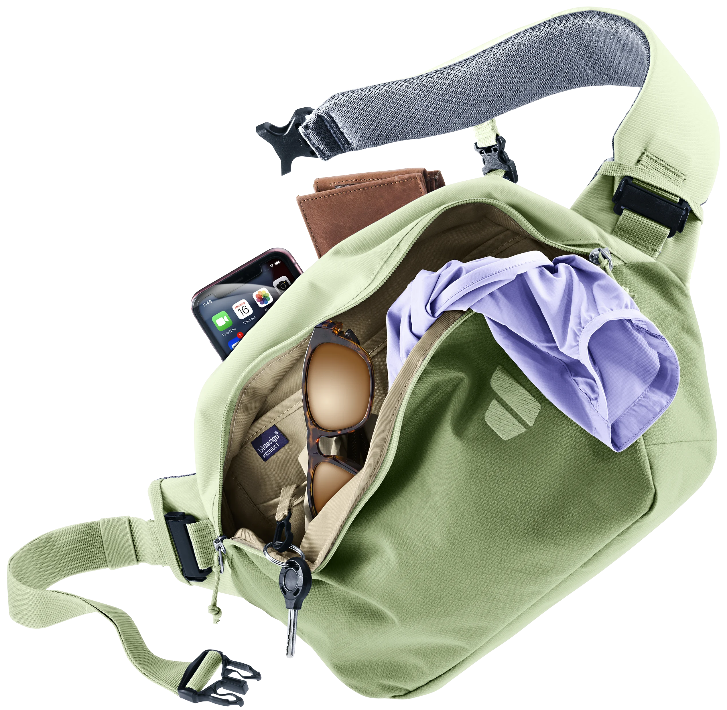 Esta elegante bandolera no sólo te deja las manos libres. También es extremadamente funcional. Su inteligente diseño ofrece un amplio espacio de almacenamiento en los compartimentos y en el interior de la bolsa para objetos personales, objetos de valor y una tableta. En la versión más grande, un portabotellas bidireccional integrado ofrece espacio seguro para 1 litro de líquido. Y para aliviar los hombros cansados después de un largo viaje, la bolsa puede llevarse tanto en el lado izquierdo como en el derecho.