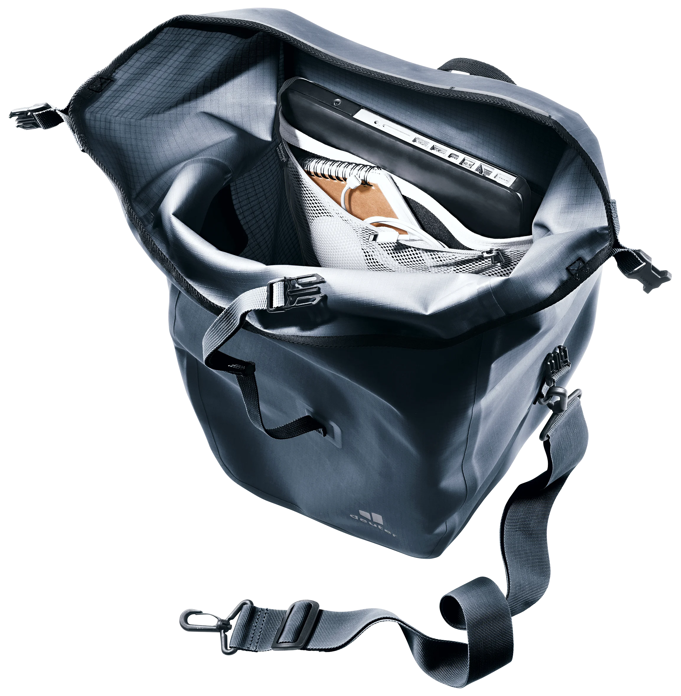 Esta multifuncional alforja para bicicleta se puede usar como bolsa de equipaje en la rueda trasera o llevarla al hombro para un uso diario. Su material impermeable ofrece una excelente protección ante la humedad. El sistema optimizado de desmontaje rápido BagFix ofrece un soporte estable y una rápida manipulación de la mochila gracias a sus carriles de fácil uso, los ganchos y los distanciadores. La espaciosa alforja de 25 litros con cierre enrollable se puede ampliar en 5 litros adicionales.