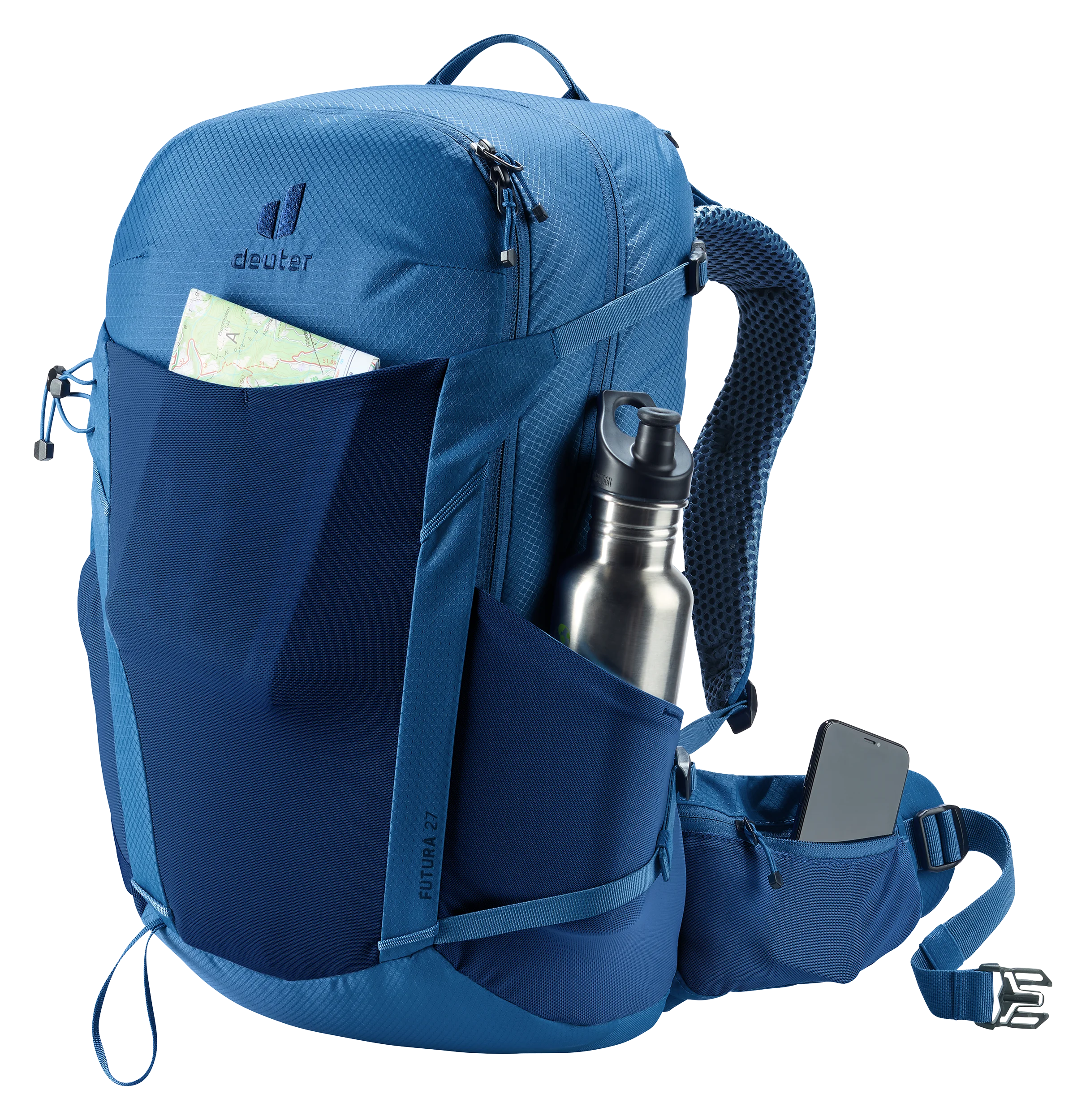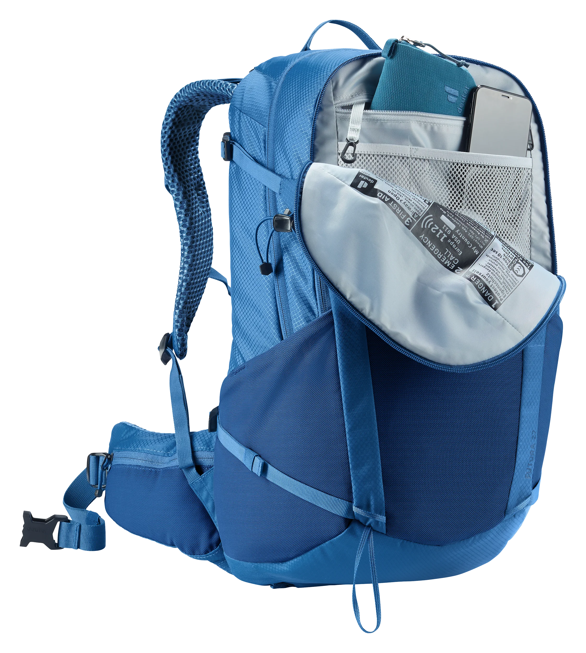 Deux grandes poches extérieures extensibles, deux poches sur les stabilisateurs de hanche, deux compartiments sur le rabat (24 SL, 26, 30 SL, 32, 34 EL), un compartiment inférieur séparé (30 SL, 32, 34 EL), et un grand compartiment extensible sur l’avant offrent un vaste espace de rangement et garantissent une organisation optimale. L’accès au compartiment intérieur est facilité par la grande ouverture par le haut et l’ouverture frontale en forme de U (24 SL, 26). Les dispositifs de fixation assurent le bon maintien des bâtons, du casque et autres accessoires.