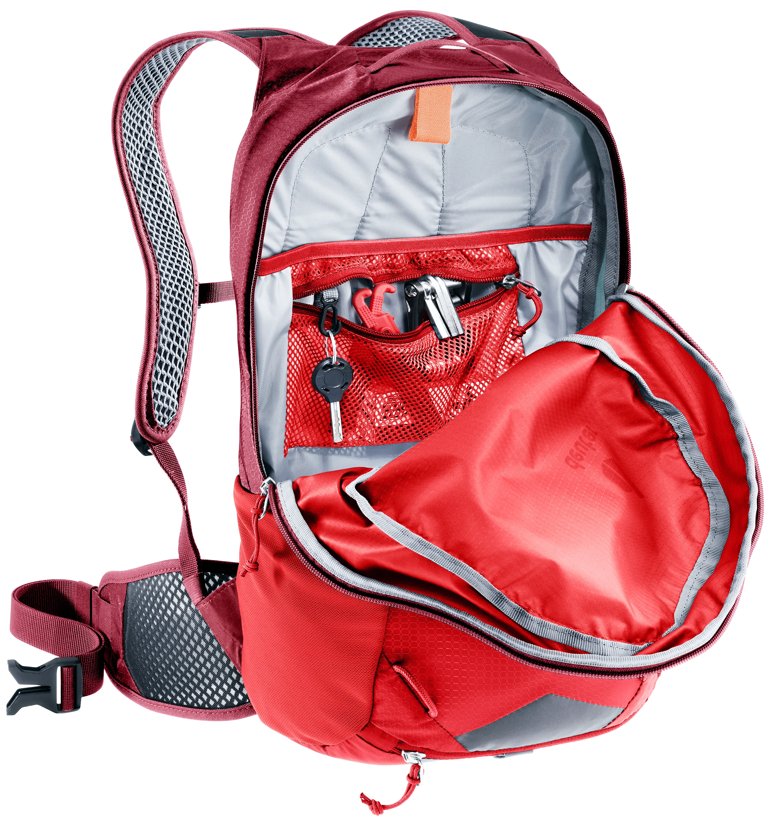 • Compartiment intérieur élastique pour le rangement des vêtements mouillés / couverts de sueur, du réservoir d’eau, etc.