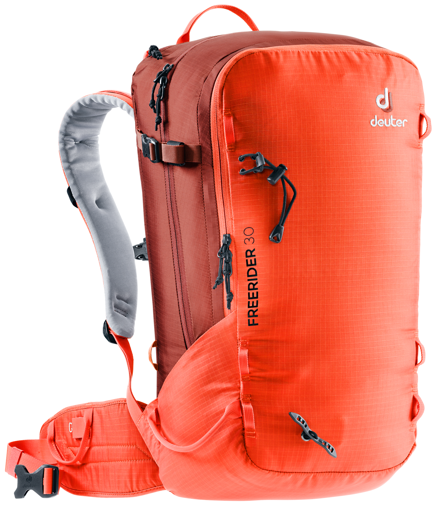 The Freerider pack has clever winter-specific details like access to the main compartment via a fully opening back panel. This gives you good oversight of the contents and it also means the carry system stays dry. But even if a little snow does get onto the carry system, our new hard-wearing, breathable, snow-resistant fabric will keep your back dry. And when it comes to safety, the Freerider has it all worked out. It features a separate, easy-to-access compartment for your probe and shovel so that your avalanche equipment is quick to access in an emergency. We’ve also equipped it with our new modular attachment set-up. Two dedicated straps that attach to the gear loops on the pack allow you to affix skis, a snowboard or snowshoes to the pack in no time at all – skis diagonally across the back or in an A-frame, a snowboard or snowshoes in an upright position. These versatile gear straps can also be used as compression straps.