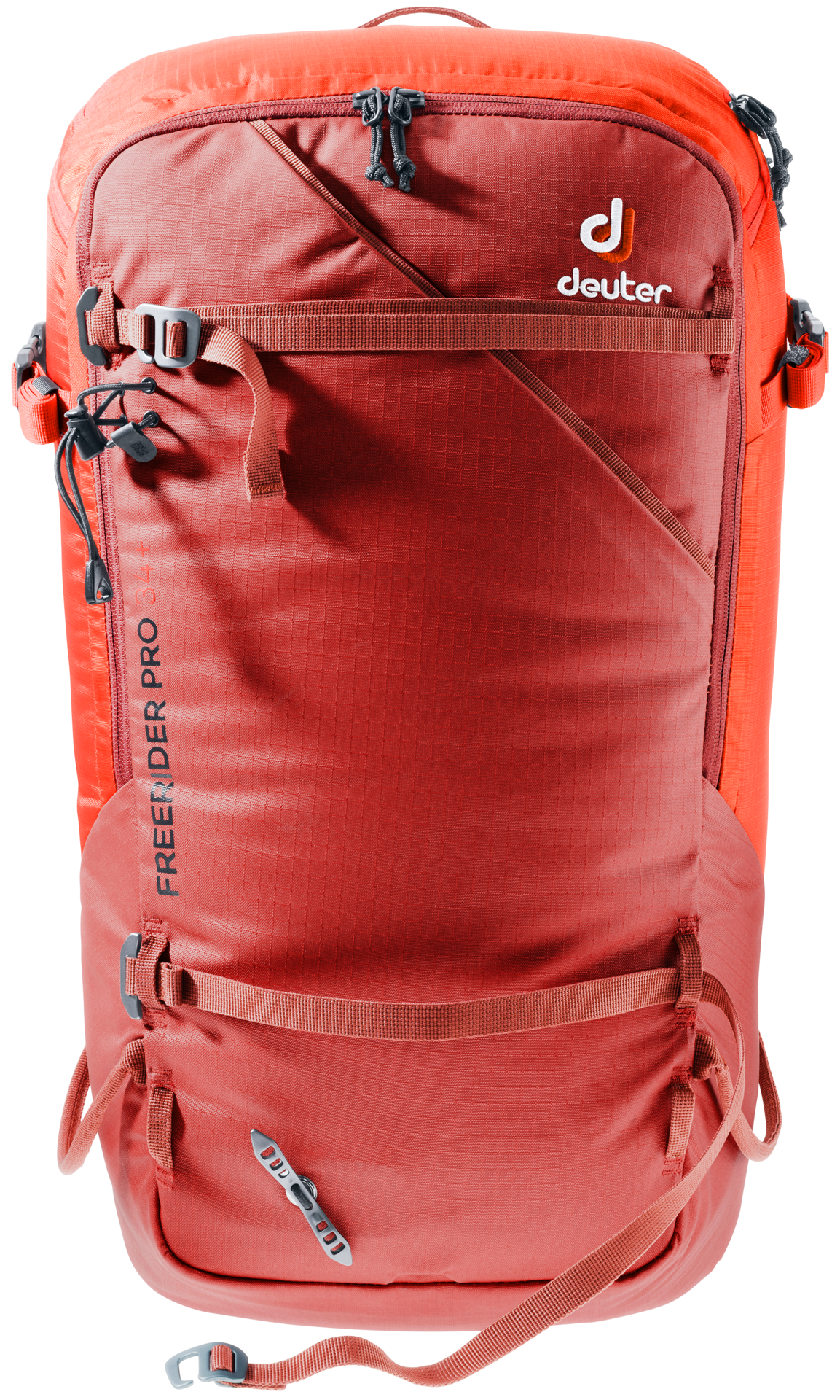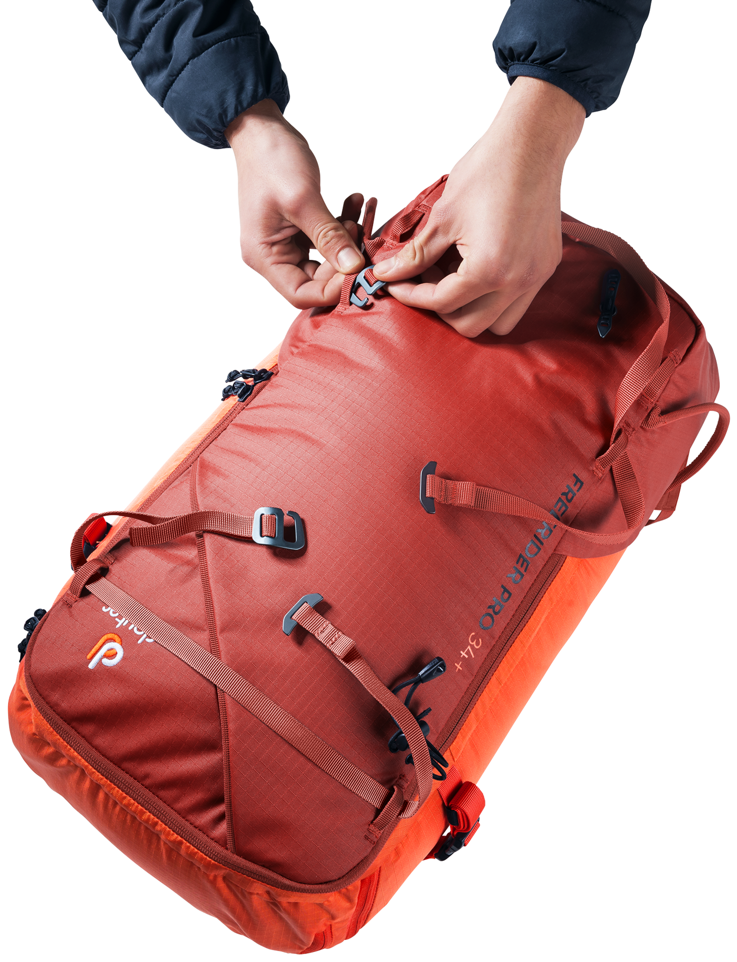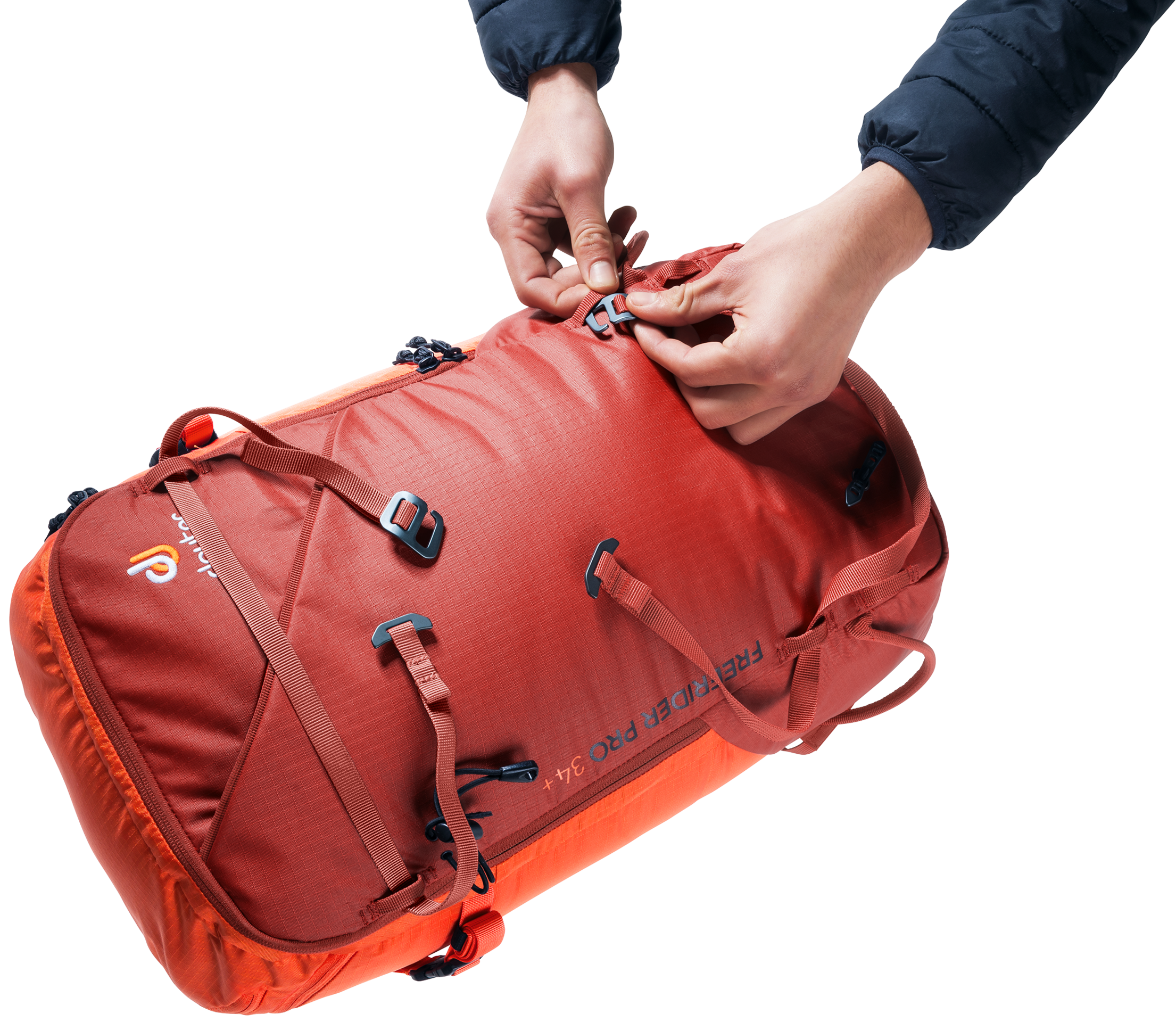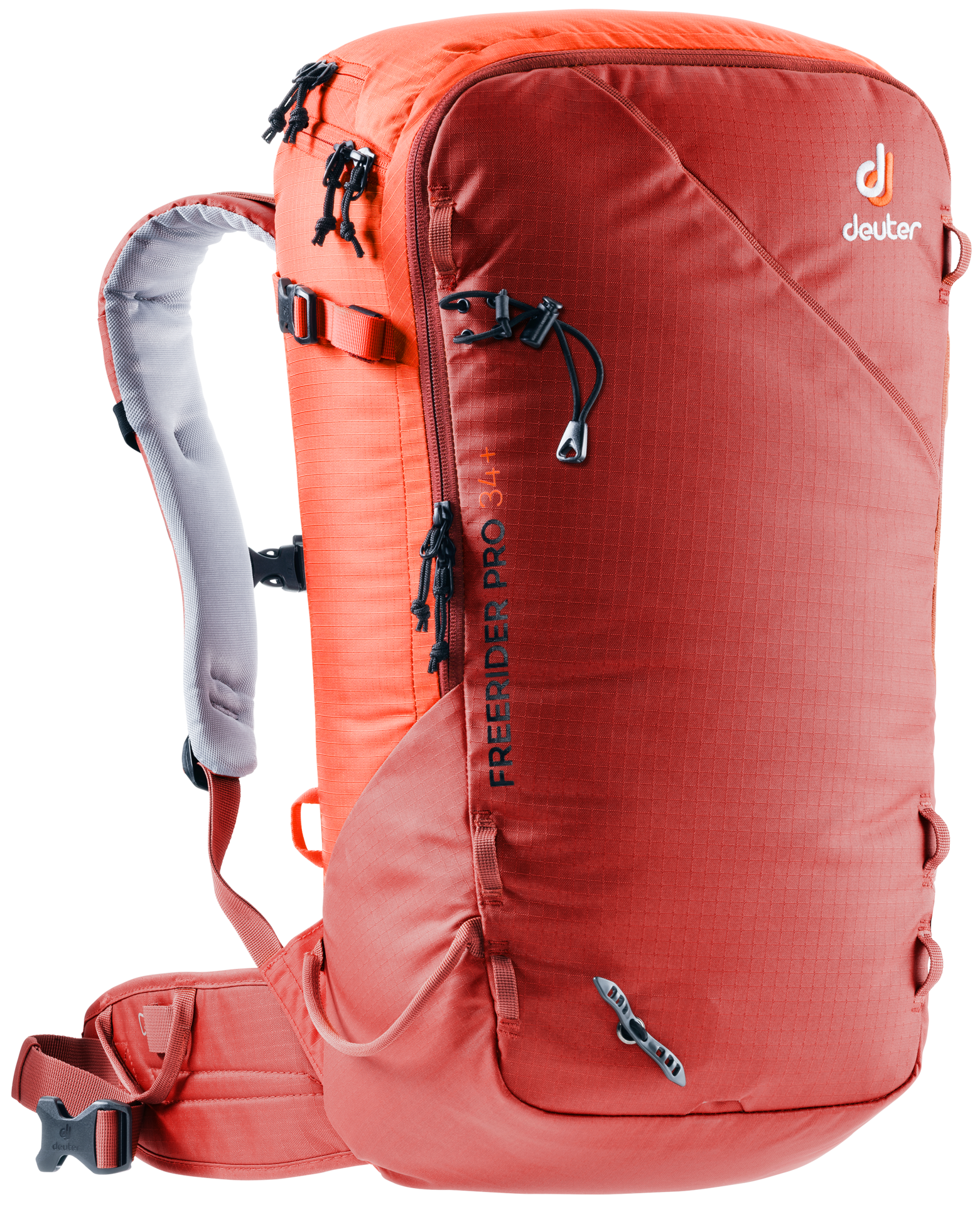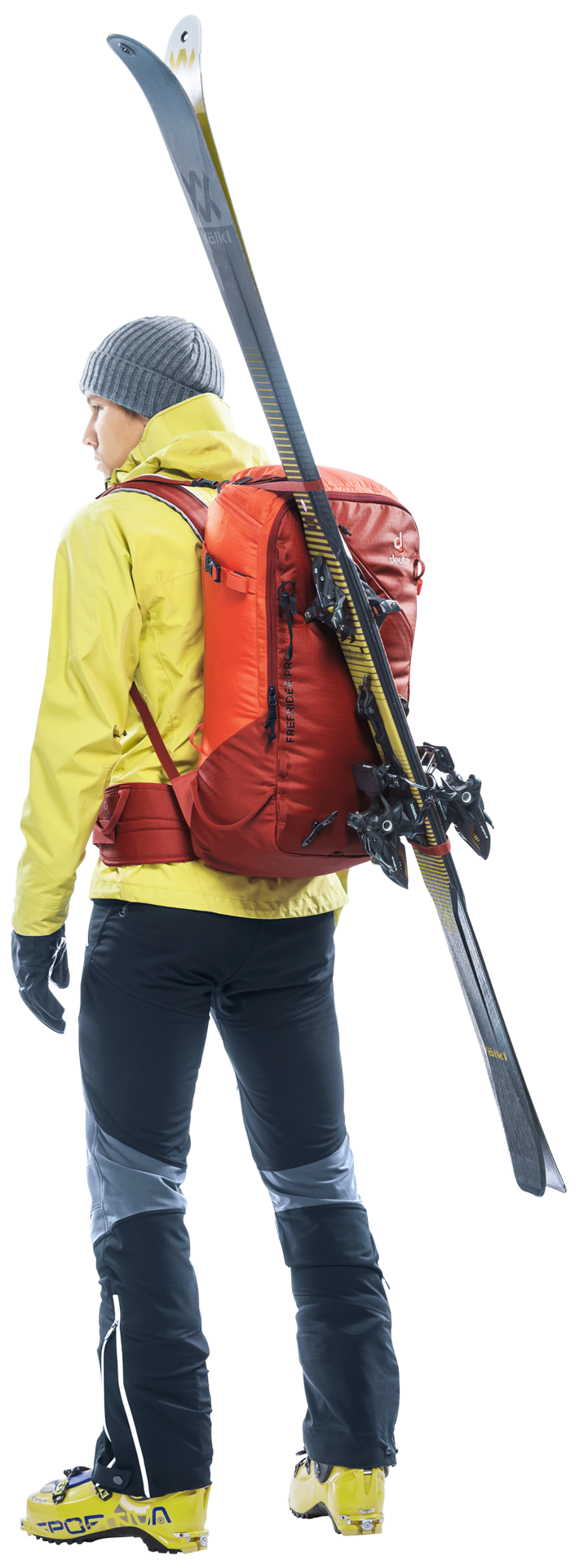 The Freerider Pro has all the features and flexible capacity you need for multi-day winter adventures in the mountains. This latest incarnation of the Freerider Pro has a new roll-top closure. This allows you to expand the capacity of the pack by 10 litres. The roll-top itself is also fitted with a stowable strap for the attachment of extra kit or a climbing rope, or to compress the roll-top itself. At times during the day when you don’t need your skis, snowshoes or snowboard, they can be attached to the outside of the pack quickly and easily using two dedicated gear straps; skis can be affixed diagonally across the back or in an A-frame, a snowboard or snowshoes in an upright position. These versatile gear straps can also be used for compression.