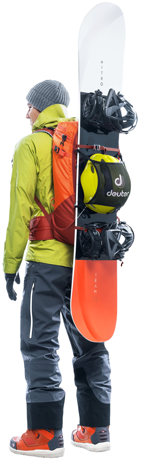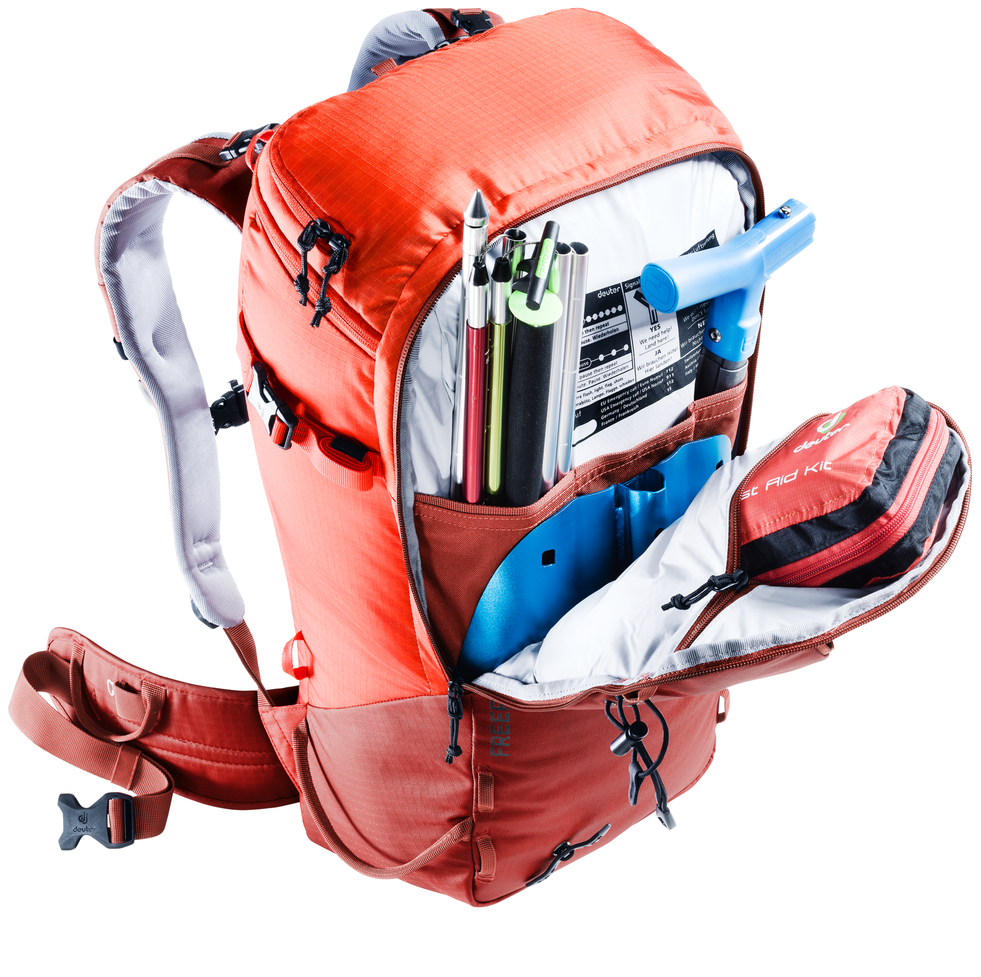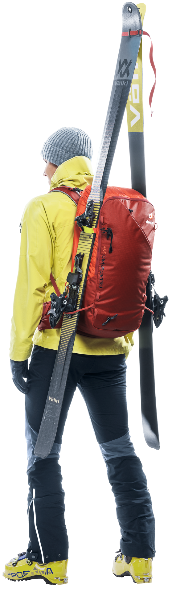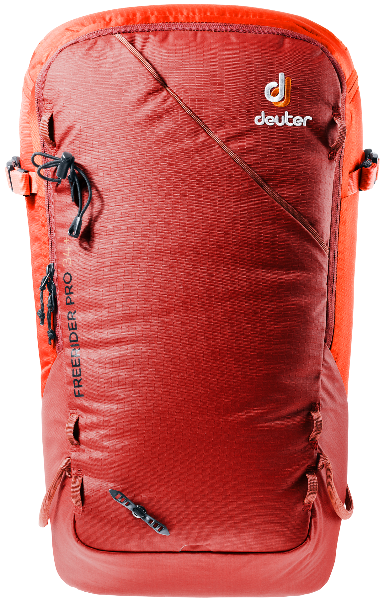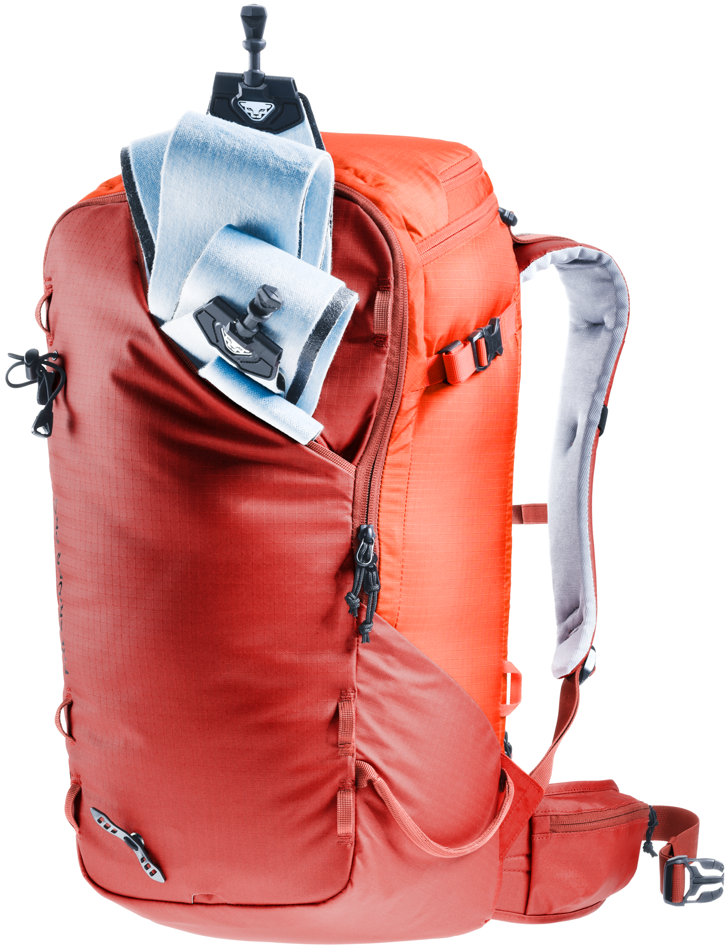 The Freerider Pro has all the features and flexible capacity you need for multi-day winter adventures in the mountains. This latest incarnation of the Freerider Pro has a new roll-top closure. This allows you to expand the capacity of the pack by 10 litres. The roll-top itself is also fitted with a stowable strap for the attachment of extra kit or a climbing rope, or to compress the roll-top itself. At times during the day when you don’t need your skis, snowshoes or snowboard, they can be attached to the outside of the pack quickly and easily using two dedicated gear straps; skis can be affixed diagonally across the back or in an A-frame, a snowboard or snowshoes in an upright position. These versatile gear straps can also be used for compression.