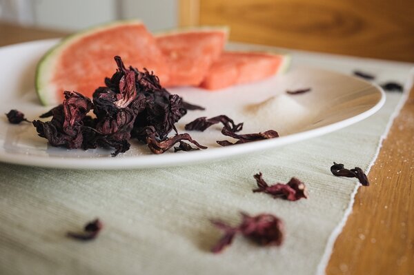 Die Hibiskusblüten über Nacht in Wasser einlegen.