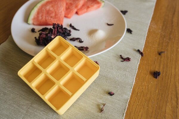 In Eiswürfelformen aus Silikon gießen und kühlen, bis sie fest sind.