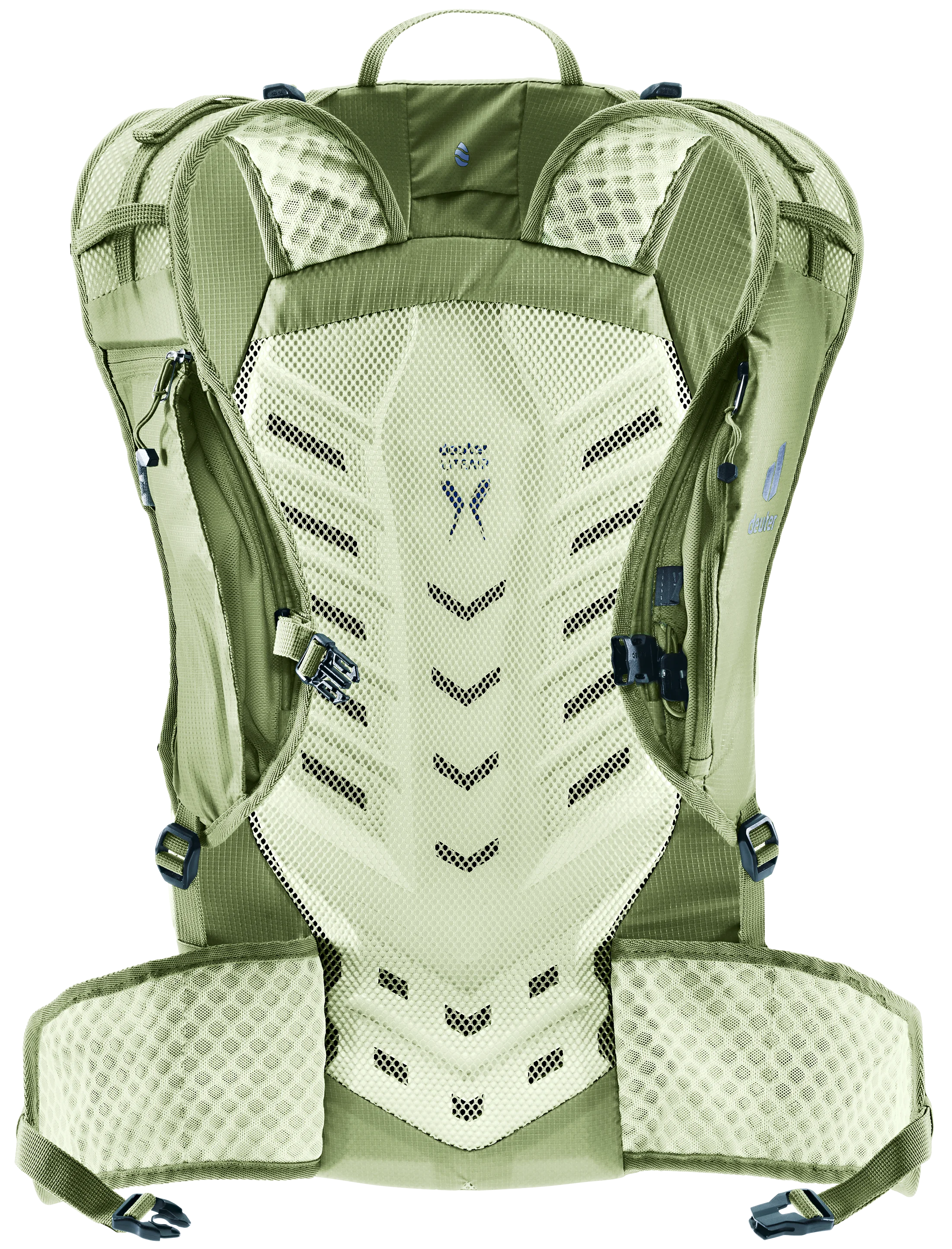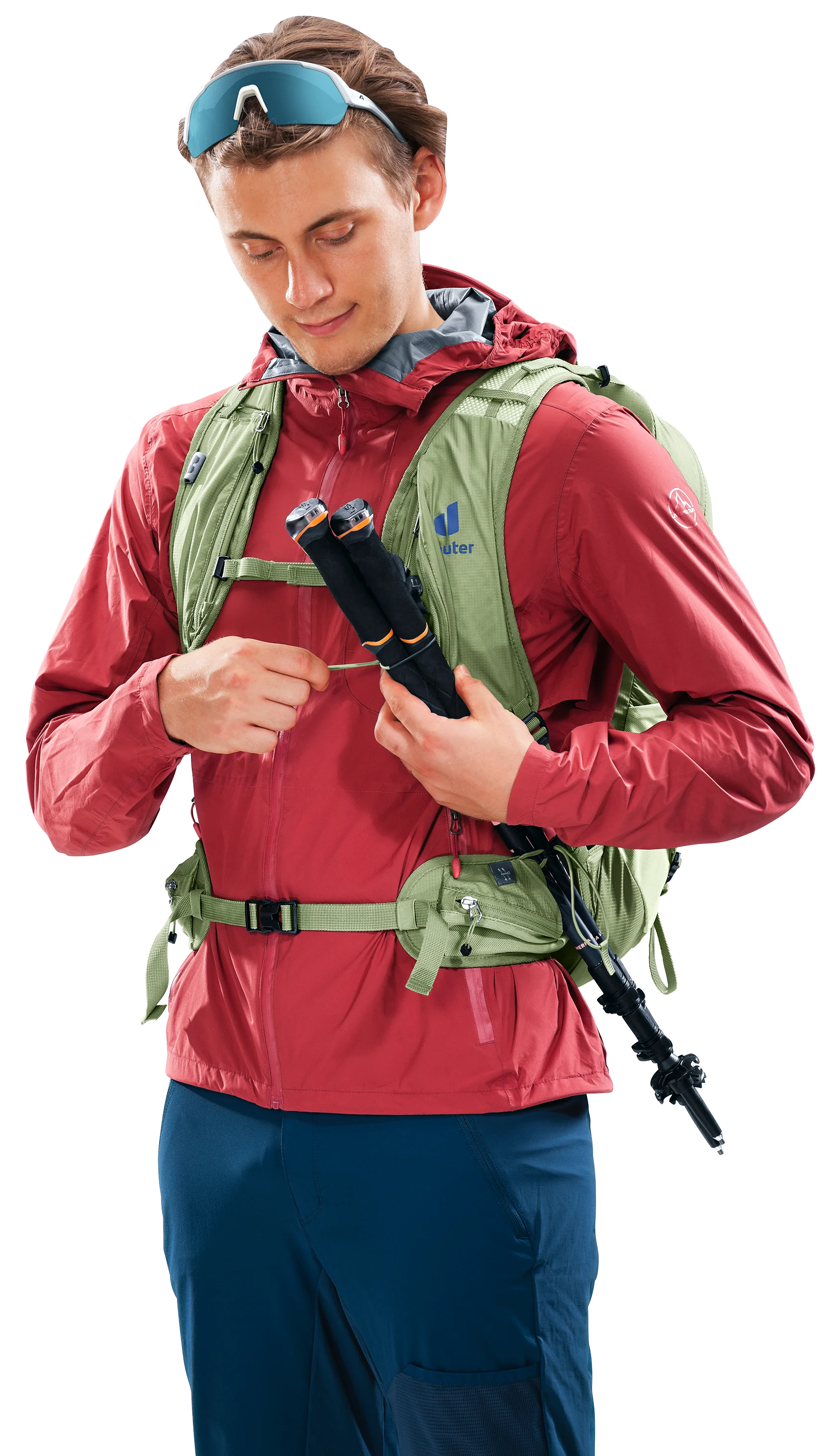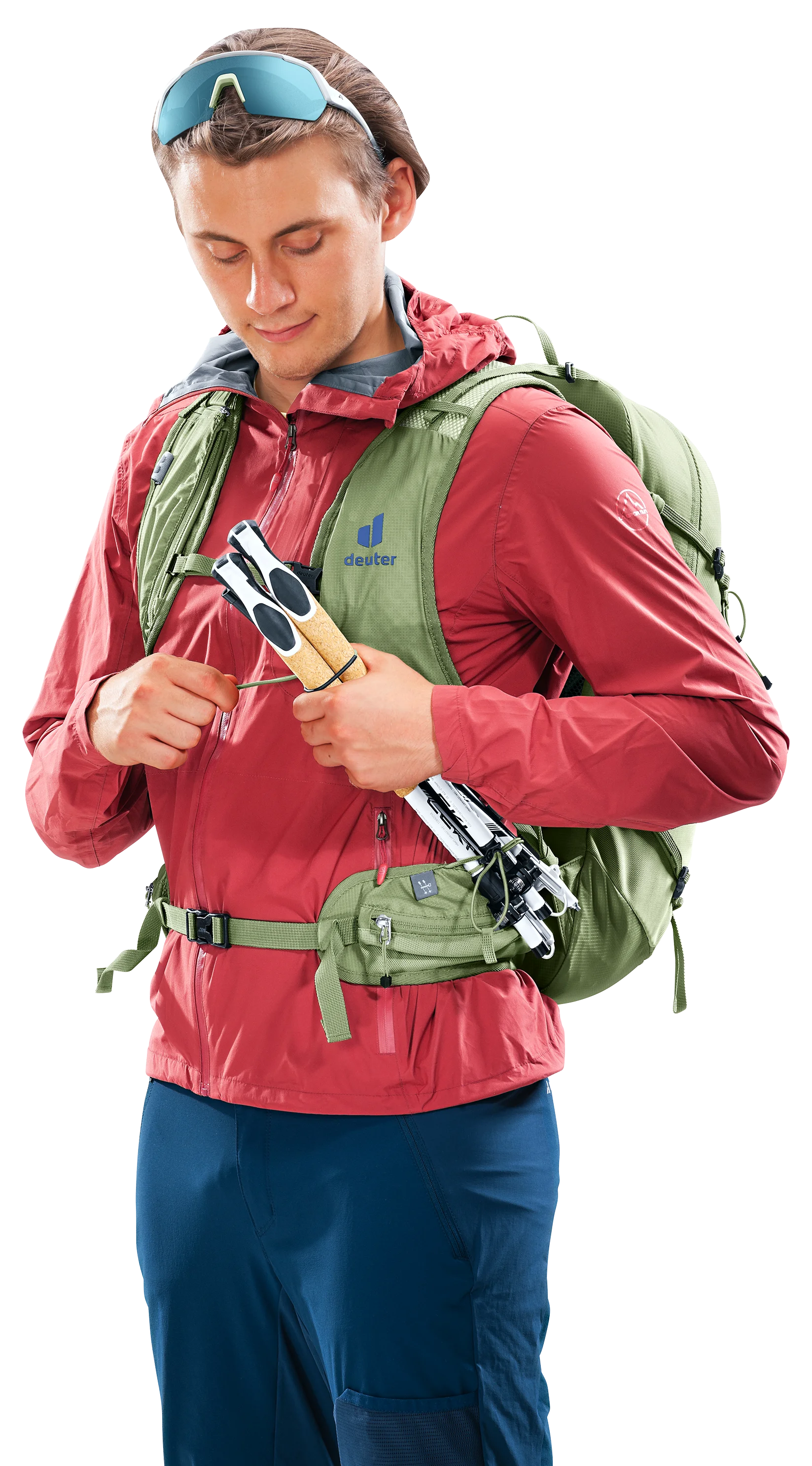 Move fast & light through the mountains – as well as comfortably – with this featherweight speed hiking backpack. Its vest-style perforated shoulder straps, supple hip fins, 2-way adjustable sternum strap and deuter LiteAir back system combine to create good ventilation and a snug, compact fit. Handy pockets on the shoulder straps and hip fins, plus quick-release pole attachments, provide fast on-the-move access without having to take off the pack.