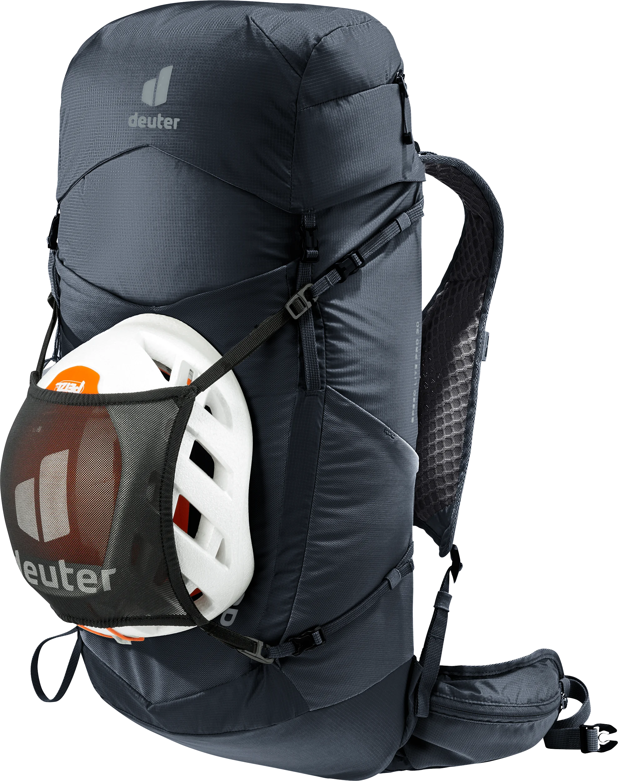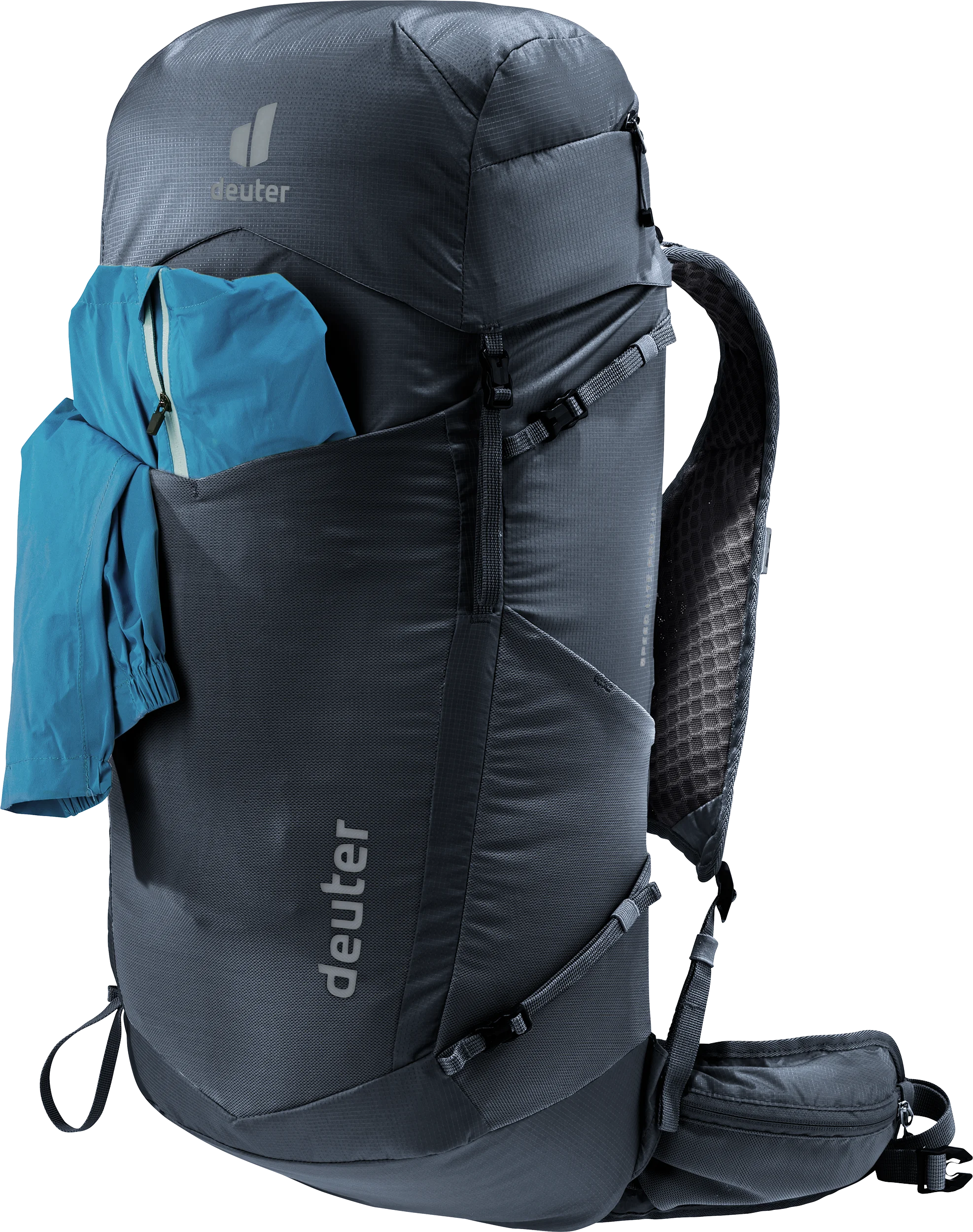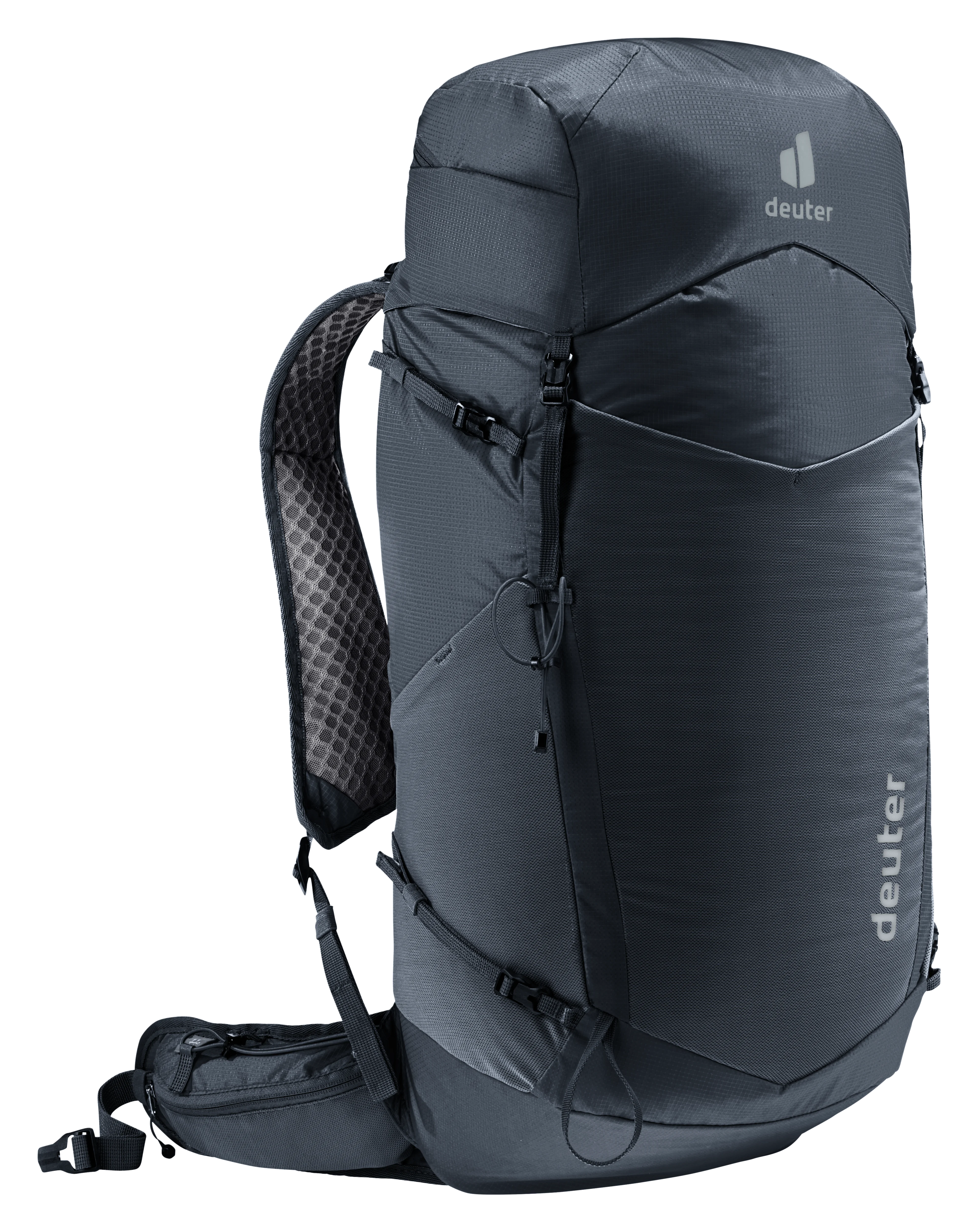 Move fast & light through the mountains – as well as comfortably – with this featherweight speed hiking backpack. Its vest-style perforated shoulder straps, supple hip fins, 2-way adjustable sternum strap and deuter LiteAir back system combine to create good ventilation and a snug, compact fit. Handy pockets on the shoulder straps and hip fins, a spacious lid compartment plus quick-release pole attachments, provide fast on-the-move access without having to take off the pack.