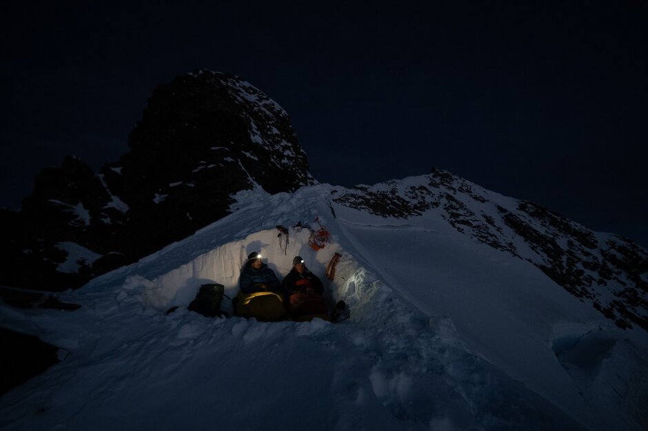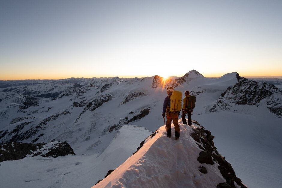 Der Piz Bernina hat drei Gipfel. Wer den Hauptgipfel besteigen möchte, kann dies von zwei Seiten tun. Über den Nordgipfel, den Piz Bianco (3.995 m), mit dem berüchtigten Biancograt – dem wohl schönsten Eisgrat der Alpen. Oder über den, an der Landesgrenze zu Italien verlaufenden Grat des Südgipfels, die Spalla (4.020 m), der auch als Normalweg bezeichnet wird. Die Überschreitung von Nord nach Süd gehört zu den Hochtouren-Klassikern und lockt versierte Bergsteiger aus aller Welt, wie Fabian Buhl und Michael Bückers.