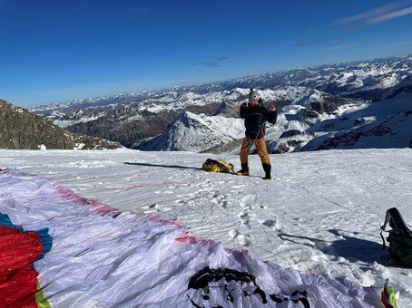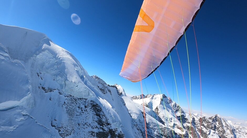 Nach einer Nacht unter wunderschönem Sternenhimmel im Schlafsack stehen die beiden noch vor Sonnenaufgang auf. Der Astro Pro hat gehalten was er verspricht: beide Bergsteiger haben nicht gefroren und sind ausgeruht und voller Energie. Michi strahlt. Die monatelange Tüftelei hat sich ausgezahlt. Ein einfaches Frühstück, das auf knapp 4000 Metern so lecker wie ein 5 Sterne Michelin Menü schmeckt, dann packen sie ihre Sachen zusammen. Für die Jahreszeit ist es erstaunlich warm und es herrscht kaum Wind. Die Flugbedingungen scheinen perfekt zu sein. Daher steigen die beiden konzentriert die letzten Meter des Spallagrates hinab in Richtung Marco e Rosa Hütte. Sie wählen ihren Startplatz an der flachen Rippe. Von hier sieht man das lange Tal in dem der Morteratschgletscher hinaus fließt perfekt ein. Es ist der direkte Weg ins Tal. Etwas über 8 km sind es, die sie sich mit dem Gleitschirm sparen wollen. Zu viel Gegenwind darf dabei allerdings auch nicht herrschen, sonst reicht es nicht bis zum Bahnhof in Morteratsch und sie müssten irgendwo an den Ausläufen des stark zurückgegangenen Morteratsch Gletschers landen.