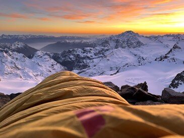 Bestens präpariert also, schlagen die beiden ihren Biwakplatz im unteren Teil des Spallagrates auf. Michi hat Arbeit mitgebracht. Er und Fabi wollen die neueste Version des Astro Pro, einem Daunenschlafsack, der speziell für Bergsteiger und alpine Anforderungen entwickelt wurde, auf Herz und Nieren testen. Michi arbeitet bei dem Rucksack- und Schlafsack-Hersteller deuter im Bereich Entwicklung alpiner Produkte und Sport Marketing. So ganz kann er zwischen Arbeit und Freizeit nicht trennen. Will er auch nicht, denn er vereint einfach seine Leidenschaft und seinen Beruf. Und so genießen die beiden warm verpackt in ihren Schlafsäcken den leuchtend roten Himmel. In der Ferne meinen sie den Gran Paradiso zu erkennen. Was für eine Fernsicht, was für ein Schlafplatz.