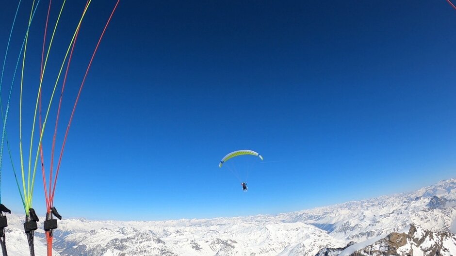 Der Start funktioniert reibungslos und sie gleiten gemeinsam durch die einsame Winterwelt. Vorbei an Piz Bernina und Morteratsch auf der einen und dem Piz Palü auf der anderen Seite. Wäre der Gipfel des Piz Bernina nicht schon ein Highlight für sich, man könnte denken es könnte nicht besser werden. Doch frei wie ein Vogel diese wunderschöne Gletscherlandschaft, die majestätischen Berge und unberührten Flanken von oben zu sehen, über sie hinweg zu schweben und eine neue Relation für das eigene Sein zu erfahren, macht dieses Erlebnis magisch.