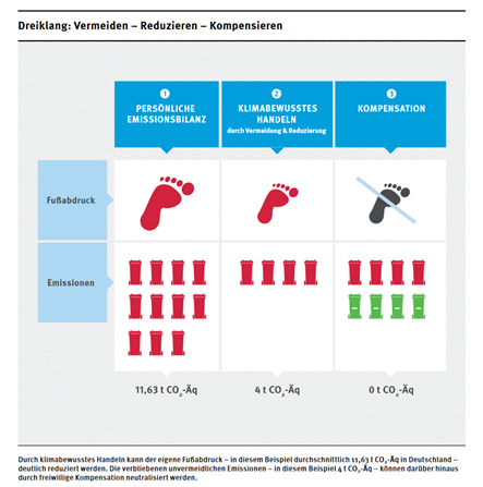 Die jeweiligen CO2-Fußabdrücke gilt es zu kompensieren. Das Prinzip der Kompensation beruht auf dem Gedanken, dass es für das Klima nicht entscheidend ist, an welcher Stelle Treibhausgase ausgestoßen oder vermieden werden. Daher lassen sich an einer Stelle verursachte Emissionen auch an einer weit entfernten Stelle einsparen.