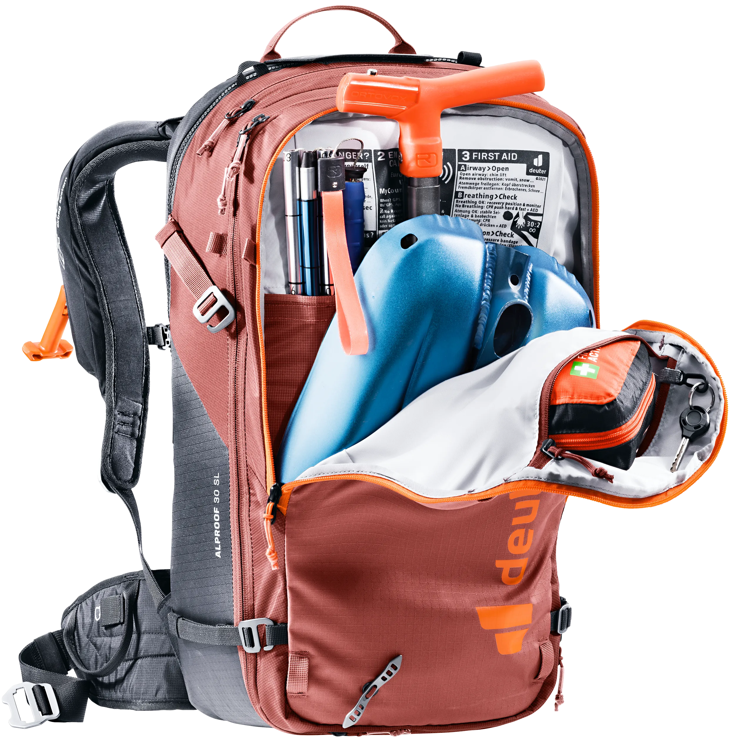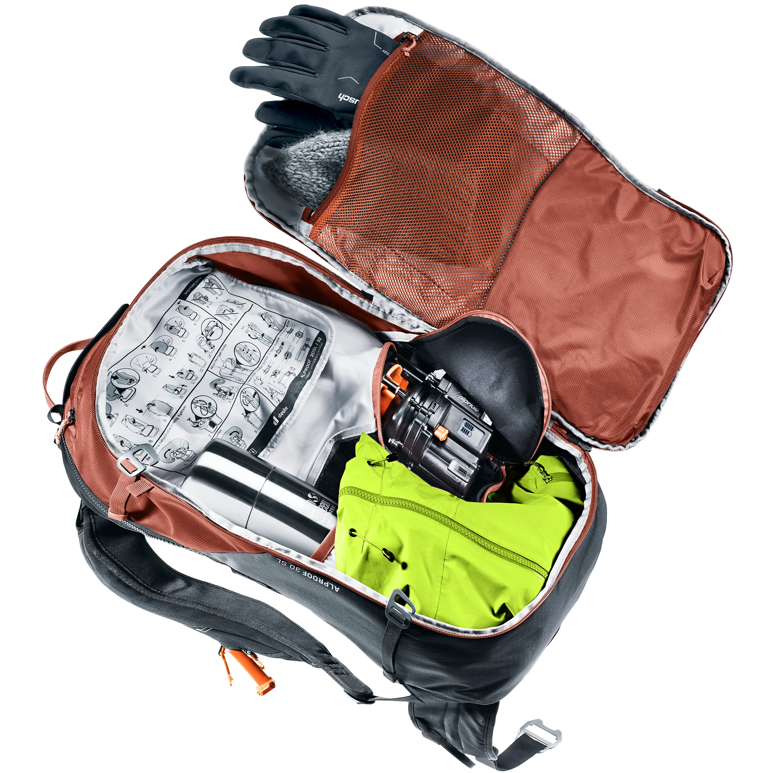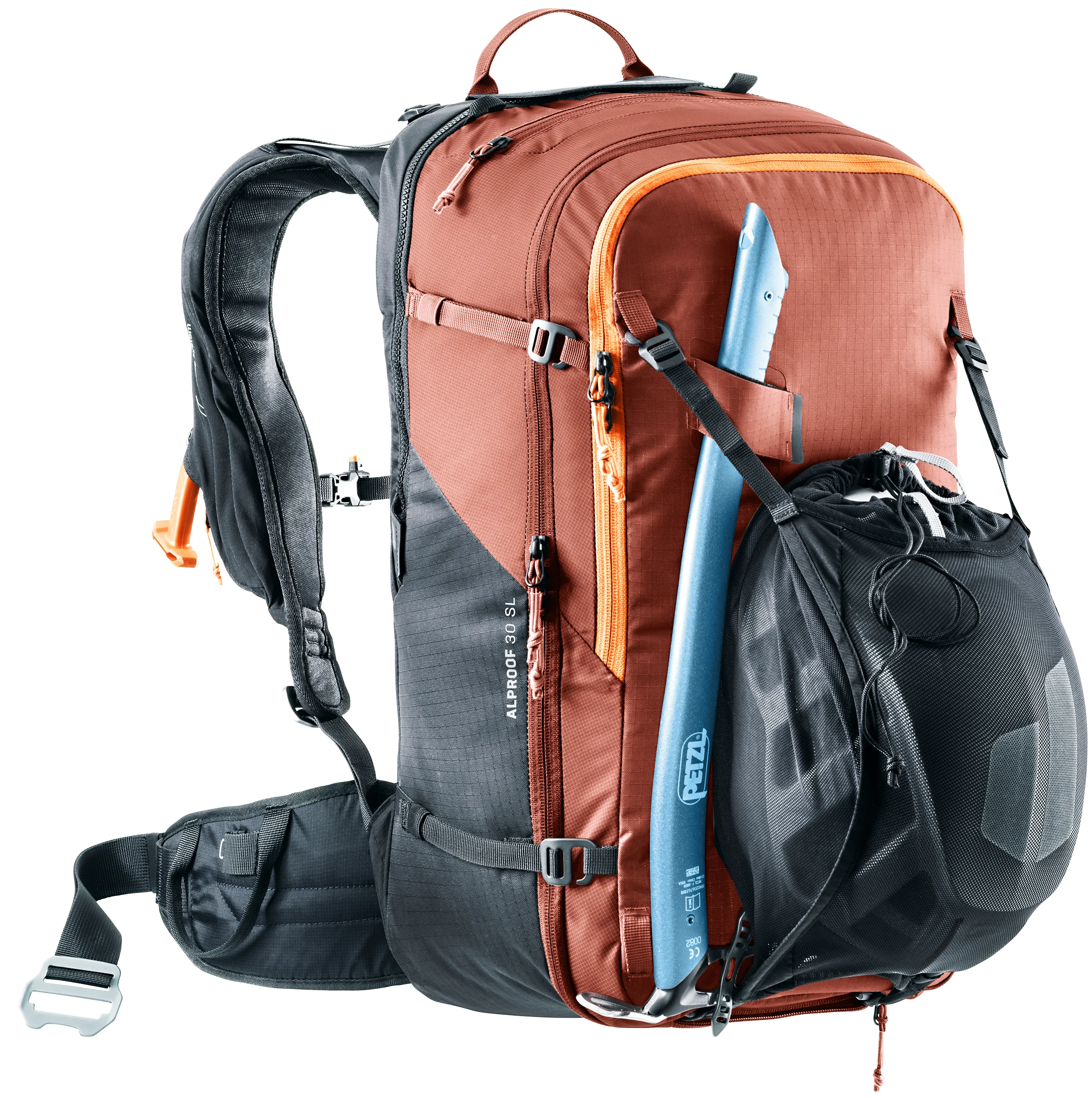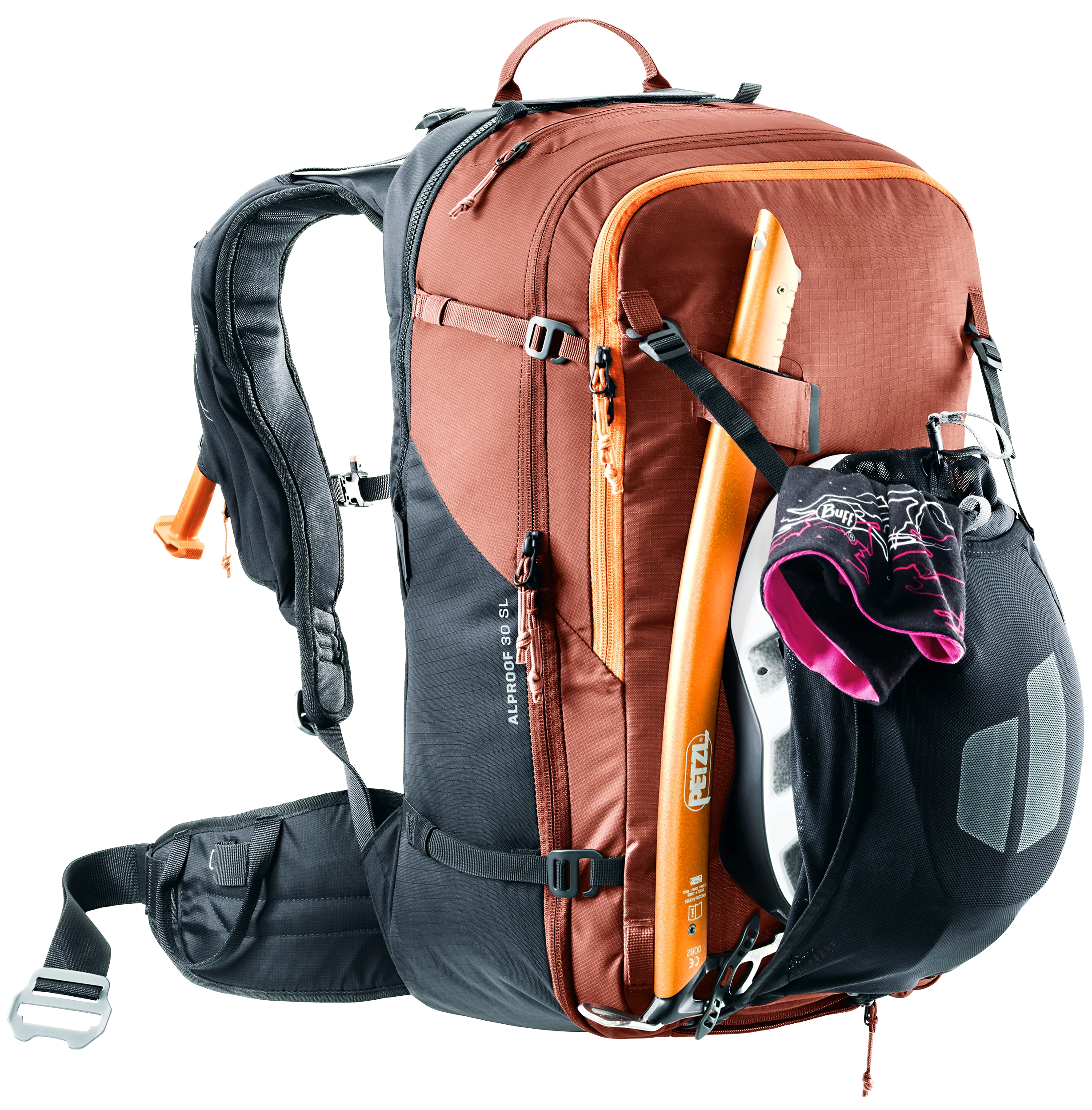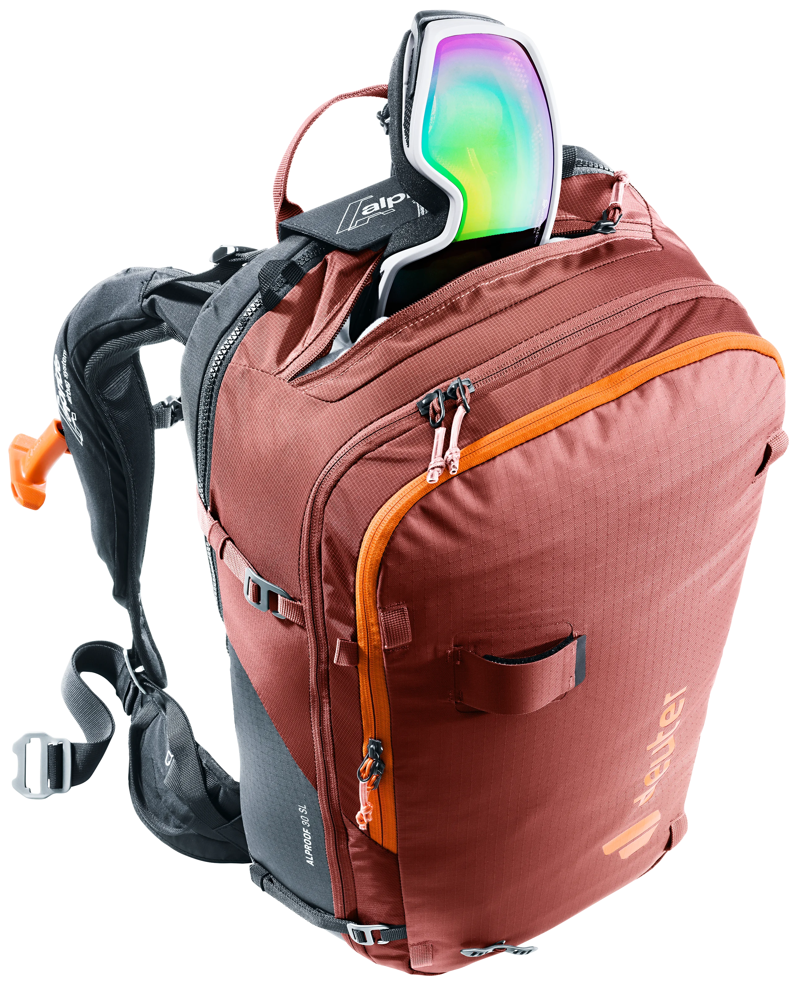 The Alproof SL equipped with Alpride E2 avalanche airbag system and the very latest supercapacitor technology deploys reliably, quickly and at high pressure, even in freezing cold temperatures. With multiple deployments possible, easy handling, and a quick-access avalanche equipment compartment, plus women-specific SL carry comfort and a snug fit with zero load wobble, the result is a controlled backcountry ride every time. A leg safety strap prevents the pack from being ripped off in an avalanche, while a helmet bag, gear straps and gear loops make this TÜV-inspected avalanche airbag backpack a serious mountaineering pack too.