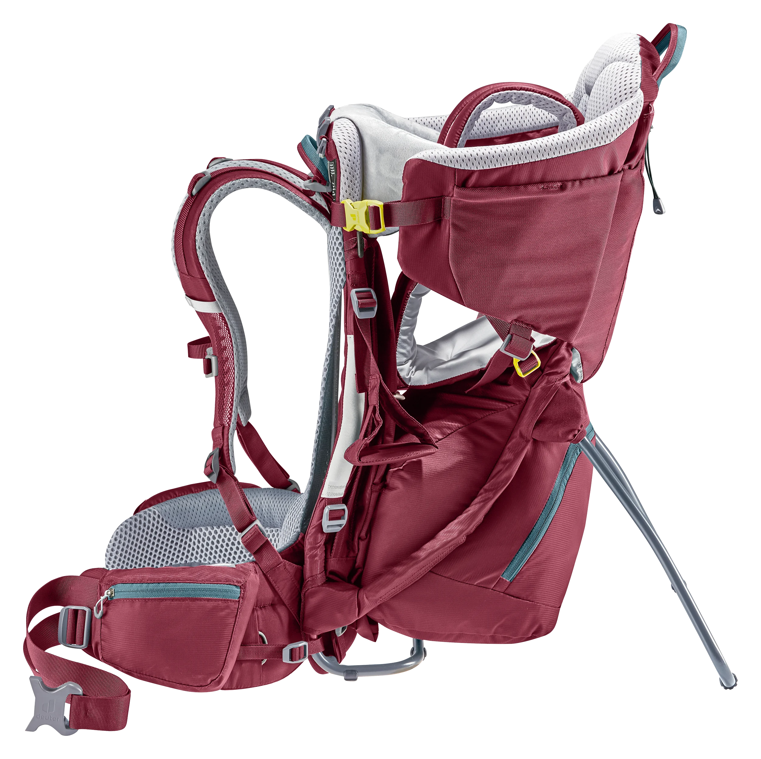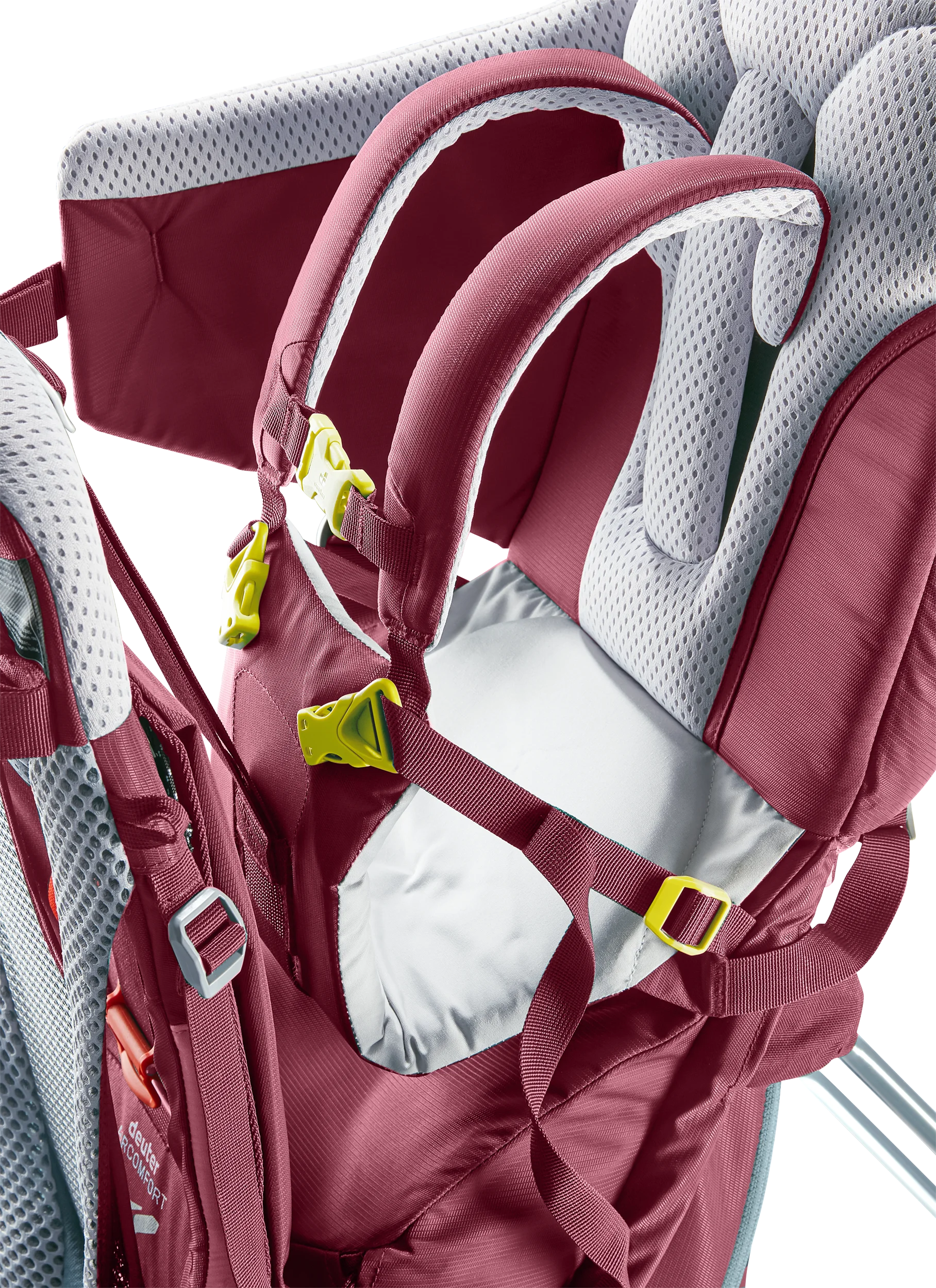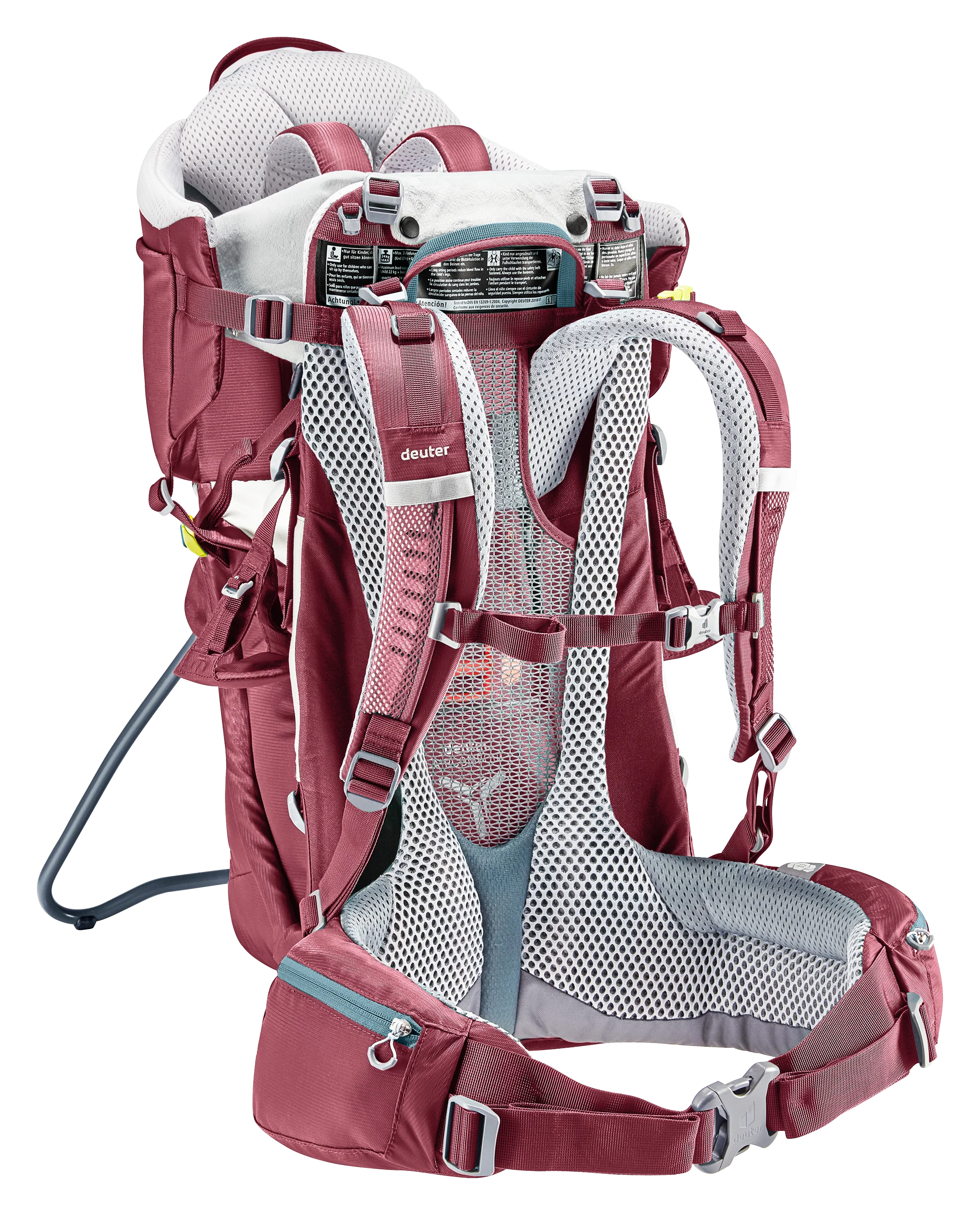 The ingenious, new Aircomfort Sensic Vario mesh backrest system makes mountain adventures all the more pleasant for families: The load is transferred perfectly, the child carrier fits snuggly while the back is fully ventilated. The child is afforded great comfort: The large, soft pillow gently braces the tired child‘s head even in the corners and supports a relaxing nap. The side access and the easy-to-access belt system of the child frame ensure safety – guaranteed by the TÜV GS safety seal of approval.