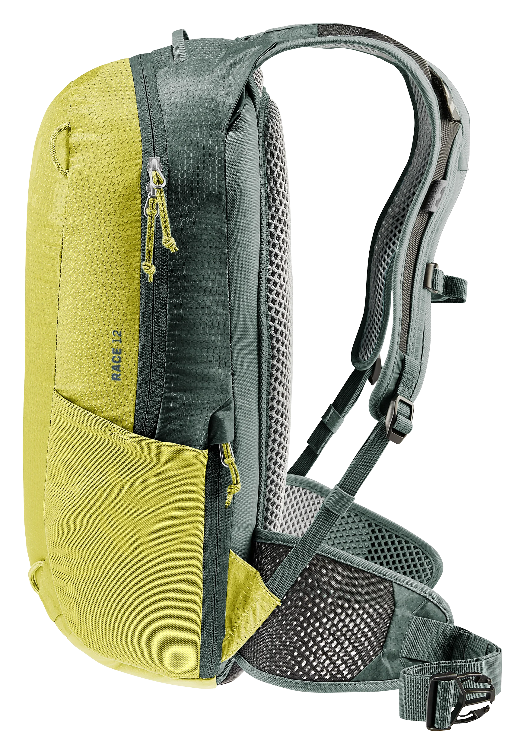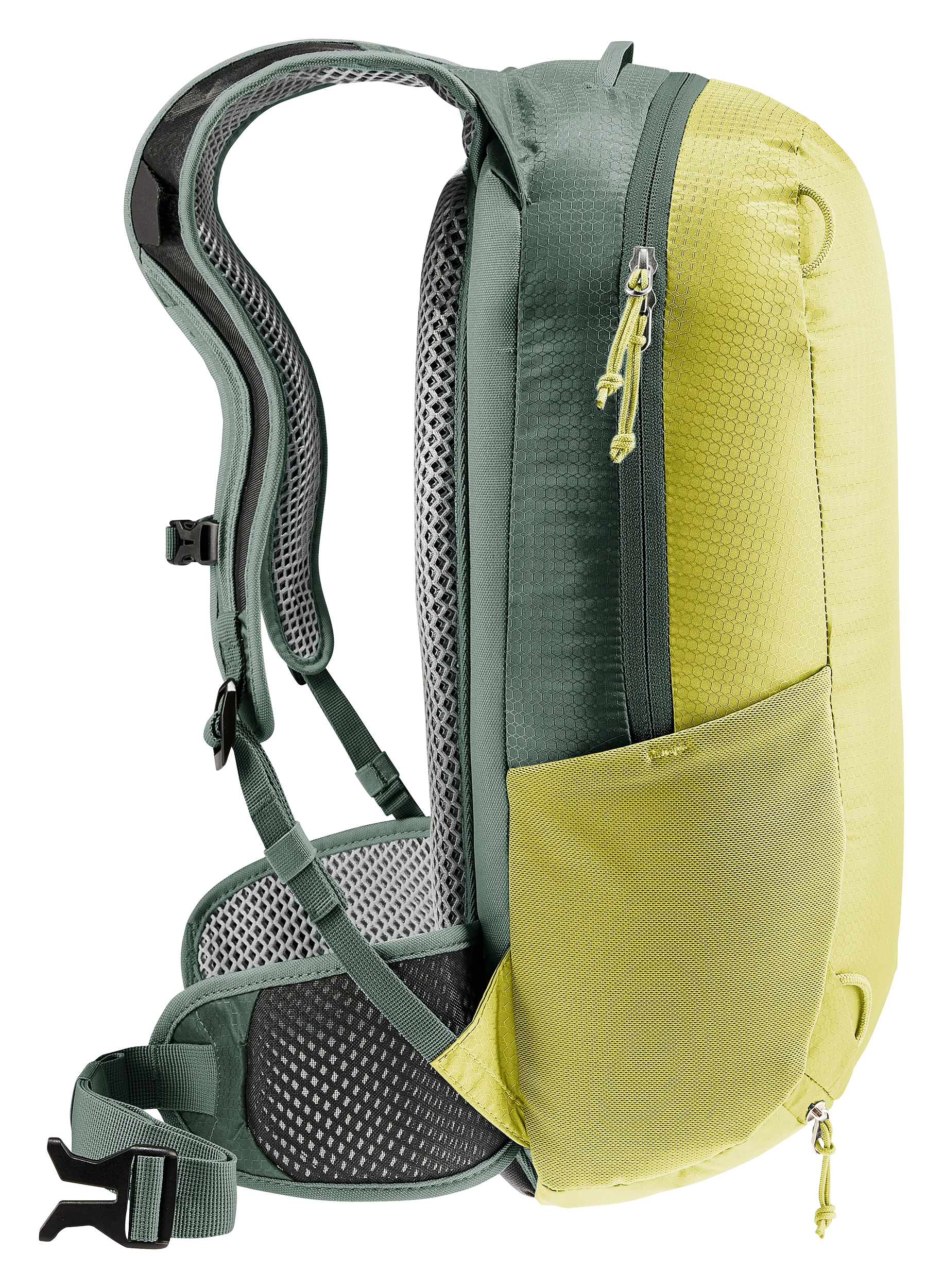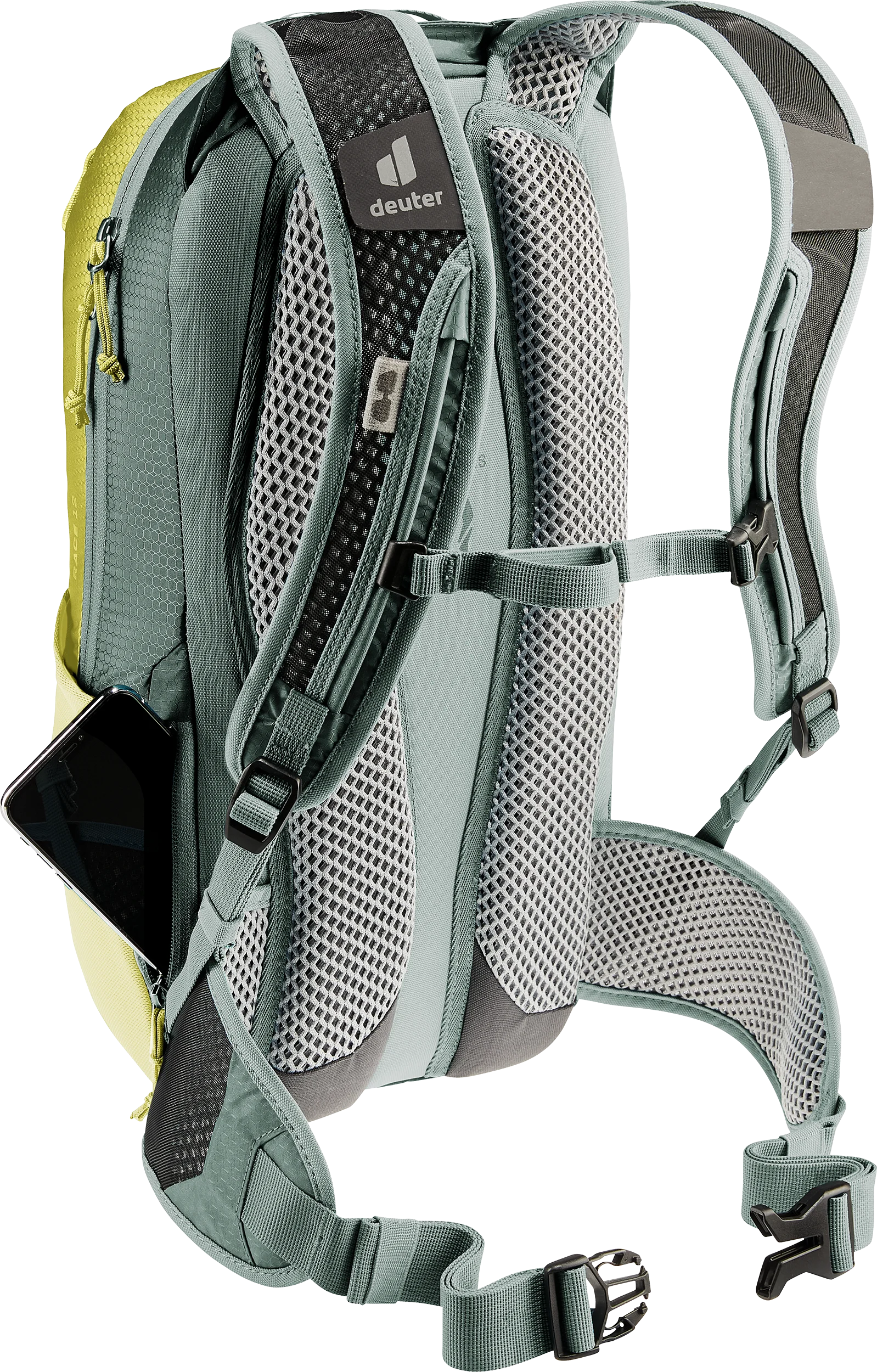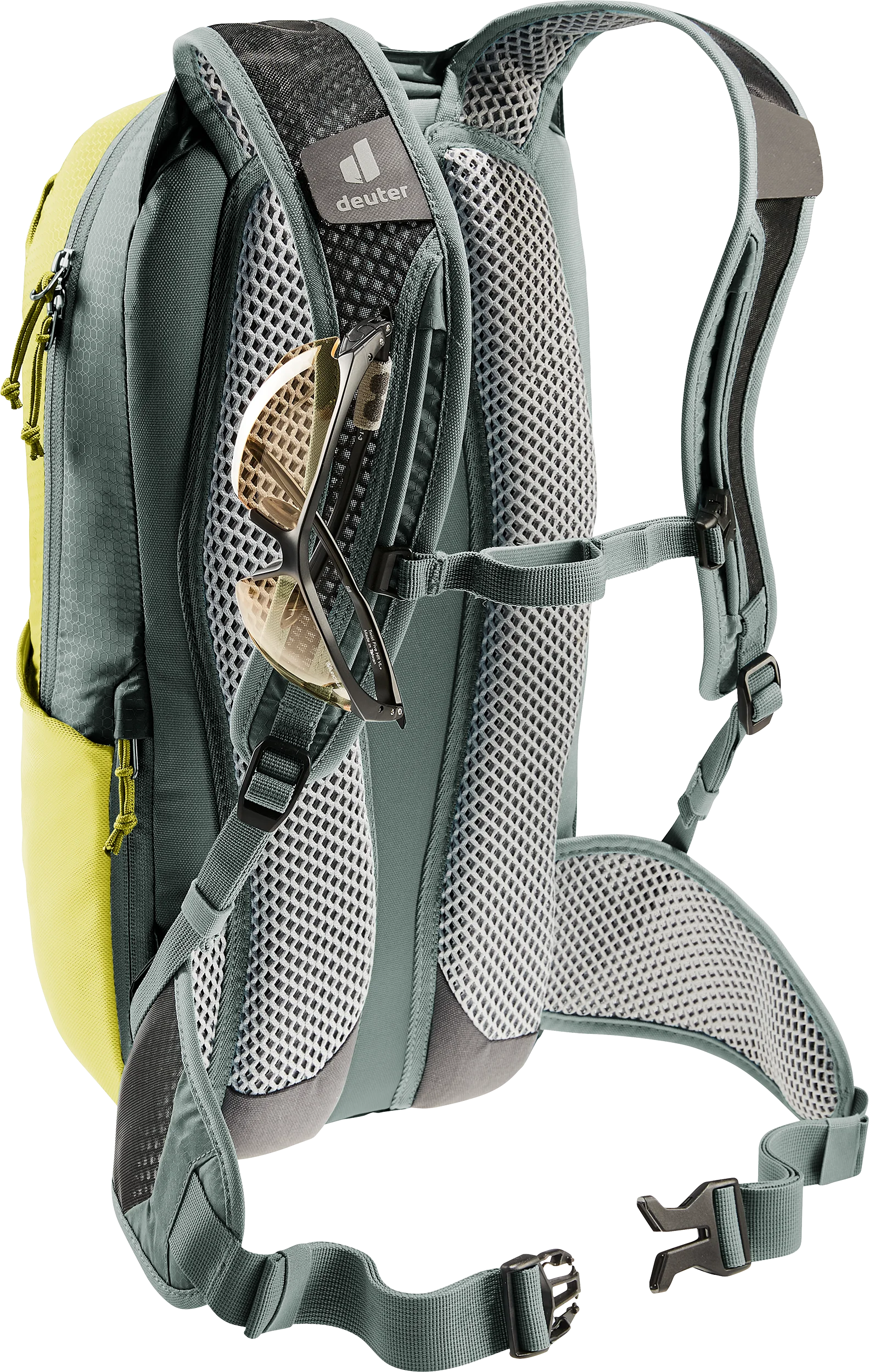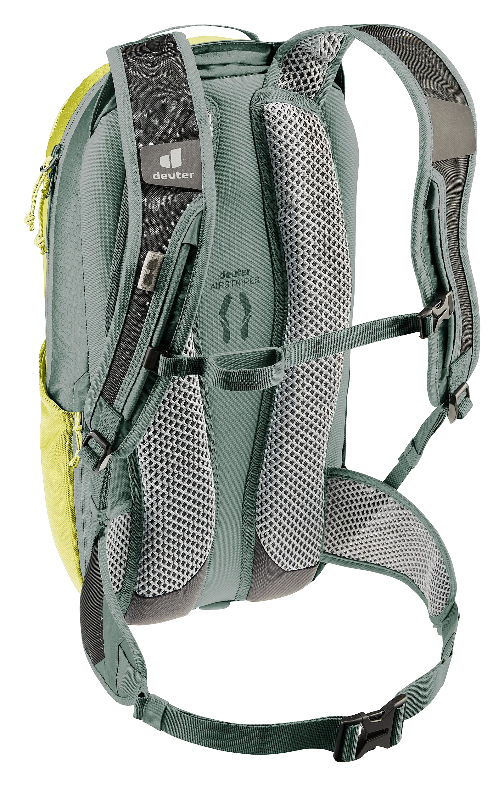 This pared down bike backpack with good weight-to-comfort ratio benefits from the breathable deuter Airstripes back system. Providing athletic mountain bikers with good airflow across the back and a snug fit for technical trails. A sternum strap and mesh hip fins give the pack additional stability. With bluesign® approved body fabric made of 100% recycled materials, and components made using environmentally friendly, resource-efficient manufacturing practices, the Race meets the highest environmental standards and is climate neutral, and PFAS free.