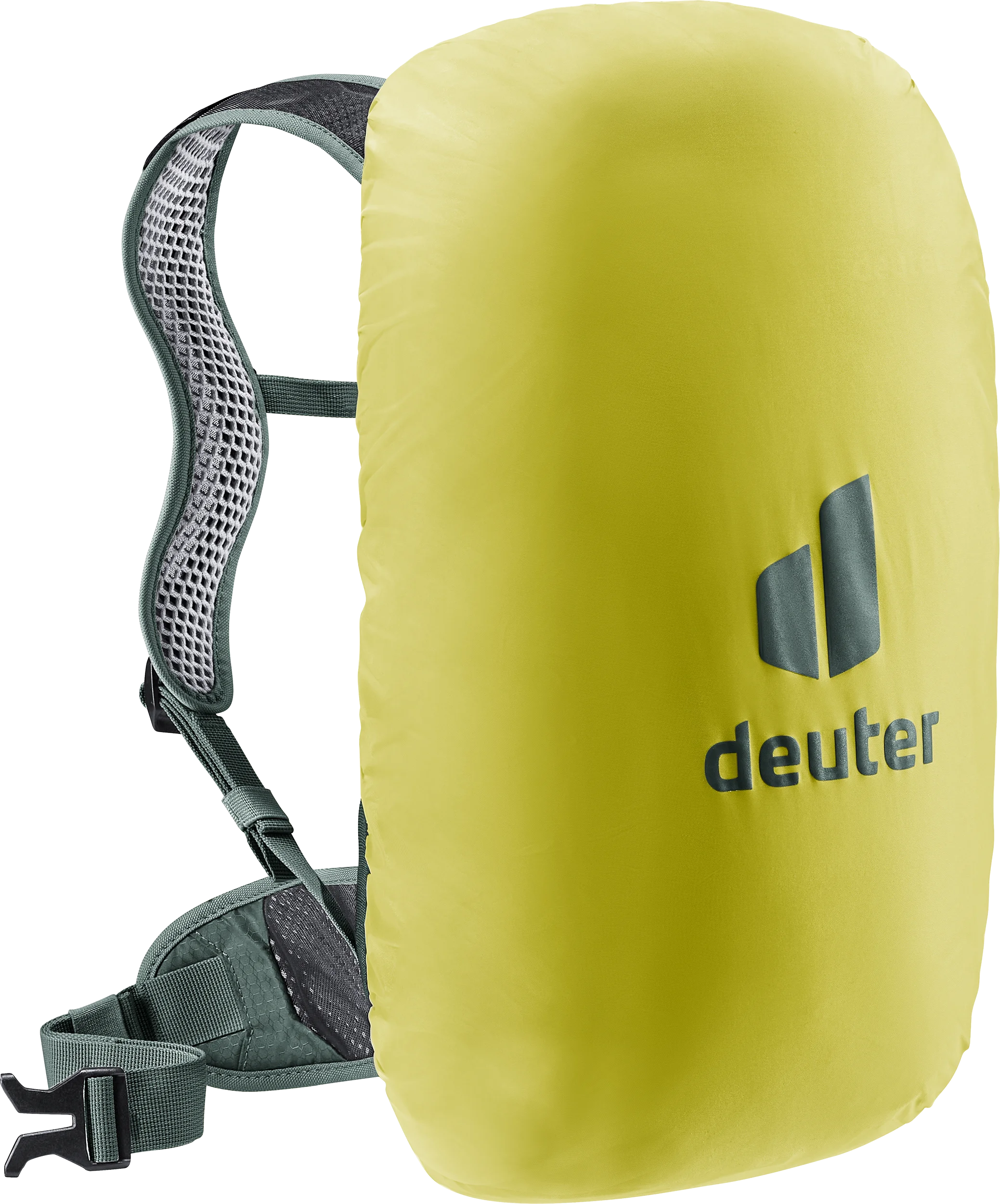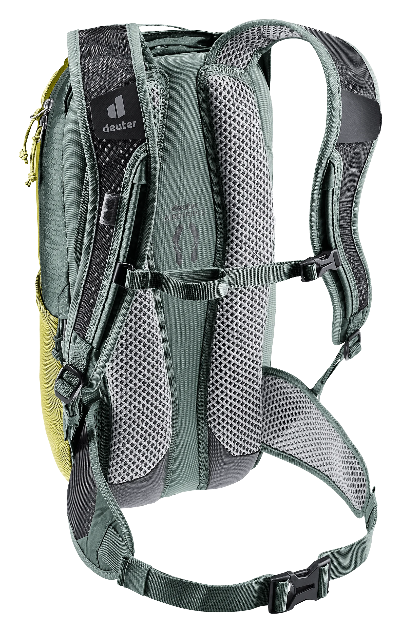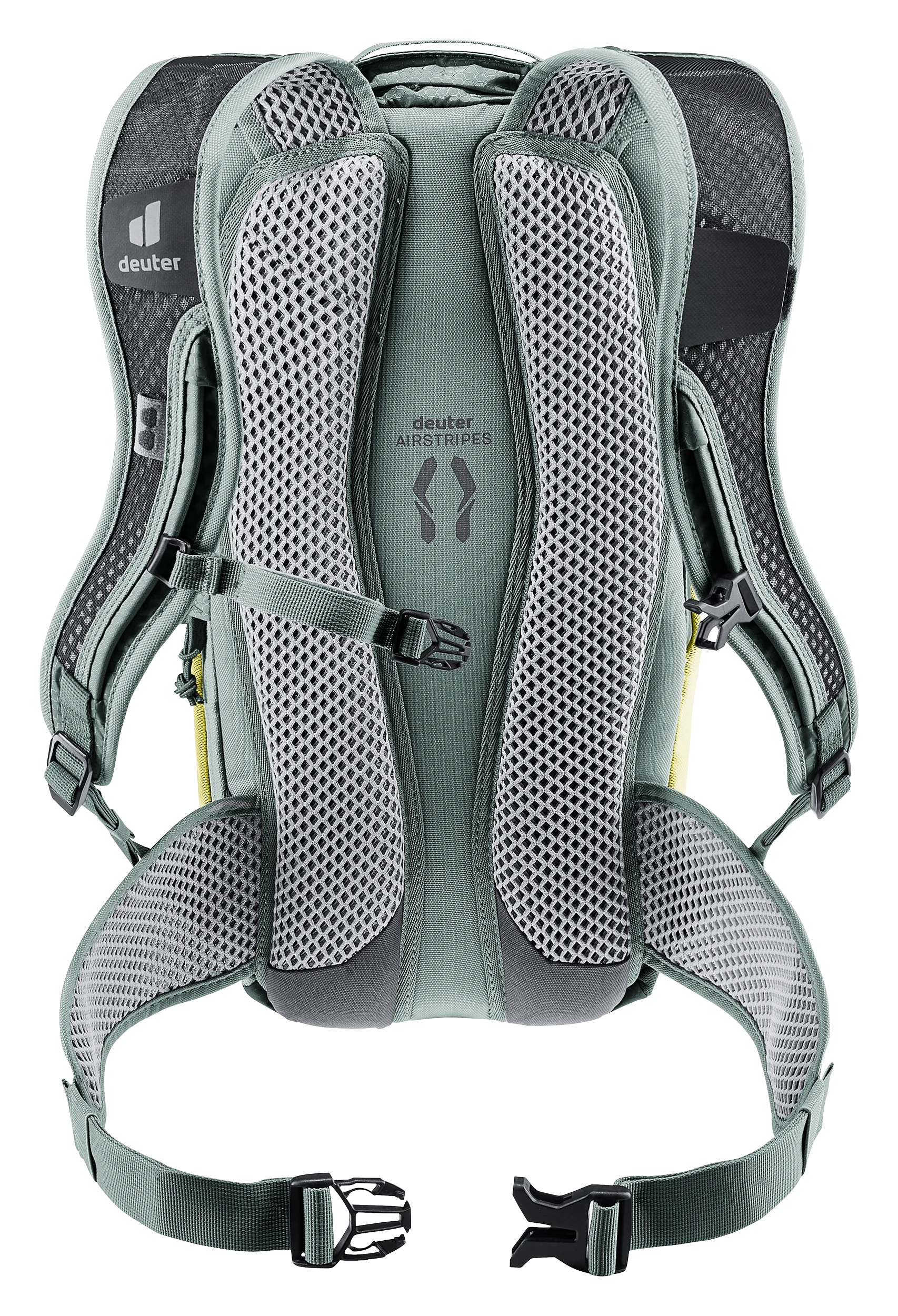 This pared down bike backpack with good weight-to-comfort ratio benefits from the breathable deuter Airstripes back system. Providing athletic mountain bikers with good airflow across the back and a snug fit for technical trails. A sternum strap and mesh hip fins give the pack additional stability. With bluesign® approved body fabric made of 100% recycled materials and components made using environmentally friendly, resource-efficient manufacturing practices, the Race meets the highest environmental standards and is climate neutral, and PFAS free.