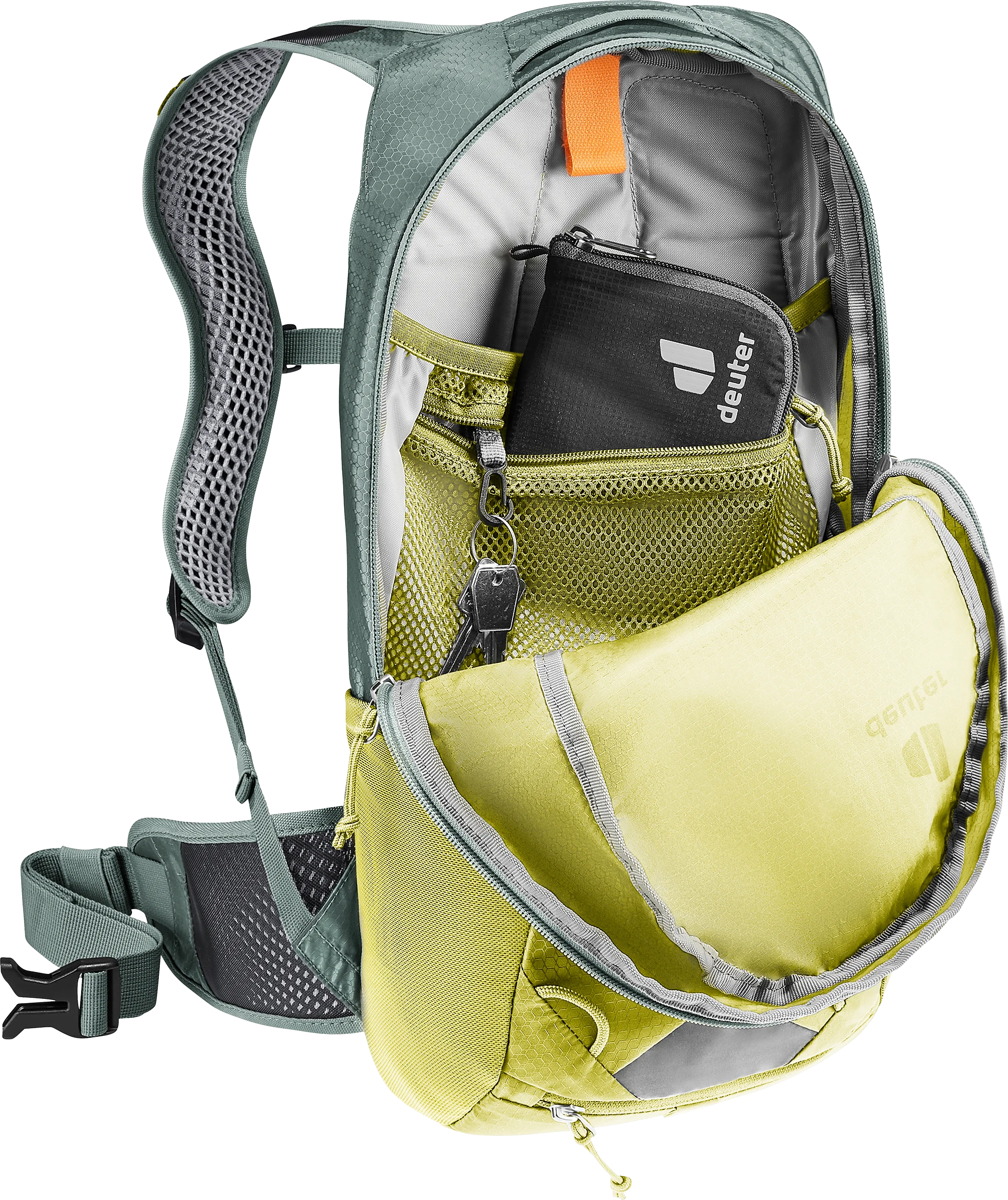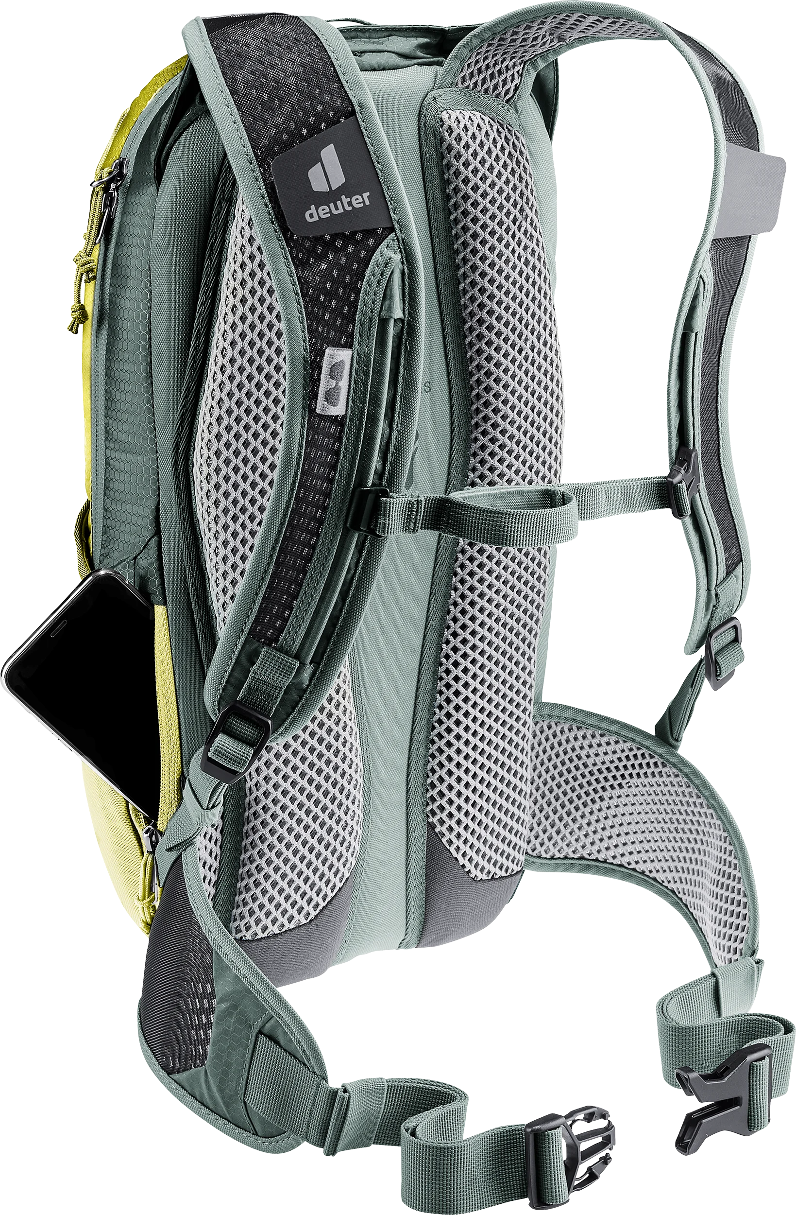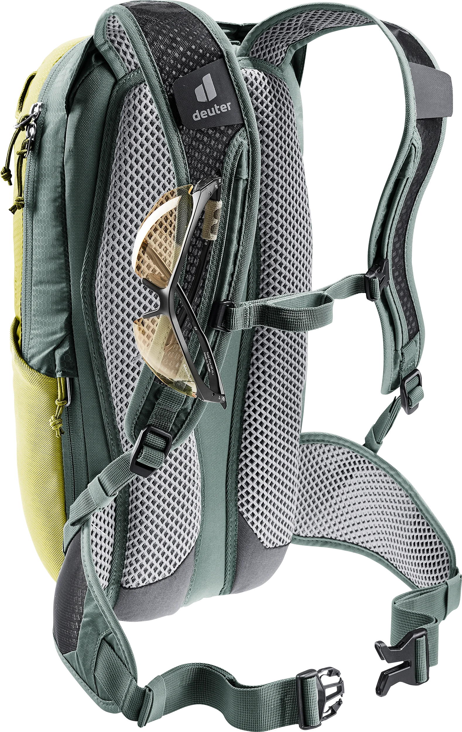 This pared down bike backpack with good weight-to-comfort ratio benefits from the breathable deuter Airstripes back system. Providing athletic mountain bikers with good airflow across the back and a snug fit for technical trails. A sternum strap and mesh hip fins give the pack additional stability. With bluesign® approved body fabric made of 100% recycled materials and components made using environmentally friendly, resource-efficient manufacturing practices, the Race meets the highest environmental standards and is climate neutral, and PFAS free.