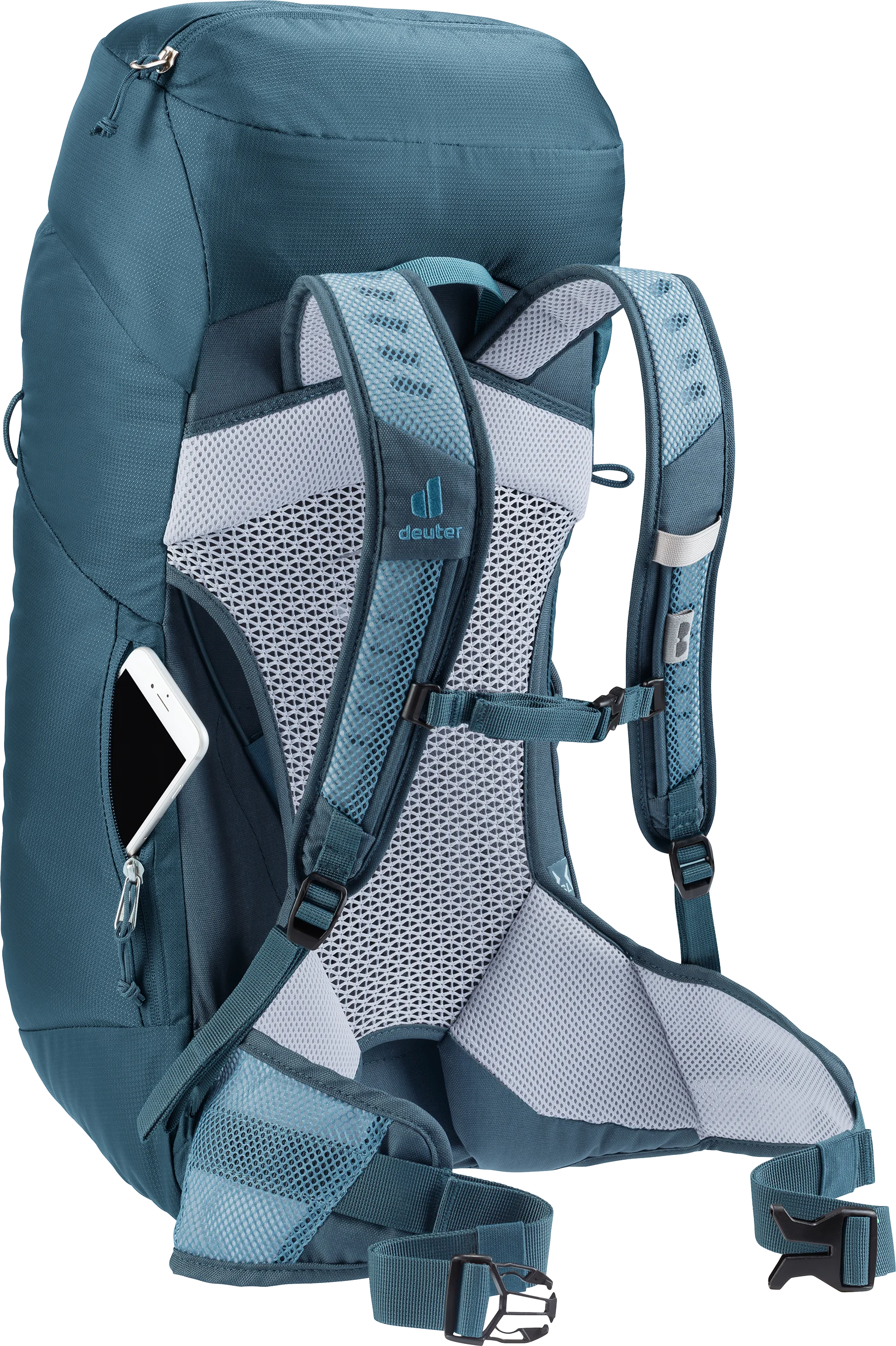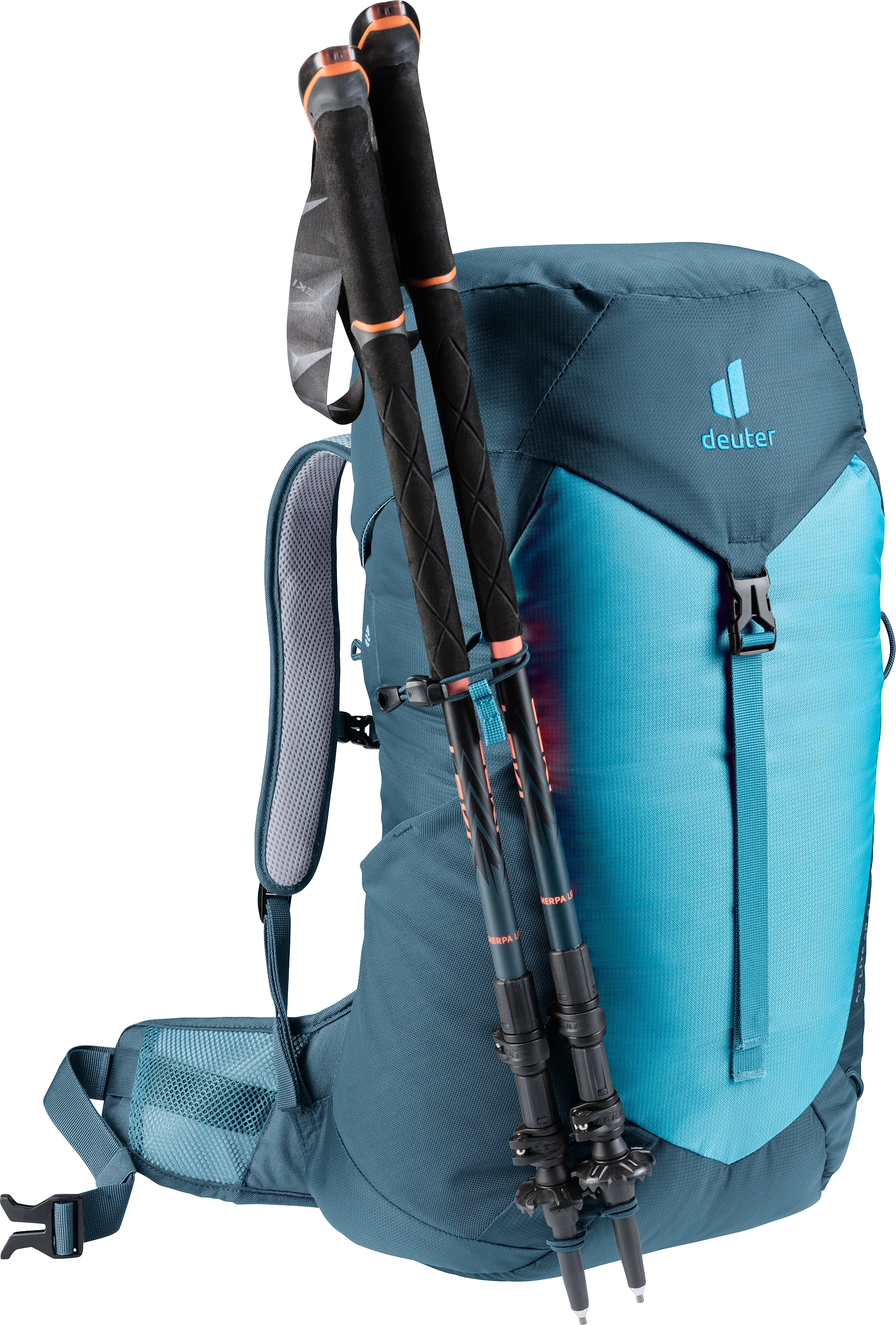 This comfortable day pack features the ultra-light deuter Aircomfort back system with maximum ventilation and offers an excellent comfort-to-weight ratio. It has a spacious main compartment and dedicated cell phone pocket, stretch side pockets, lid compartments and gear loops to strap poles and a range of gear to the outside of the pack. Prepped to accommodate a mesh helmet holder and hydration system (up to 3 L) and comes with a detachable rain cover.