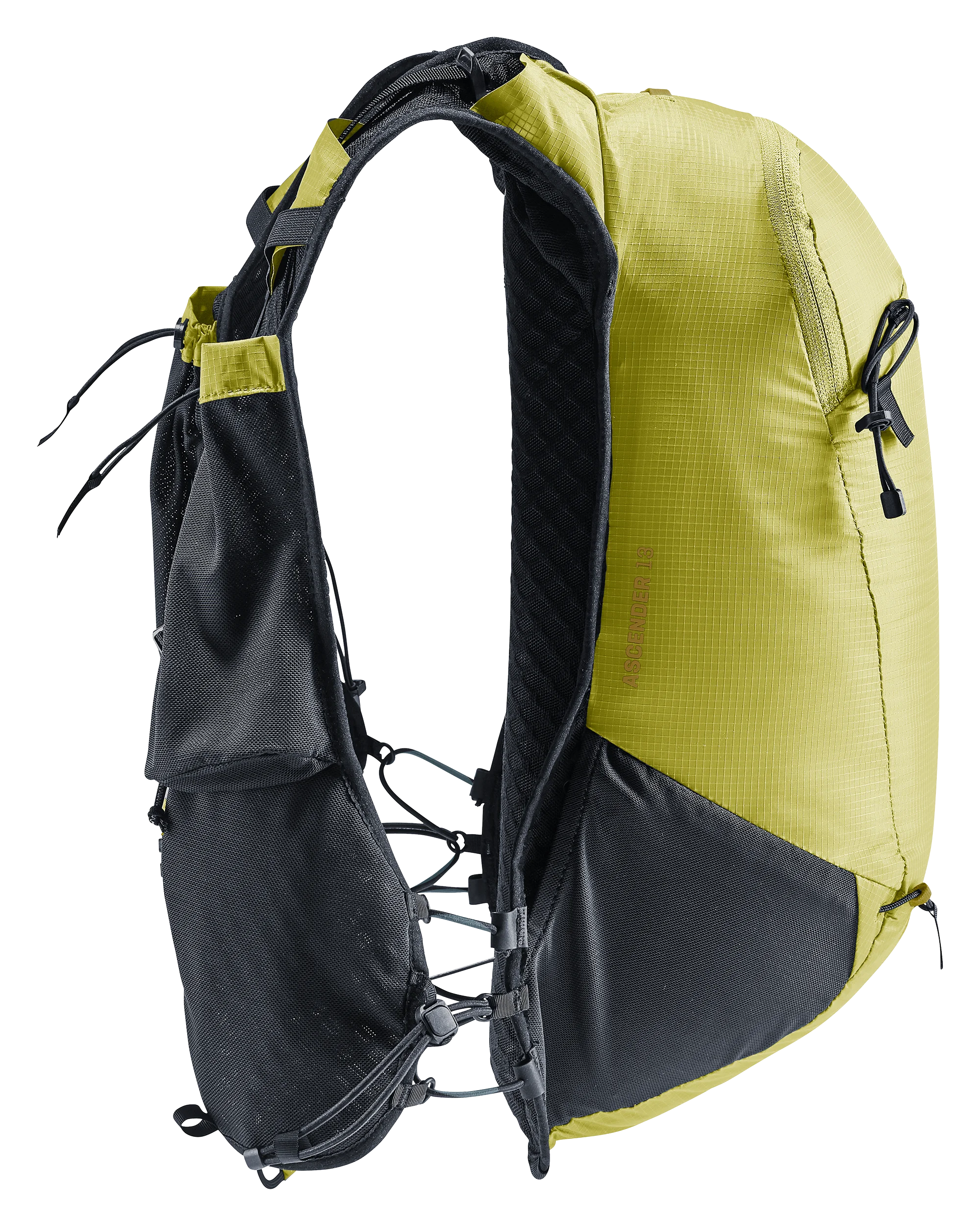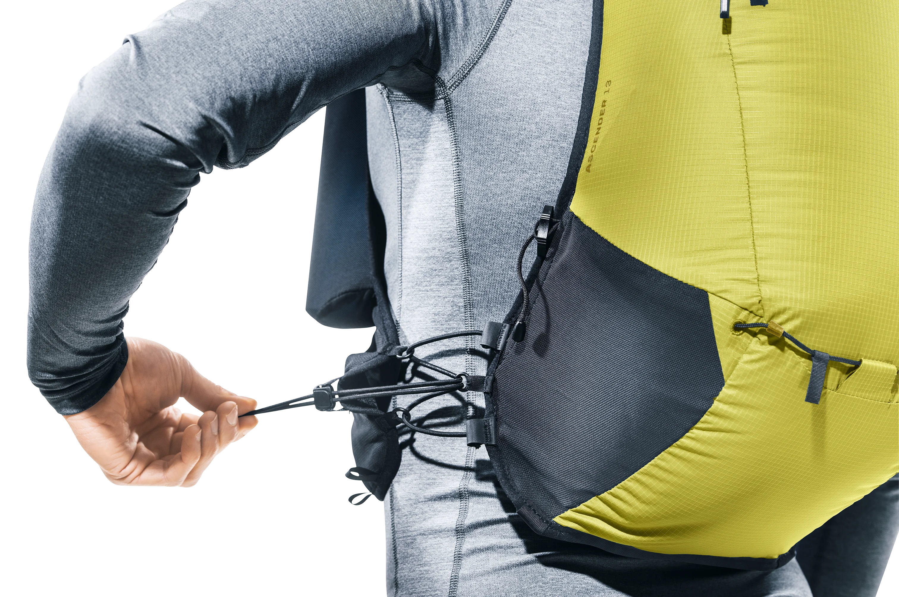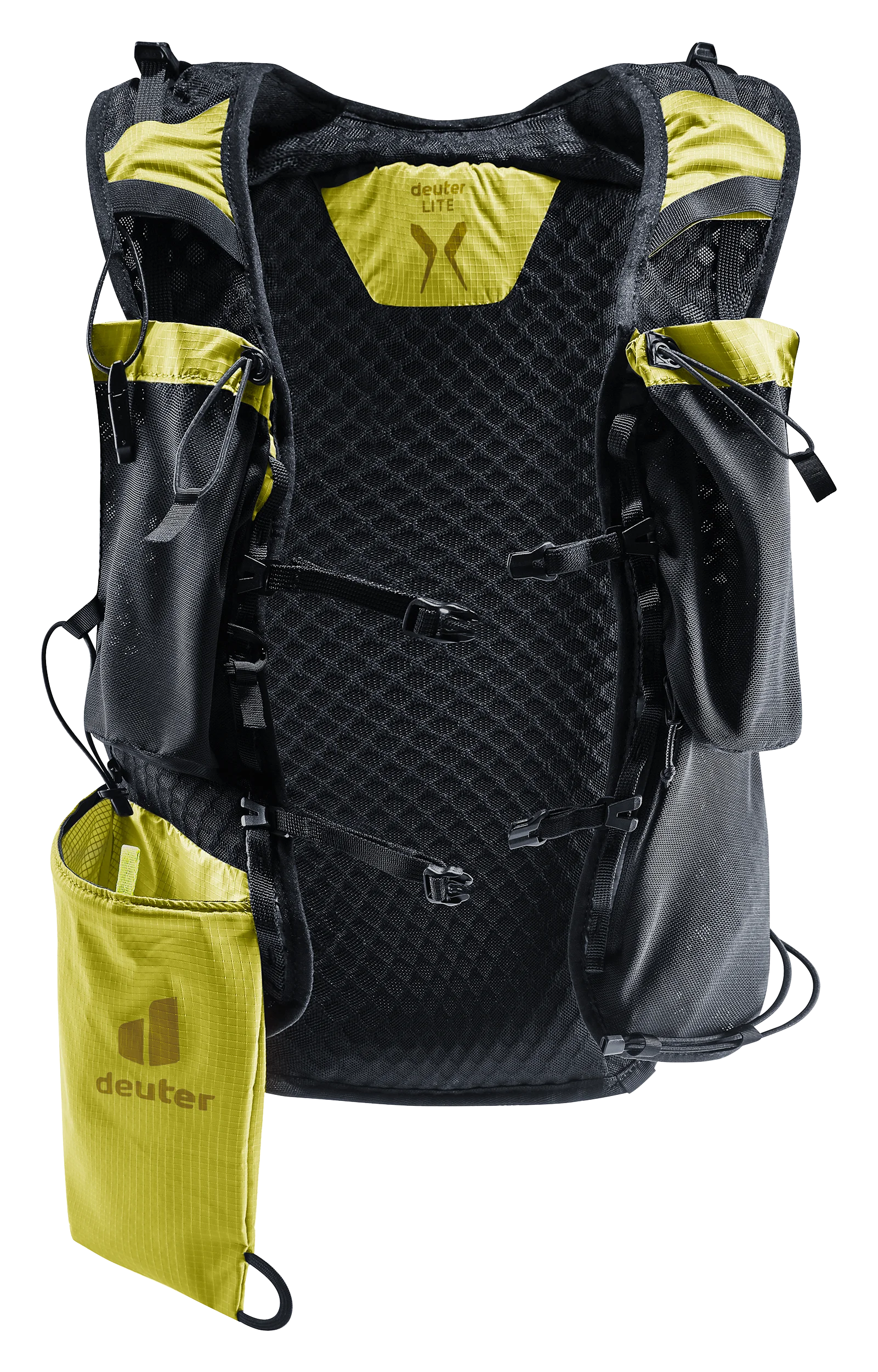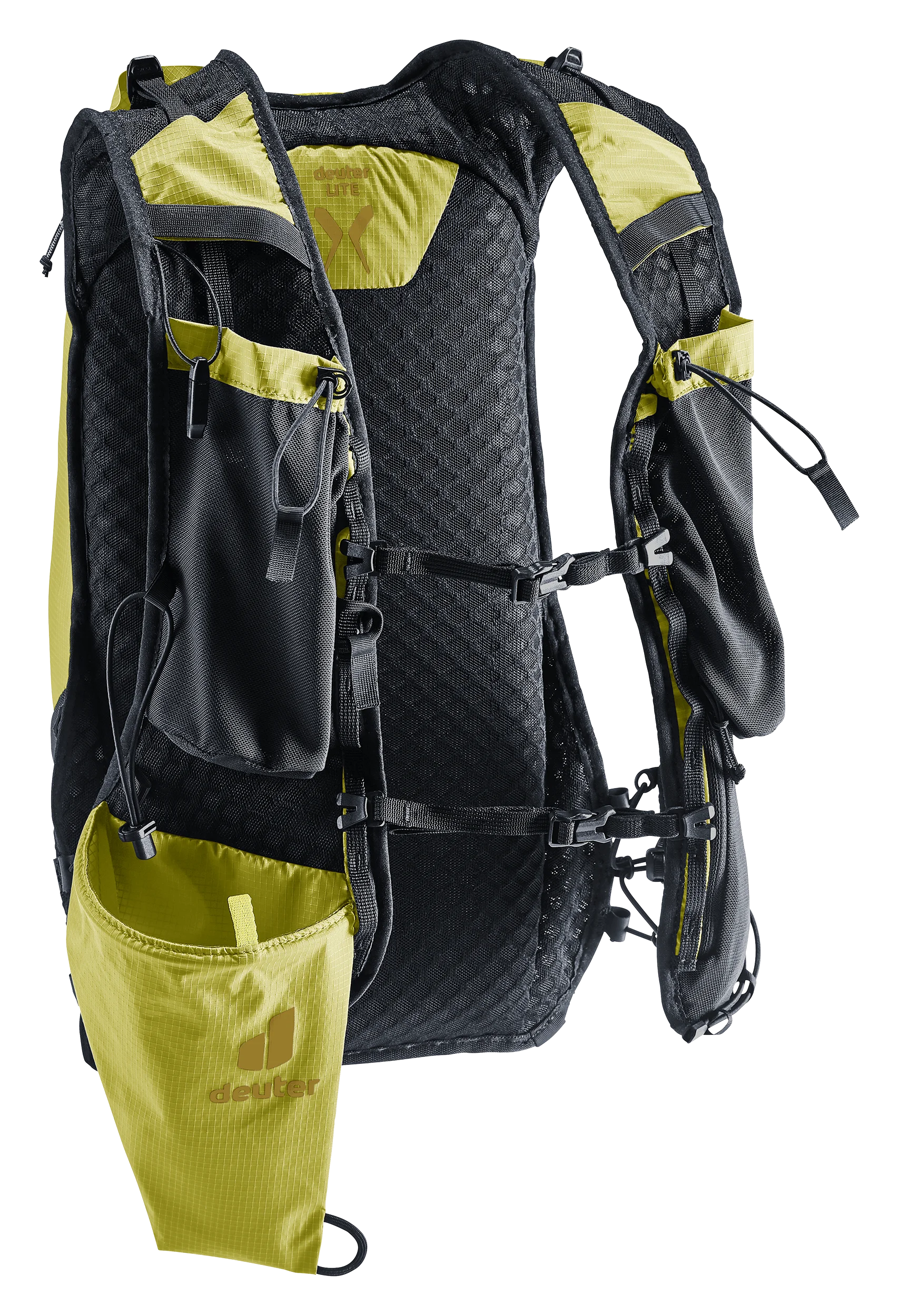 Ultra-lightweight and super comfortable: wide, ergonomic vest-style shoulder straps with elasticated compression system, two adjustable sternum straps and soft material against the back create a garment-like fit. A stretch mesh inner pocket and side compression straps help eliminate load wobble no matter how challenging the terrain. A holster pocket on the front of one shoulder strap makes it quick and easy to access collapsible trekking poles. And there is space for soft flasks and a GPS in the shoulder strap pockets. The body fabric is made from 100% recycled materials and is bluesign® certified.
