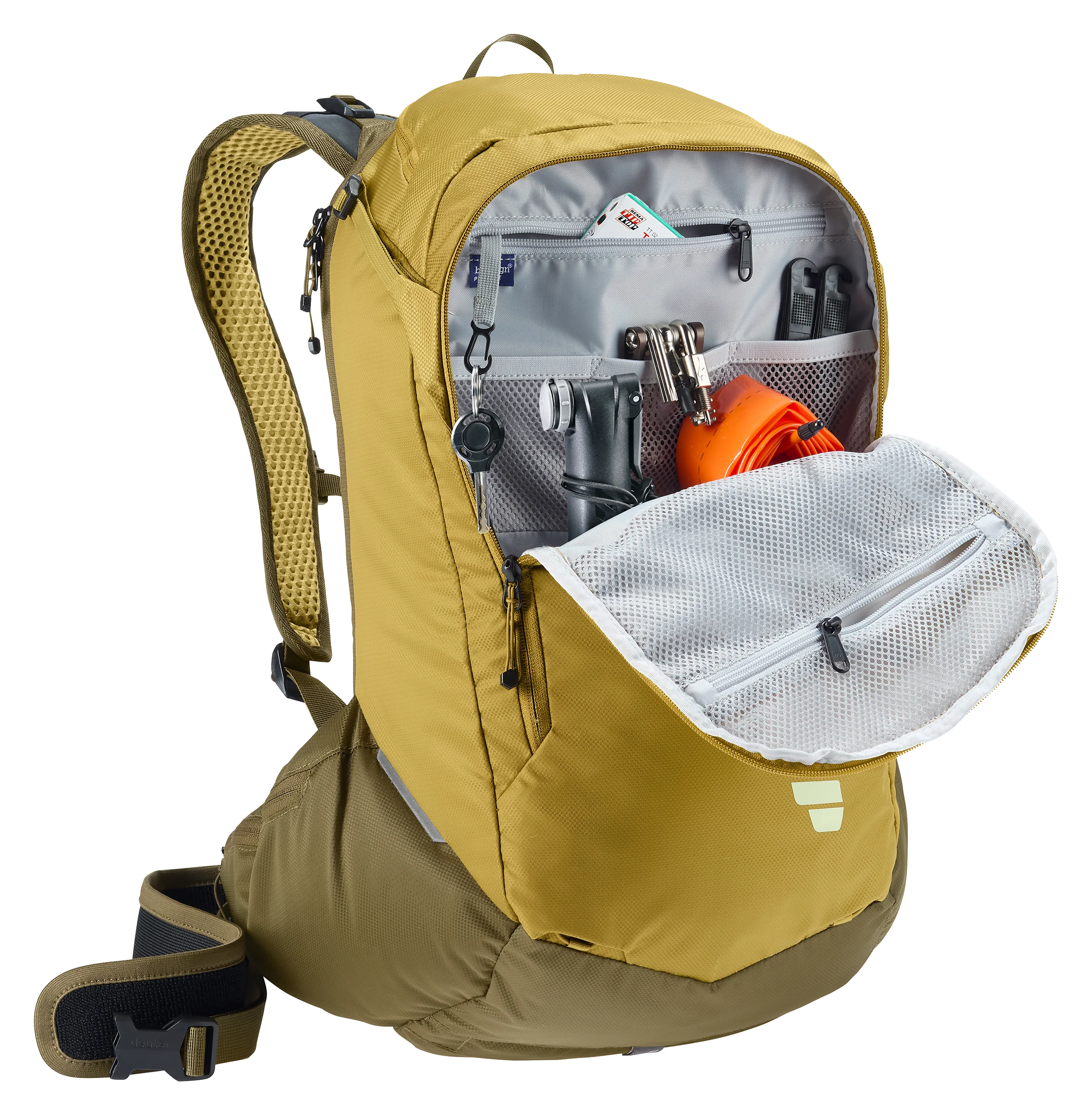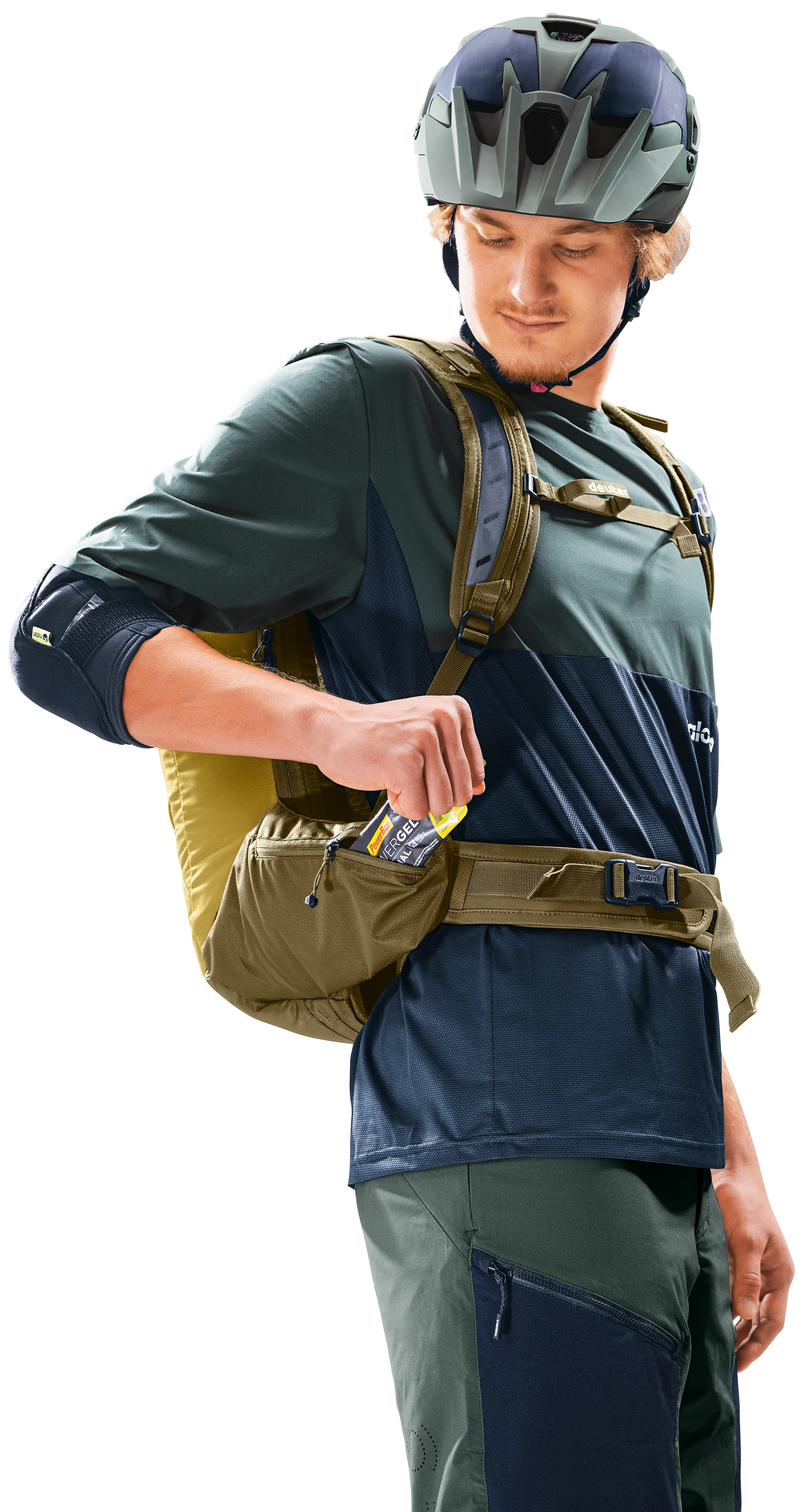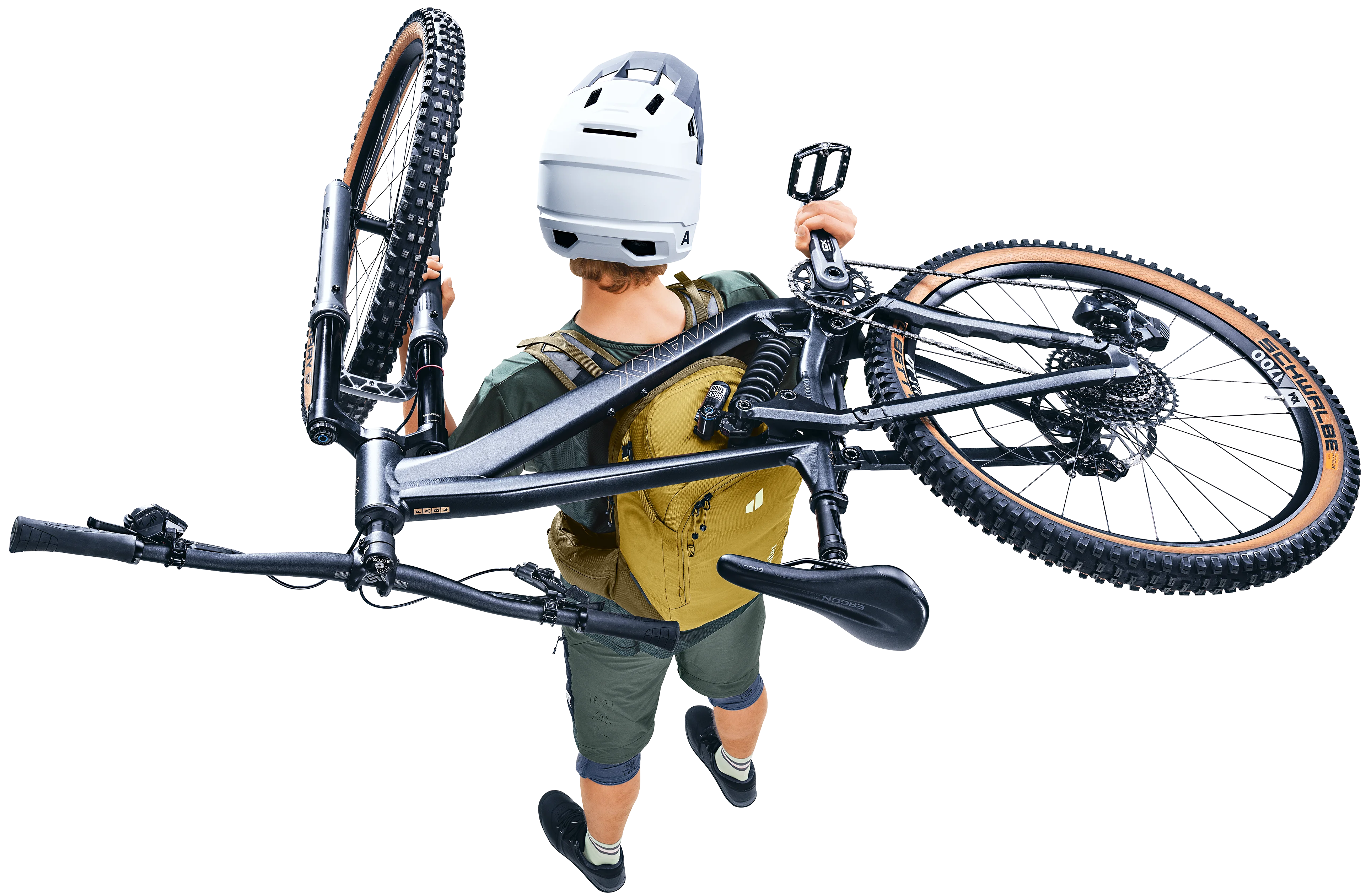 Spacious TÜV/GS certified bike pack with a lightweight, multi-impact back protector developed in collaboration with RE ZRO® for optimum protection. The Airstripes back system, together with mesh hip fins (with pockets) that extend from the pack, create a seamlessly snug fit. These can be cinched in using the double waist belt and distribute the weight onto the hips, to relieve strain on the back and shoulders. The Carrying Guard makes it easy to shoulder your bike, while special bungee cords can be used to strap your helmet and protective gear onto your pack.