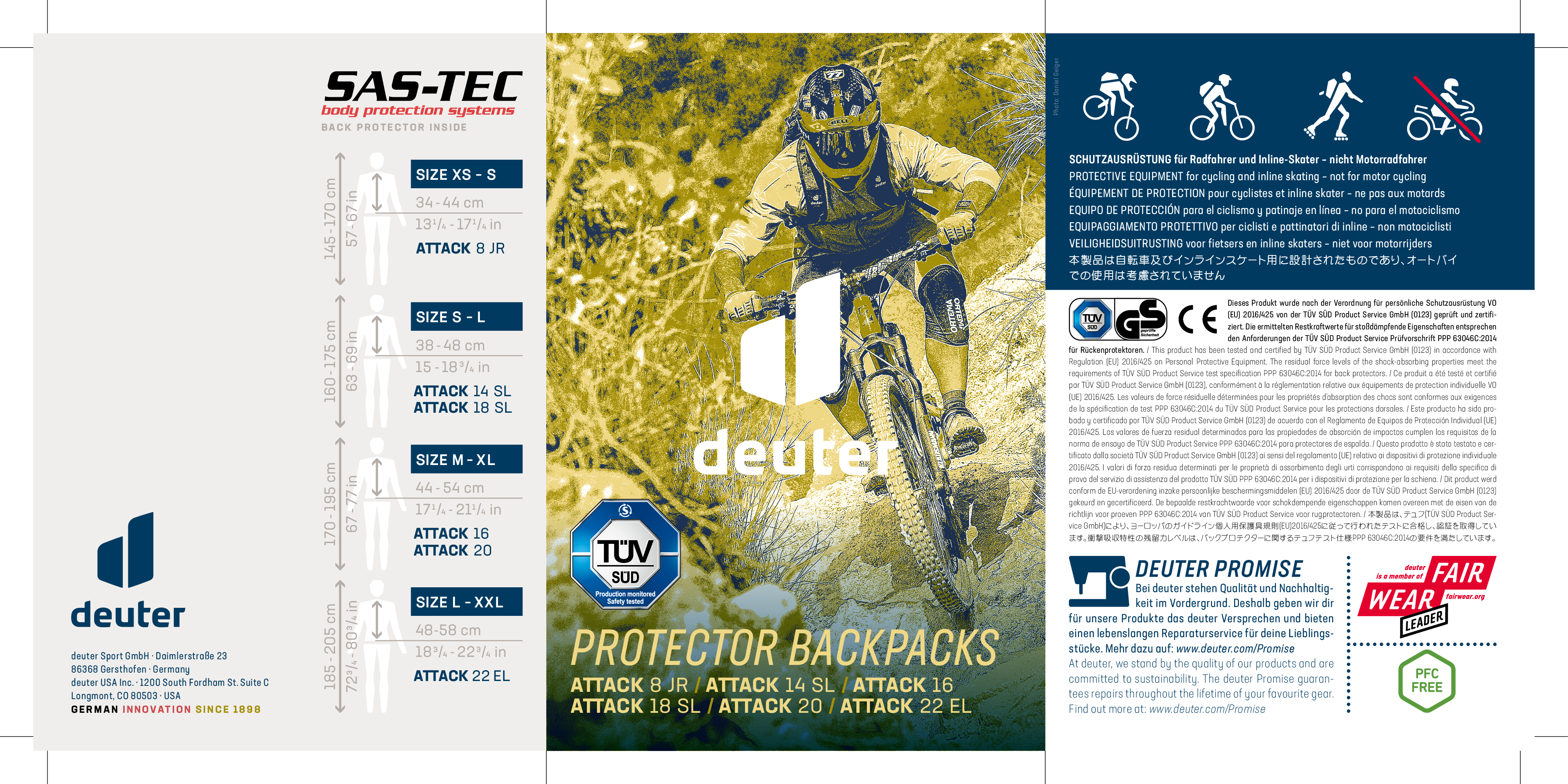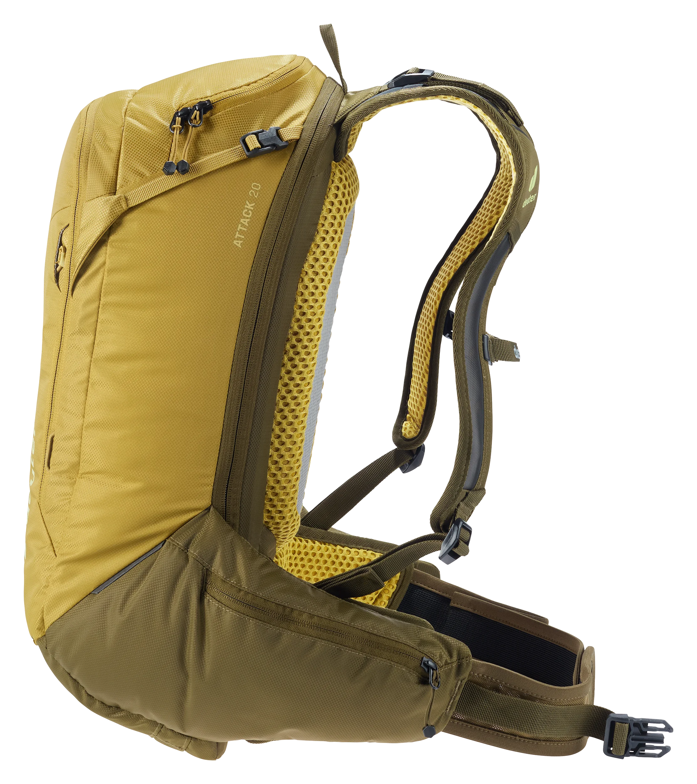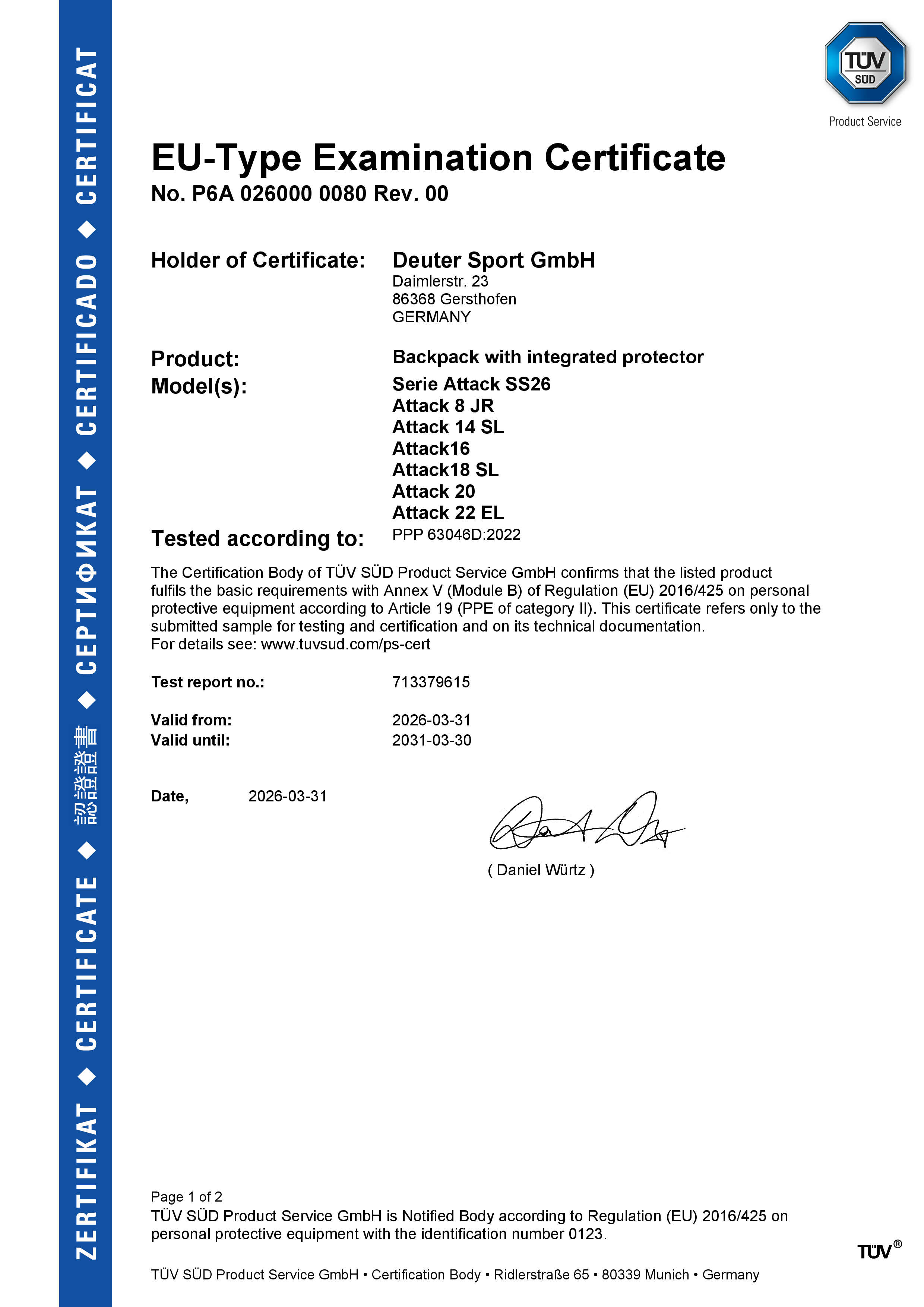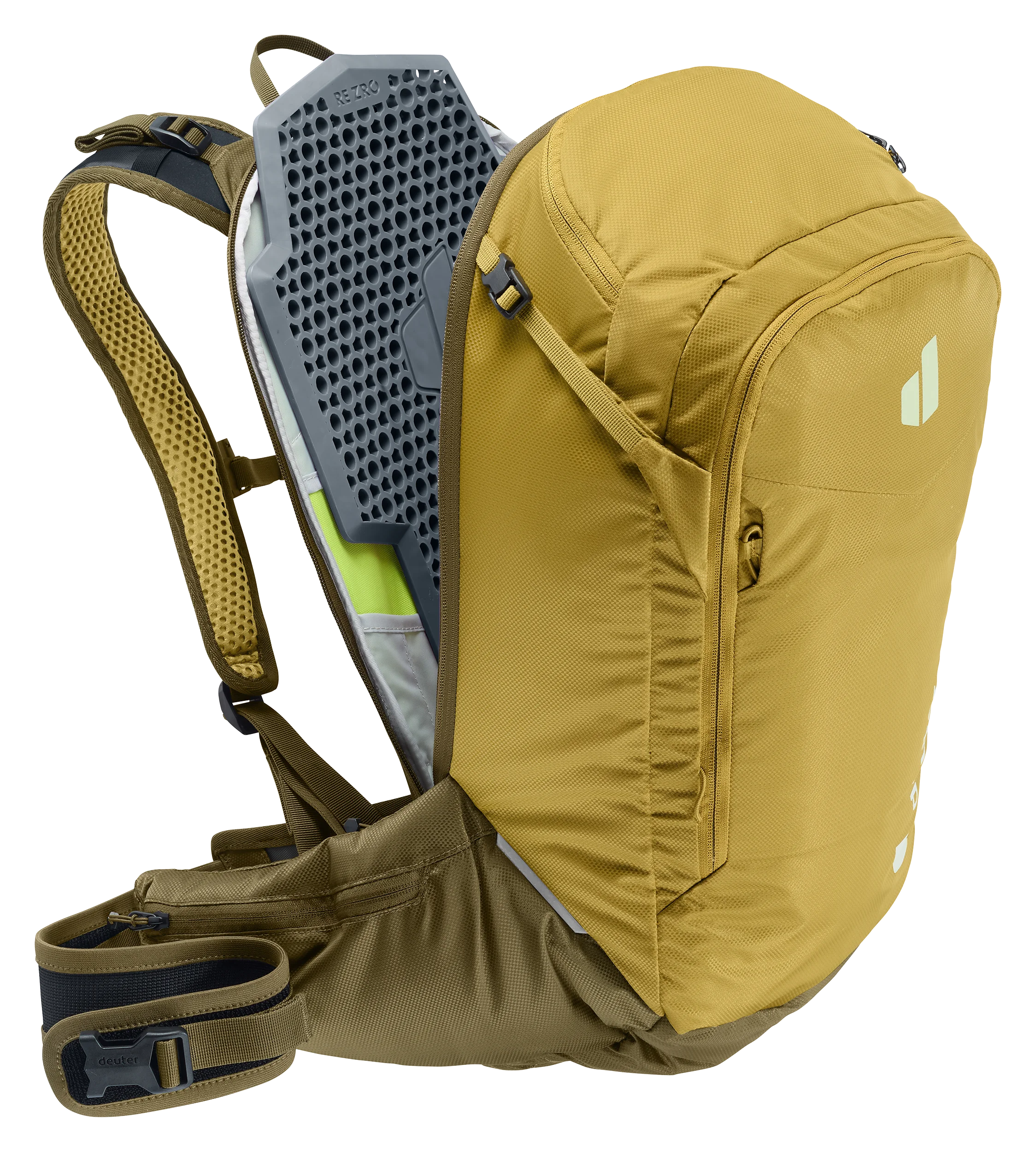 A removable TPE back protector developed in collaboration with RE ZRO® offers reliable multi-impact protection. Its special flexible, perforated structure gives it ventilation and improved comfort, and the compound it’s made from is fully recyclable and fully biodegradable. Used in combination with the Attack backpack, it is TÜV certified for the highest performance.