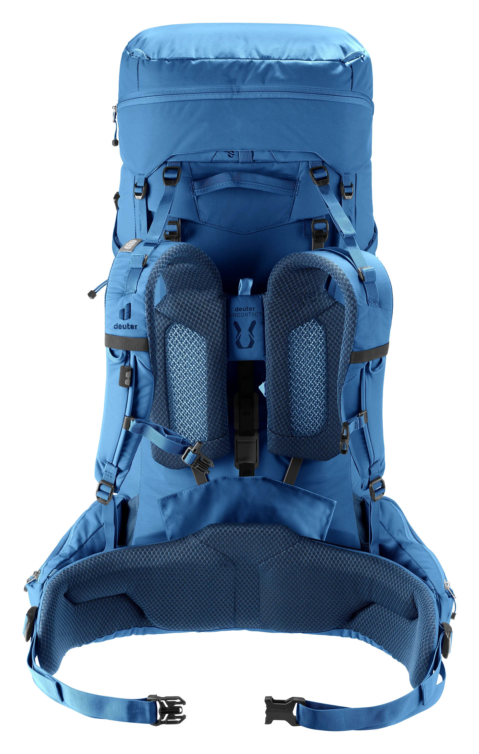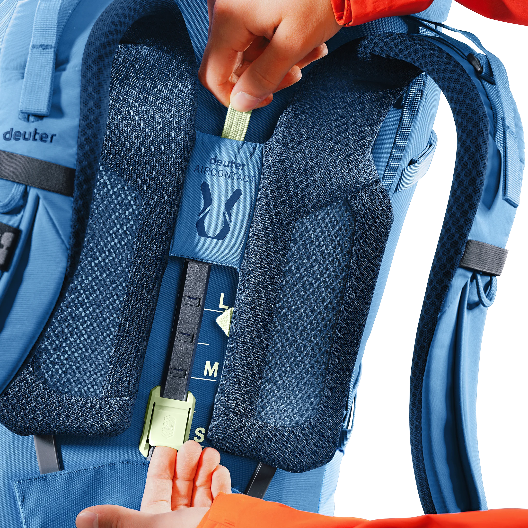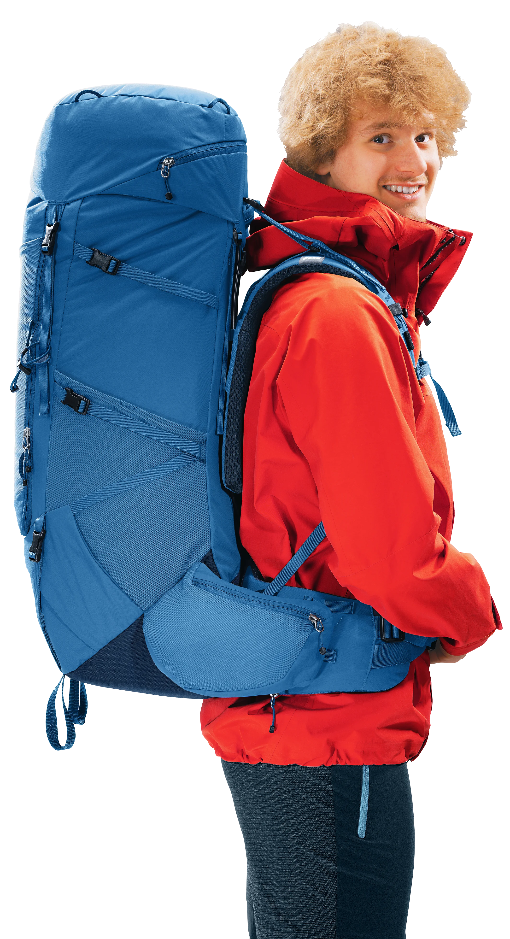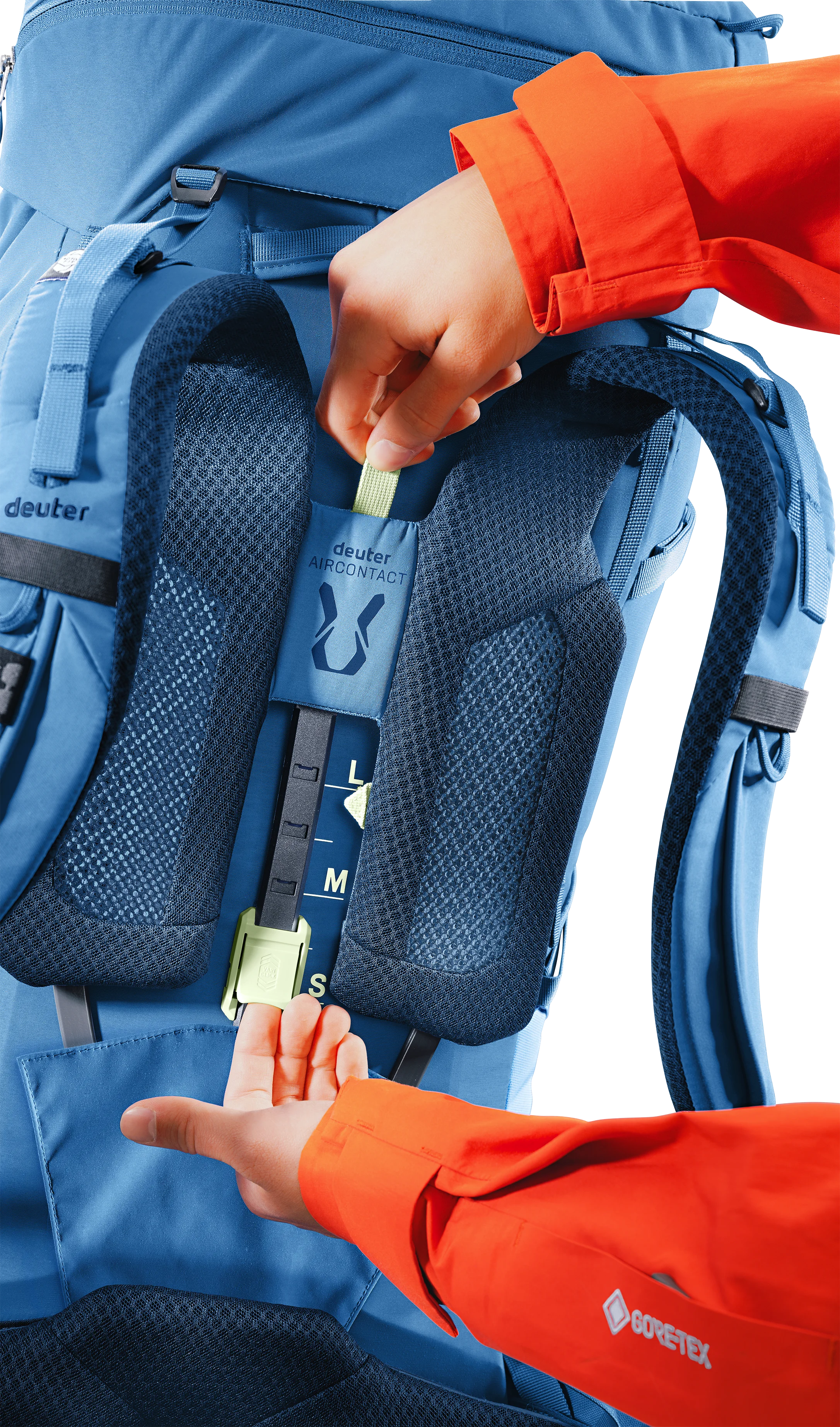Our new VariClick system offers five-stage back length adjustment for a tailored fit. This easy-to-use feature benefits from an audible ‘click’ when in position and because it stems from the center of the pack creates an evenly adjusted length. The new ActiveBalance shoulder straps have a pivoting shoulder panel that moves independently from the pivoting VariFlex hip fins for greater load stability and a more central positioning of the pack. While two anchor positions for the stabilizer straps adapt to the size of the person carrying the pack. The ECL (ergonomic comfort lock) system transfers the load effectively onto the hips. The Y-shaped aluminum frame gives the pack stability and, combined with the breathable Air Spacer mesh on the Aircontact back system, generates maximum airflow across the back. Continuous one-piece padding for the hip fins and shoulder straps cuts out pressure spots and increases the carrying comfort.