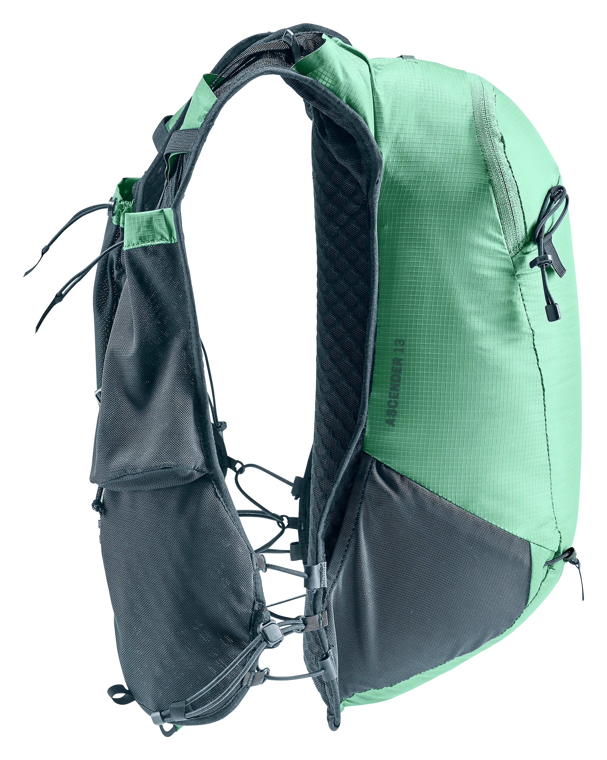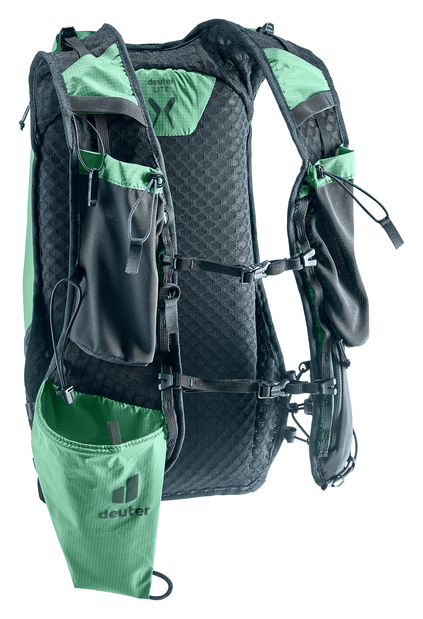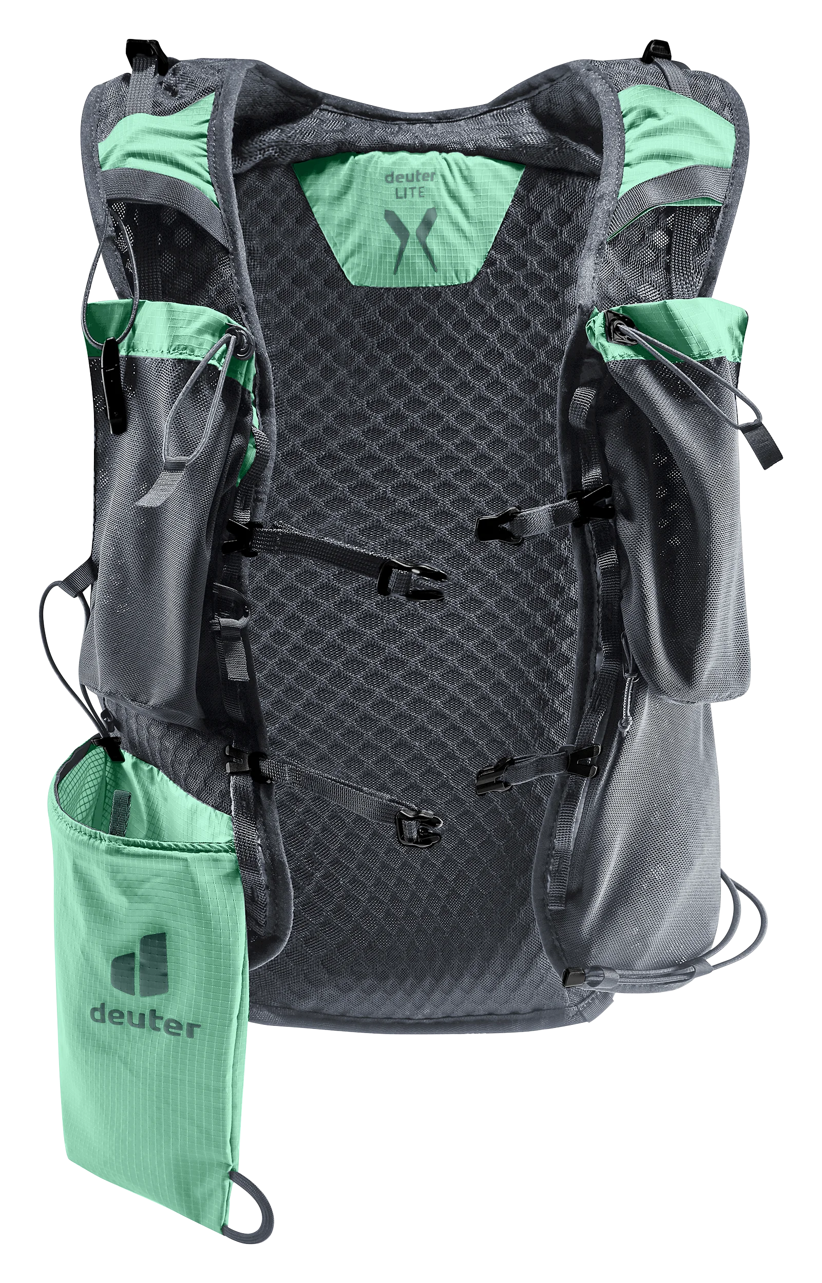 Ultra-lightweight and super comfortable: wide, ergonomic vest-style shoulder straps with elasticated compression system, two adjustable sternum straps and soft material against the back create a garment-like fit. A stretch mesh inner pocket and side compression straps help eliminate load wobble no matter how challenging the terrain. A holster pocket on the front of one shoulder strap makes it quick and easy to access collapsible trekking poles. And the two 500 ml Streamer Flasks LP (included) can be stashed in the shoulder strap pockets, keeping them within reach. The body fabric is made from 100% recycled materials and is bluesign® certified.