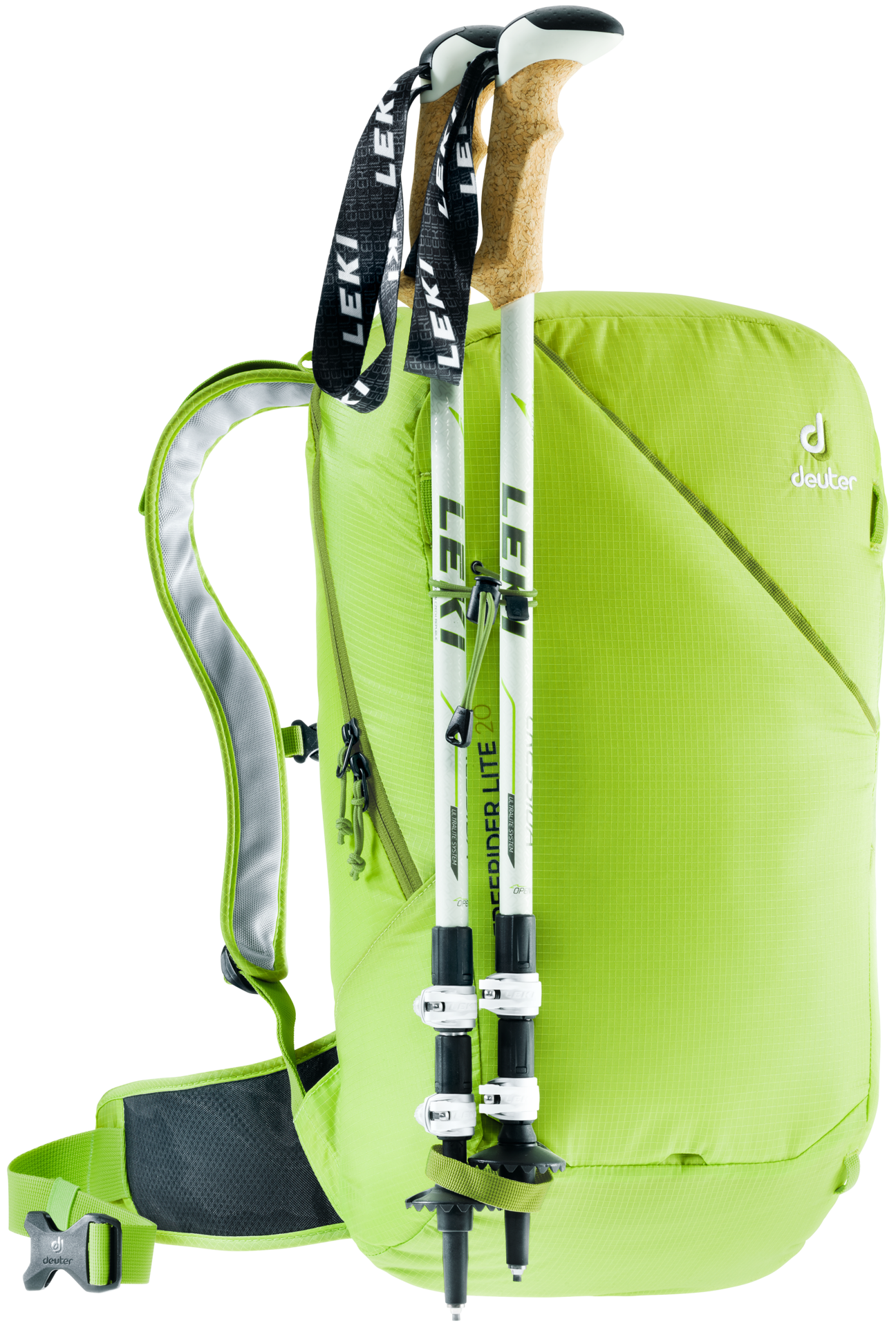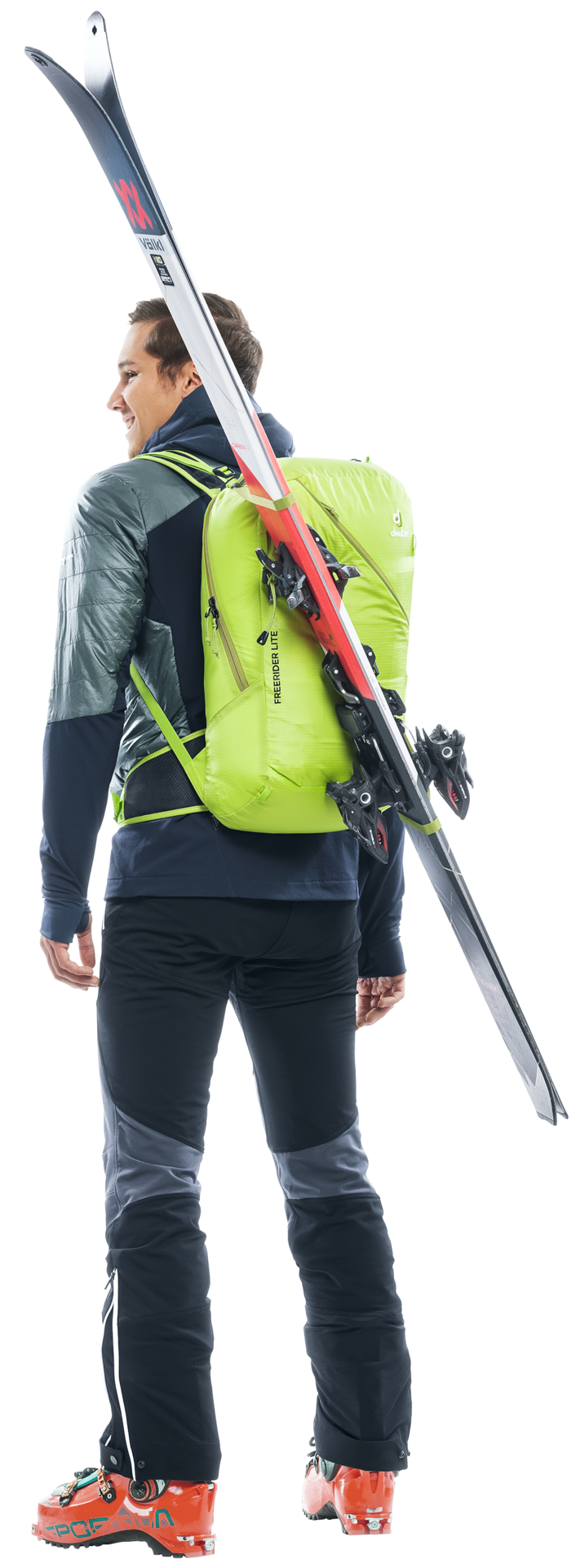 If you spend your winters in the mountains – skinning and skiing – then the ultra-lightweight Deuter Freerider Lite touring pack is just what you’re looking for. Featuring our Lite carry system and made from a new fabric that’s hard wearing, breathable and snow resistant, the Freerider Lite is extremely comfortable to carry. Sweaty, wet equipment and clothing can be stashed in the front pocket, leaving contents in the main compartment dry. We’ve also equipped it with our new modular attachment set-up. You can strap your skis, snowboard or snowshoes onto the outside of the pack using two dedicated stowable straps attached to the gear loops on the pack: skis diagonally, snowboards and snowshoes in an upright position. And with the weight of this pack pared down to a minimum, you’ll make light work of the ascent.