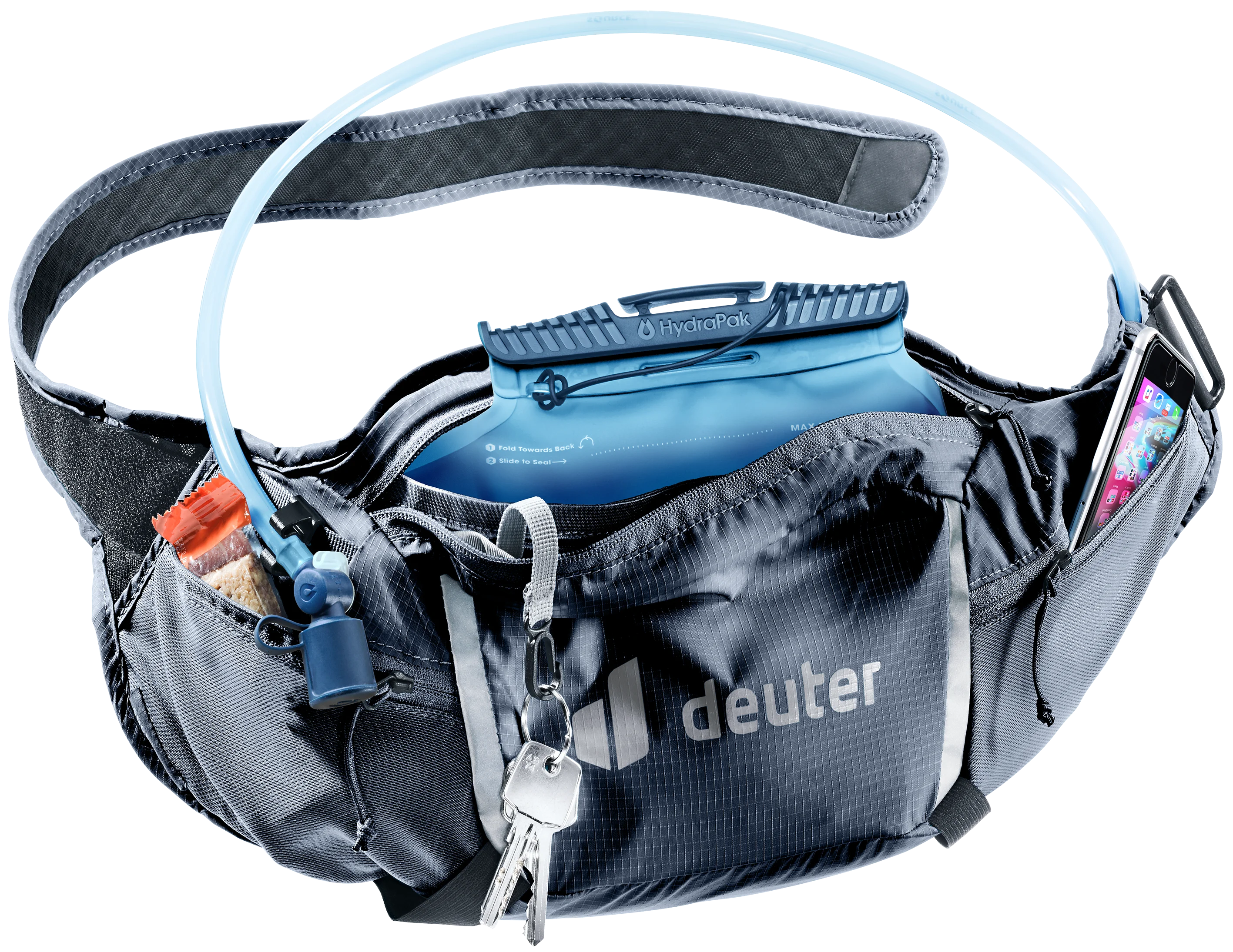 The easy-to-use trekking pole attachment on this running belt enables quick, on-the-go access to poles, without missing a stride, on longer trail runs. Clever compartment configuration also means that your valuables, energy bars and Streamer SQ 1.5 L hydration bladder (included) are easily accessible. A trim-to-fit waist belt cuts down on excess weight and ensures a personalized fit. This bluesign® product uses body fabric made of 100% recycled materials with components made using environmentally friendly, resource-efficient manufacturing practices. It meets the Green Button standard, is climate neutral, and made without PFAS.