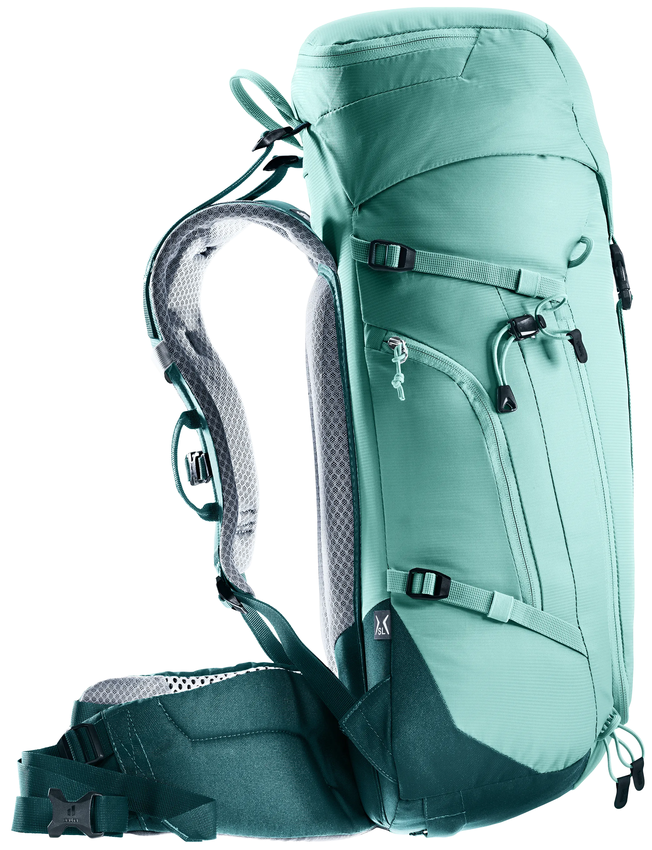 The reduced contact surface and large ventilation channels of the deuter Airstripes back system generates optimum air flow, while perforated shoulder straps and hip fins (with pockets) ensure even weight distribution – for a snug, secure fit over any terrain. A flat-format lid allows space for the head to move, even with a helmet on. Loops on the shoulder straps keep via ferrata set carabiners close at hand. And thanks to a large front zipper opening and side pockets, equipment and gear are always easy to access.