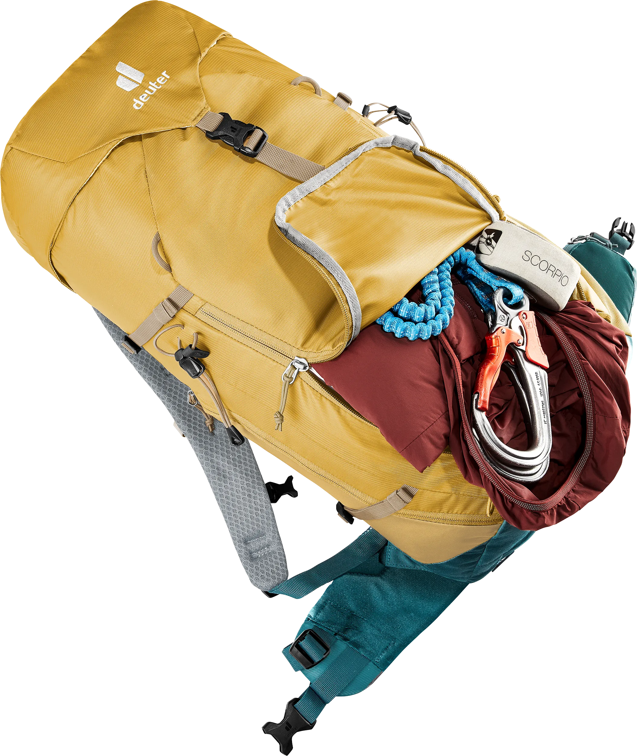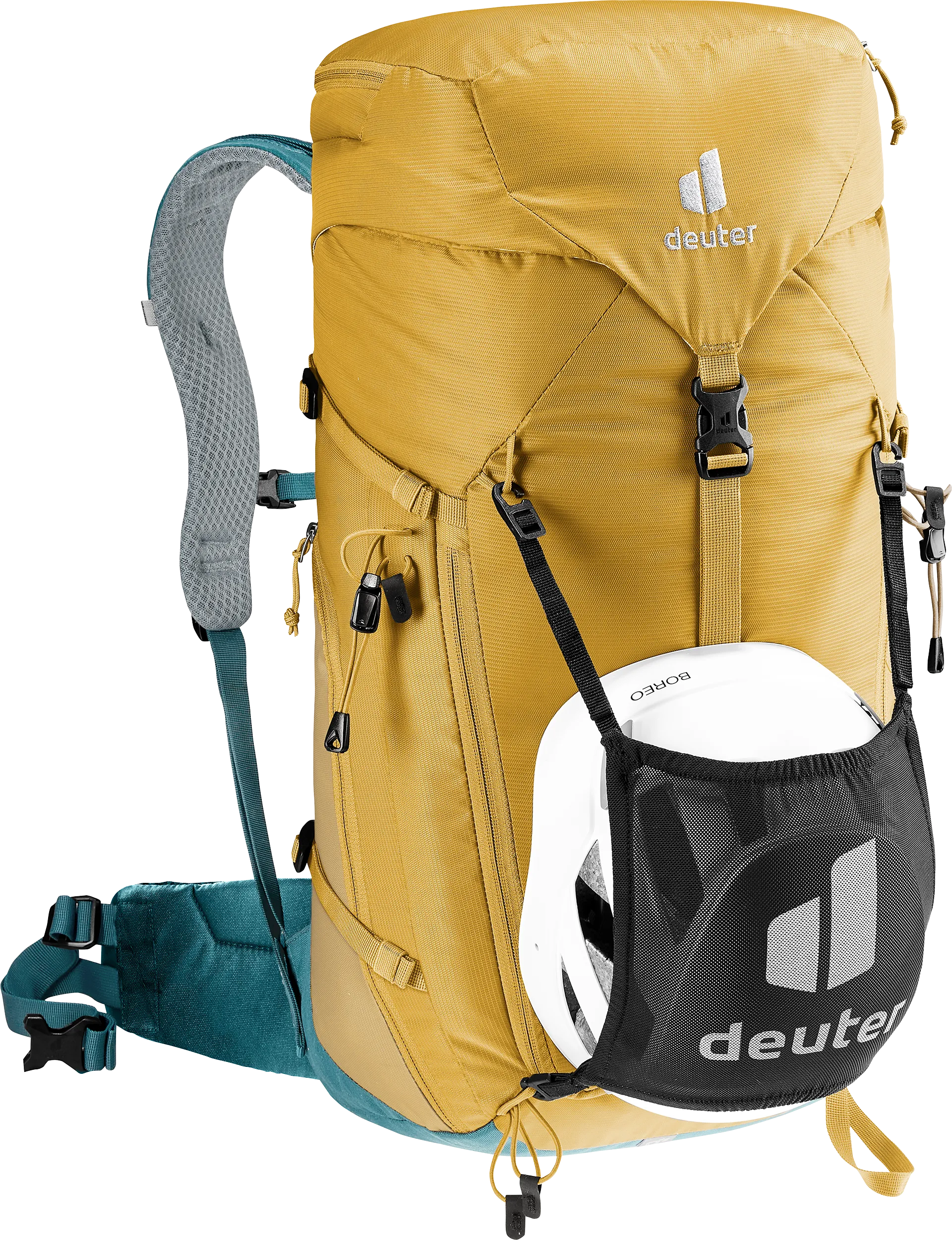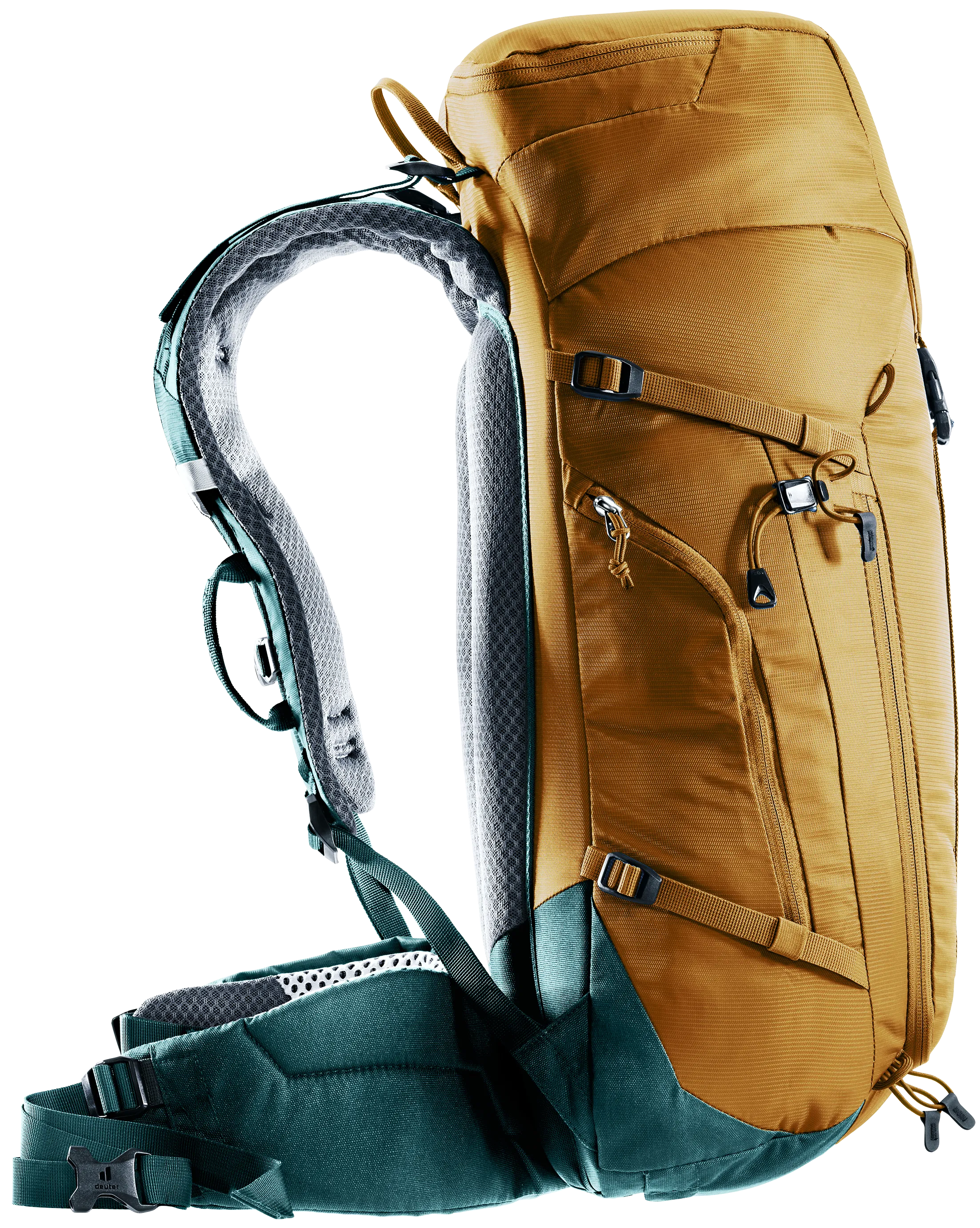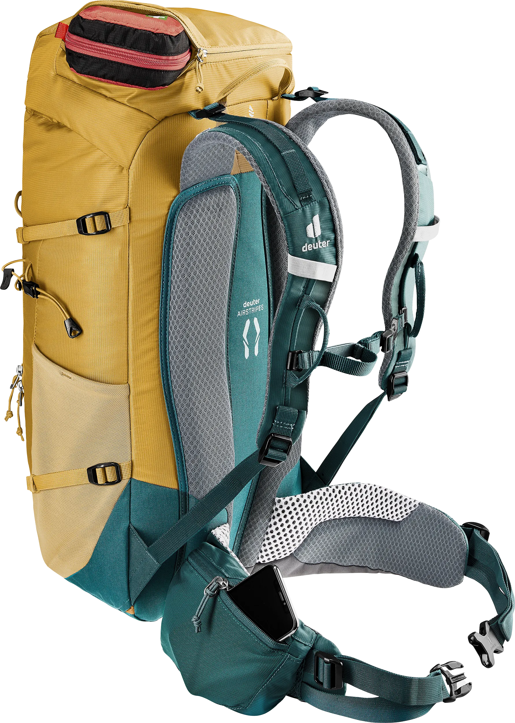 The reduced contact surface and large ventilation channels of the deuter Airstripes back system generates optimum air flow, while perforated shoulder straps and hip fins (with pockets) ensure even weight distribution – for a snug, secure fit over any terrain. A flat-format lid allows space for the head to move, even with a helmet on. Loops on the shoulder straps keep via ferrata set carabiners close at hand. And thanks to a large front zipper opening and side pockets, equipment and gear are always easy to access.