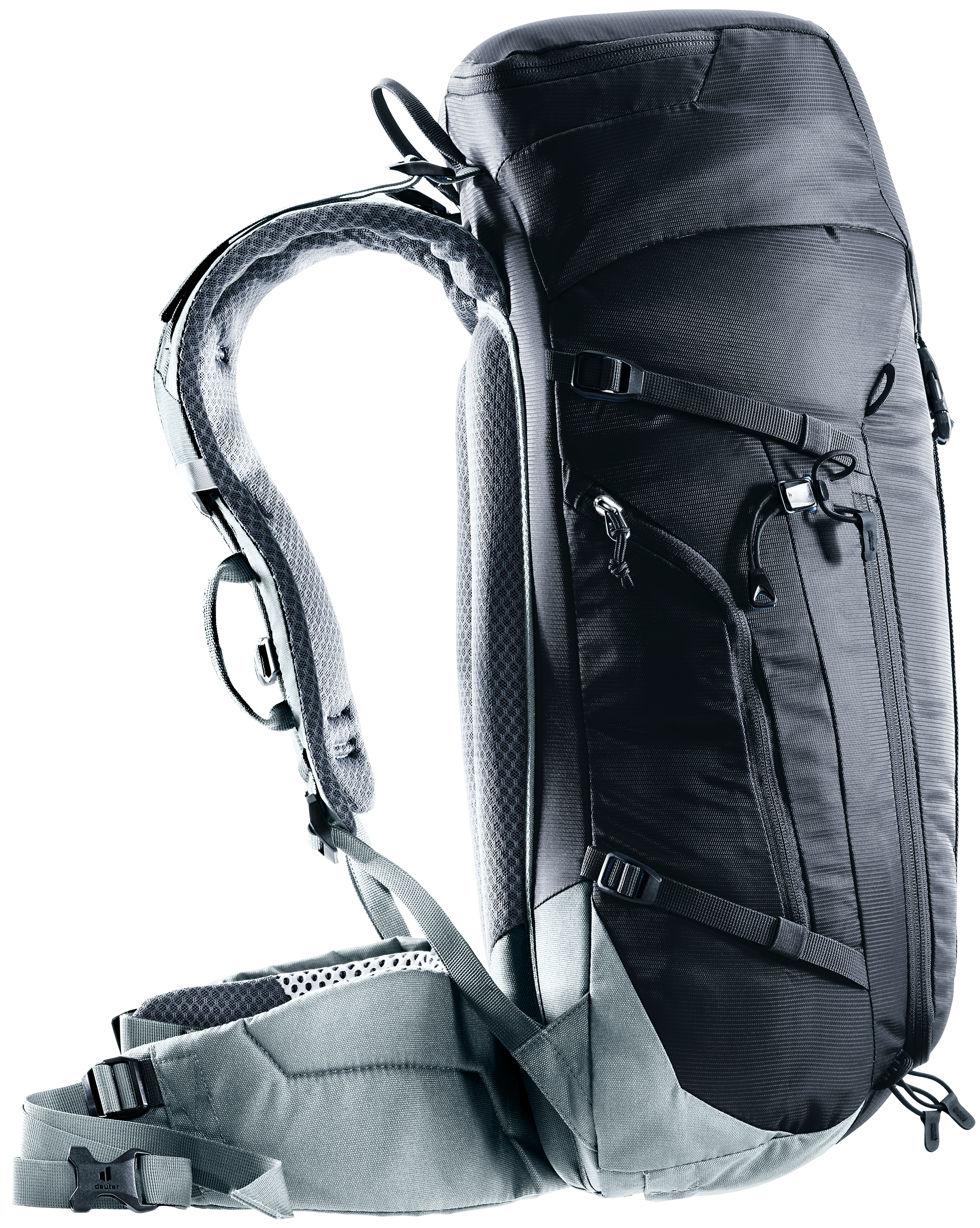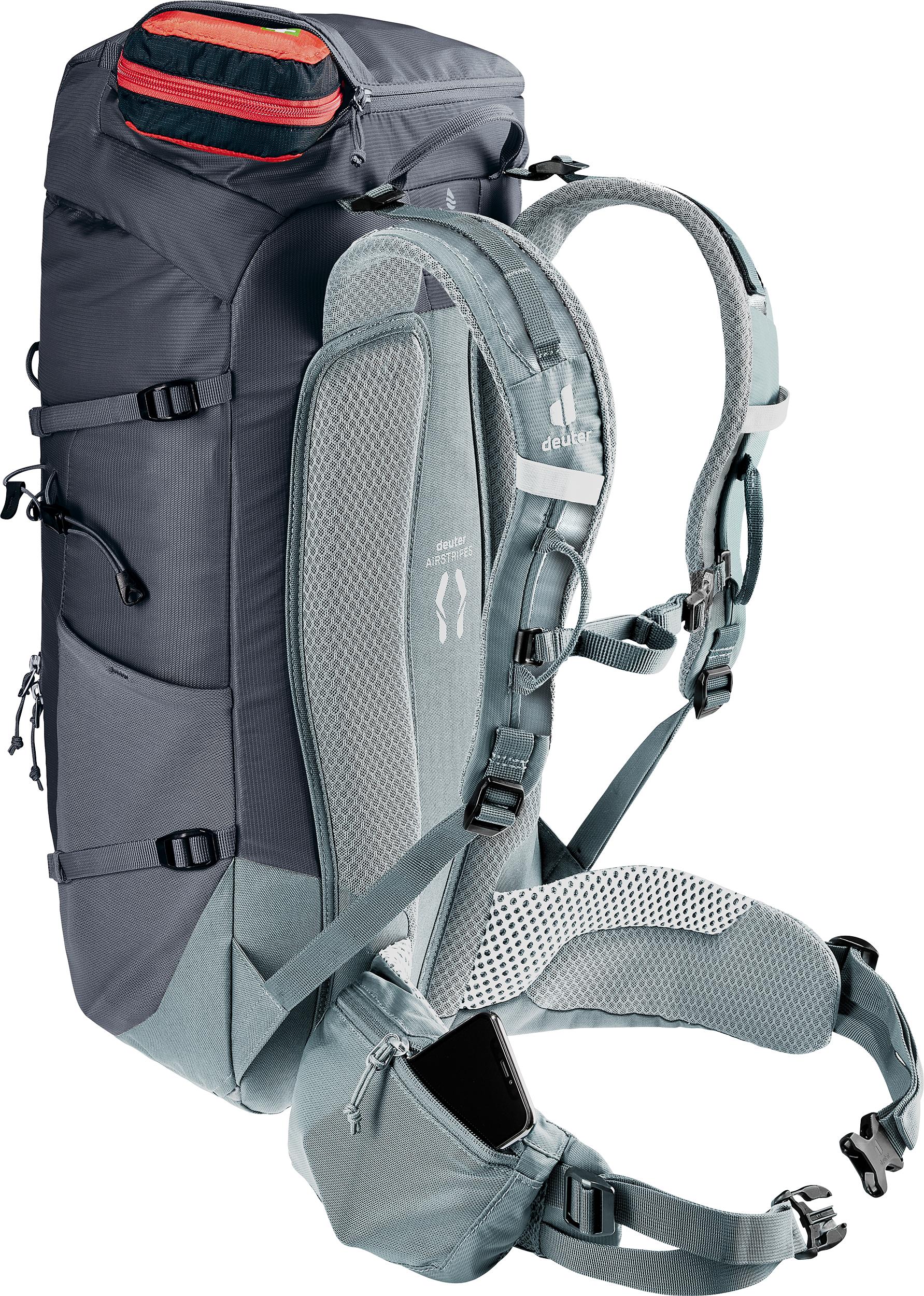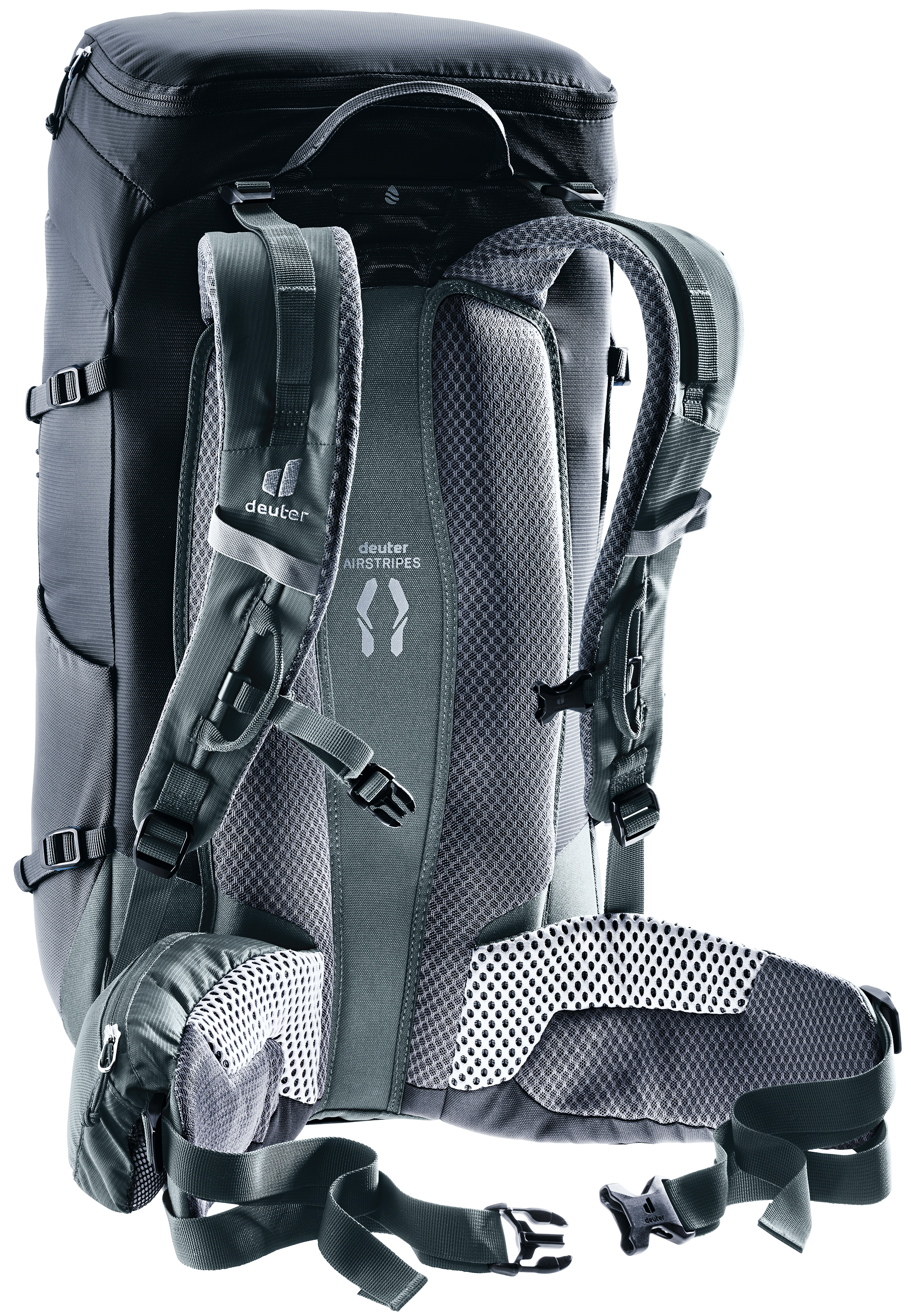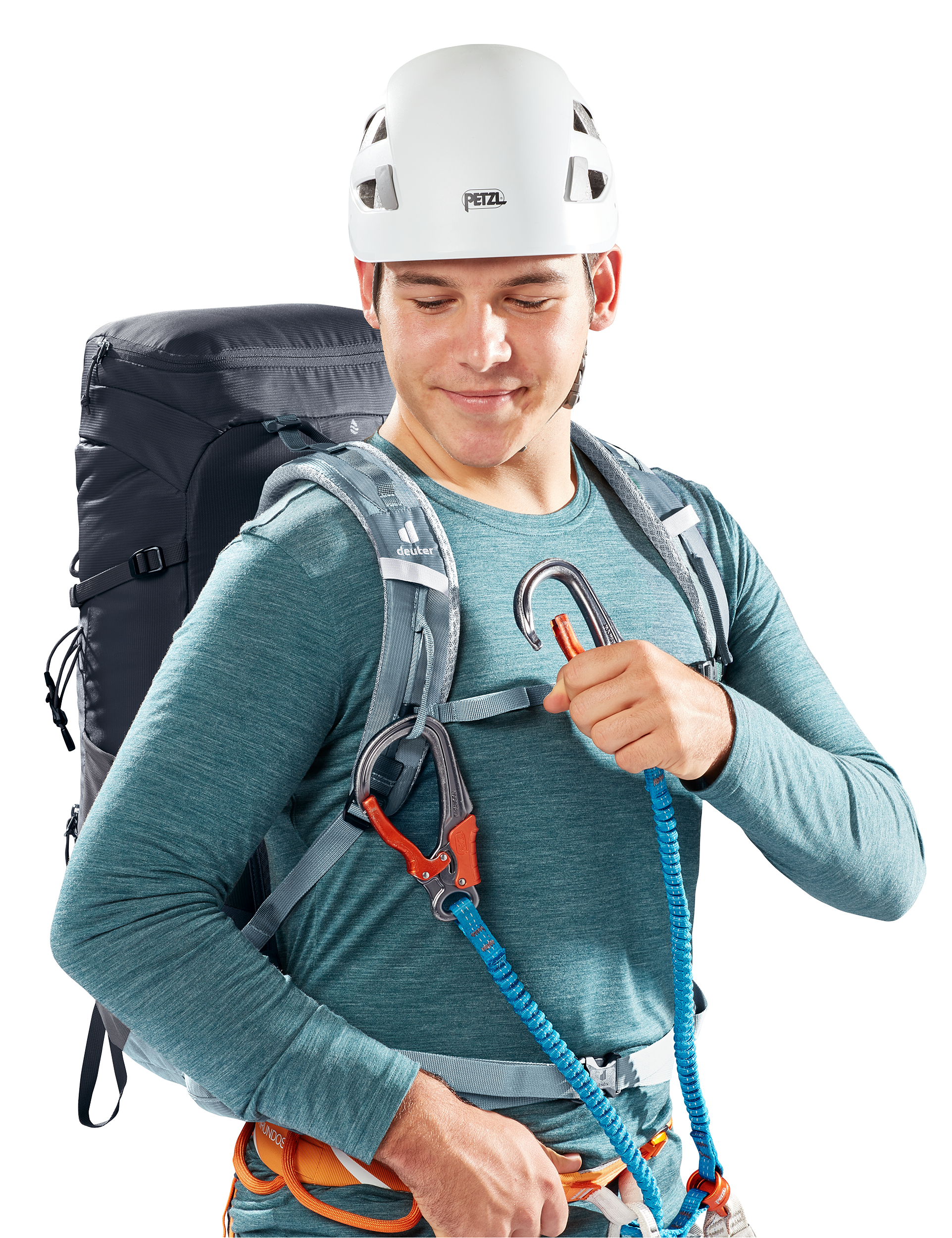 The reduced contact surface and large ventilation channels of the deuter Airstripes back system generates optimum air flow, while perforated shoulder straps and hip fins (with pockets) ensure even weight distribution – for a snug, secure fit over any terrain. A flat-format lid allows space for the head to move, even with a helmet on. Loops on the shoulder straps keep via ferrata set carabiners close at hand. And thanks to a large front zipper opening and side pockets, equipment and gear are always easy to access.