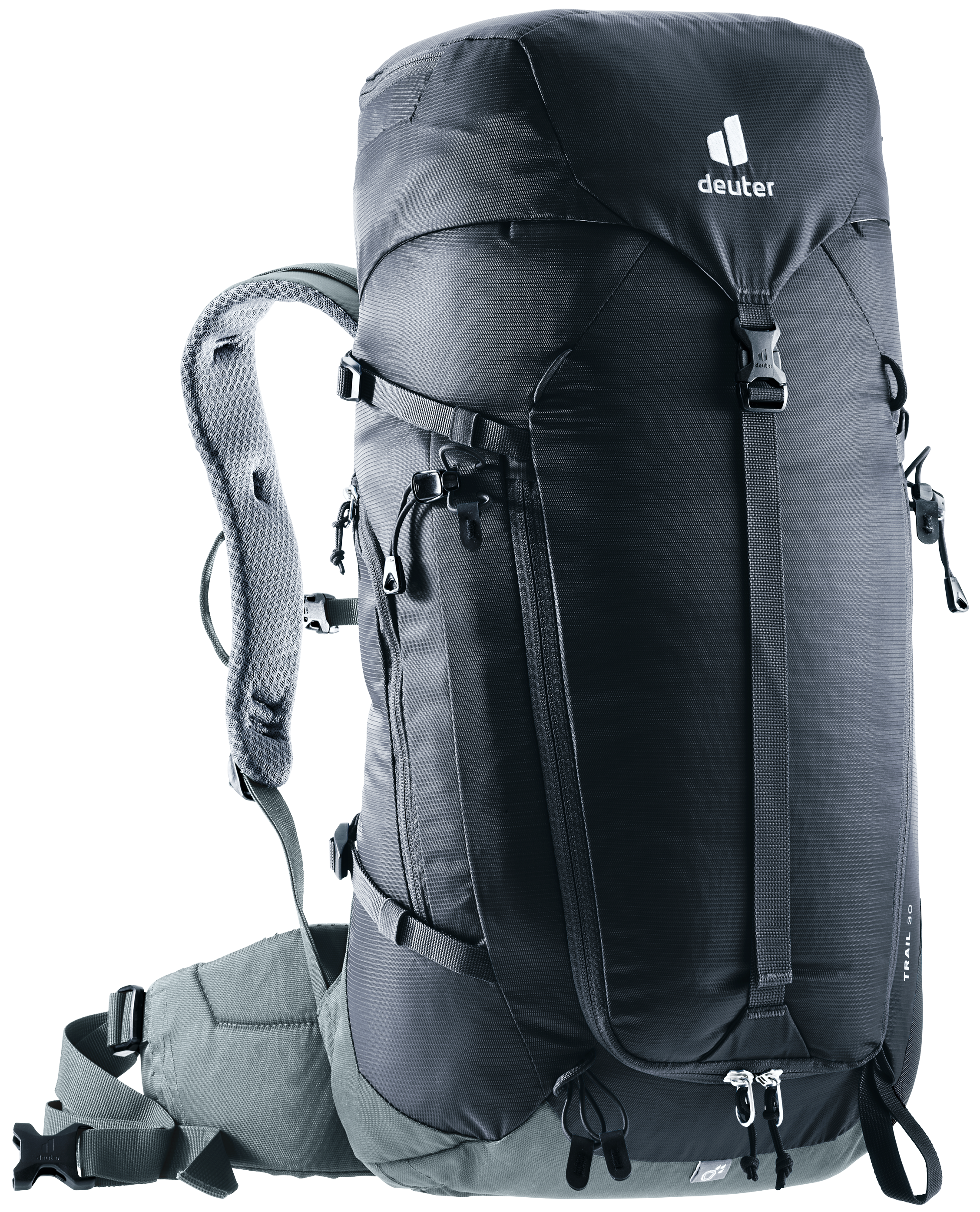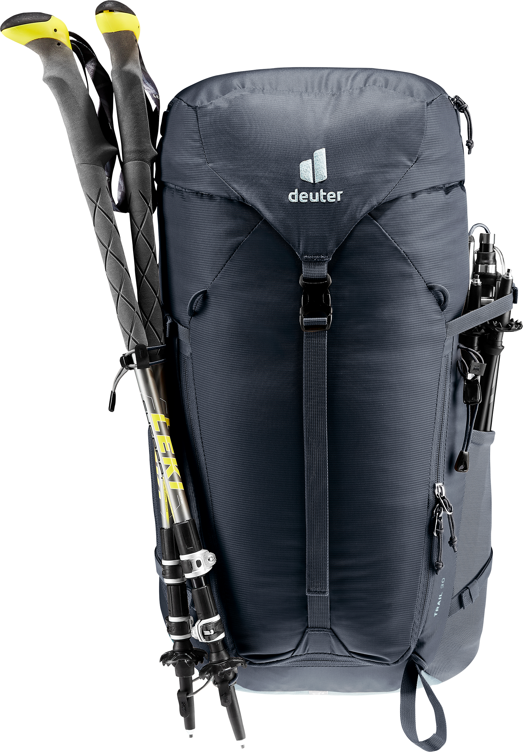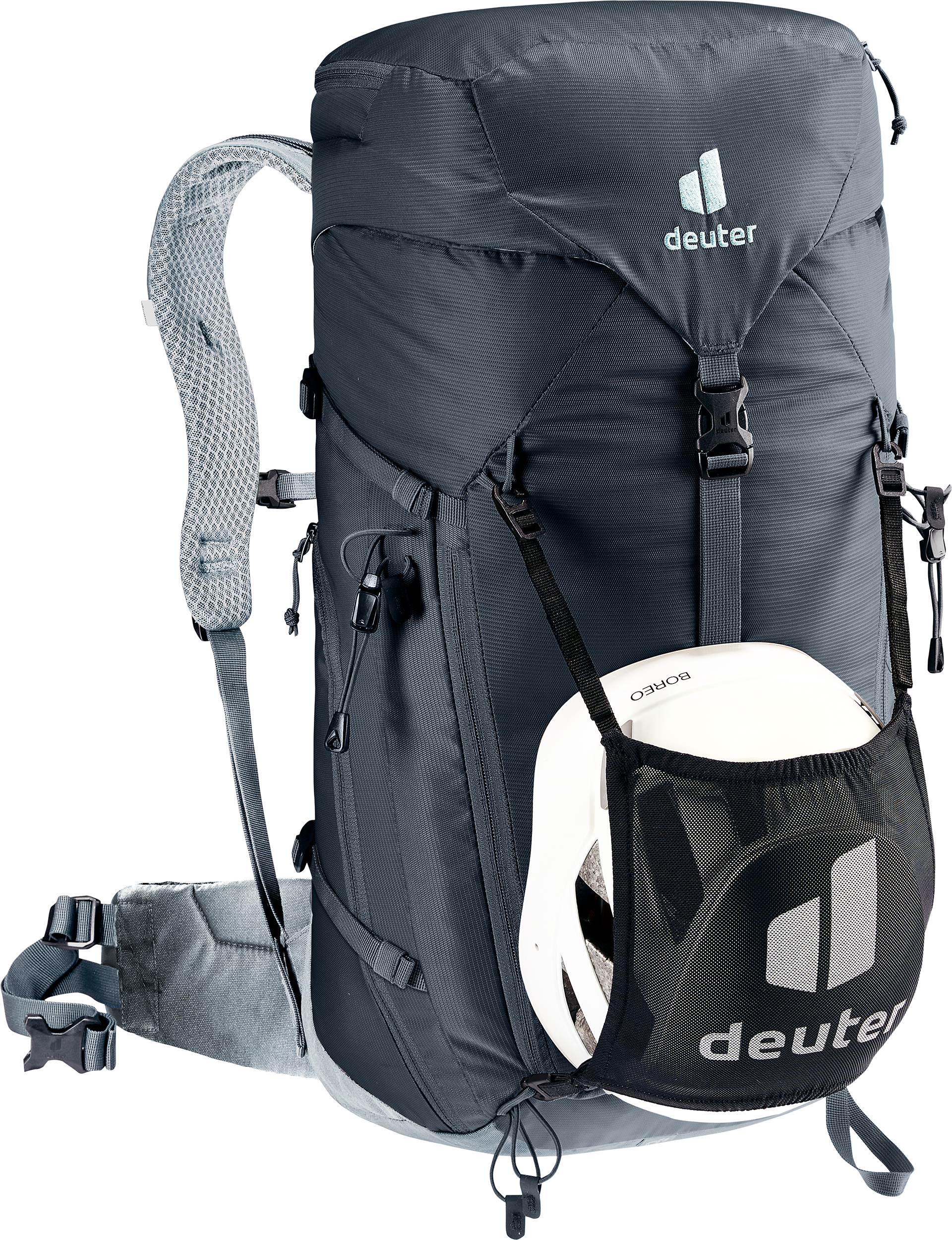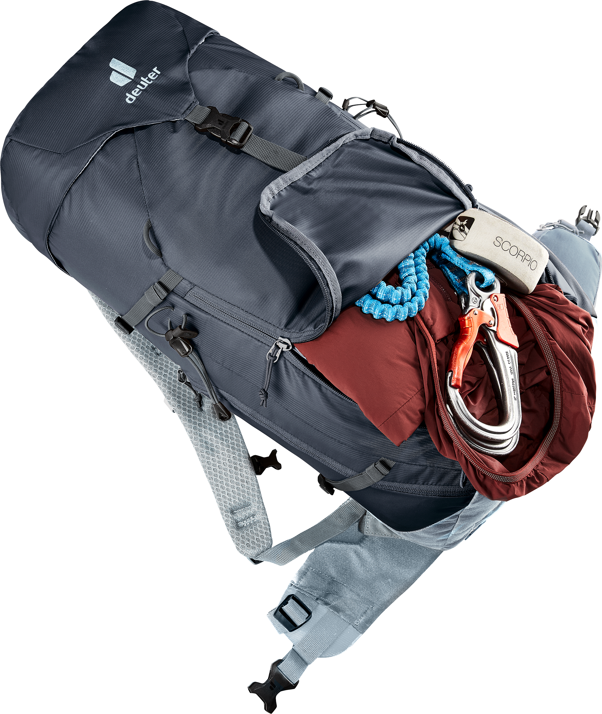The reduced contact surface and large ventilation channels of the deuter Airstripes back system generates optimum air flow, while perforated shoulder straps and hip fins (with pockets) ensure even weight distribution – for a snug, secure fit over any terrain. A flat-format lid allows space for the head to move, even with a helmet on. Loops on the shoulder straps keep via ferrata set carabiners close at hand. And thanks to a large front zipper opening and side pockets, equipment and gear are always easy to access.