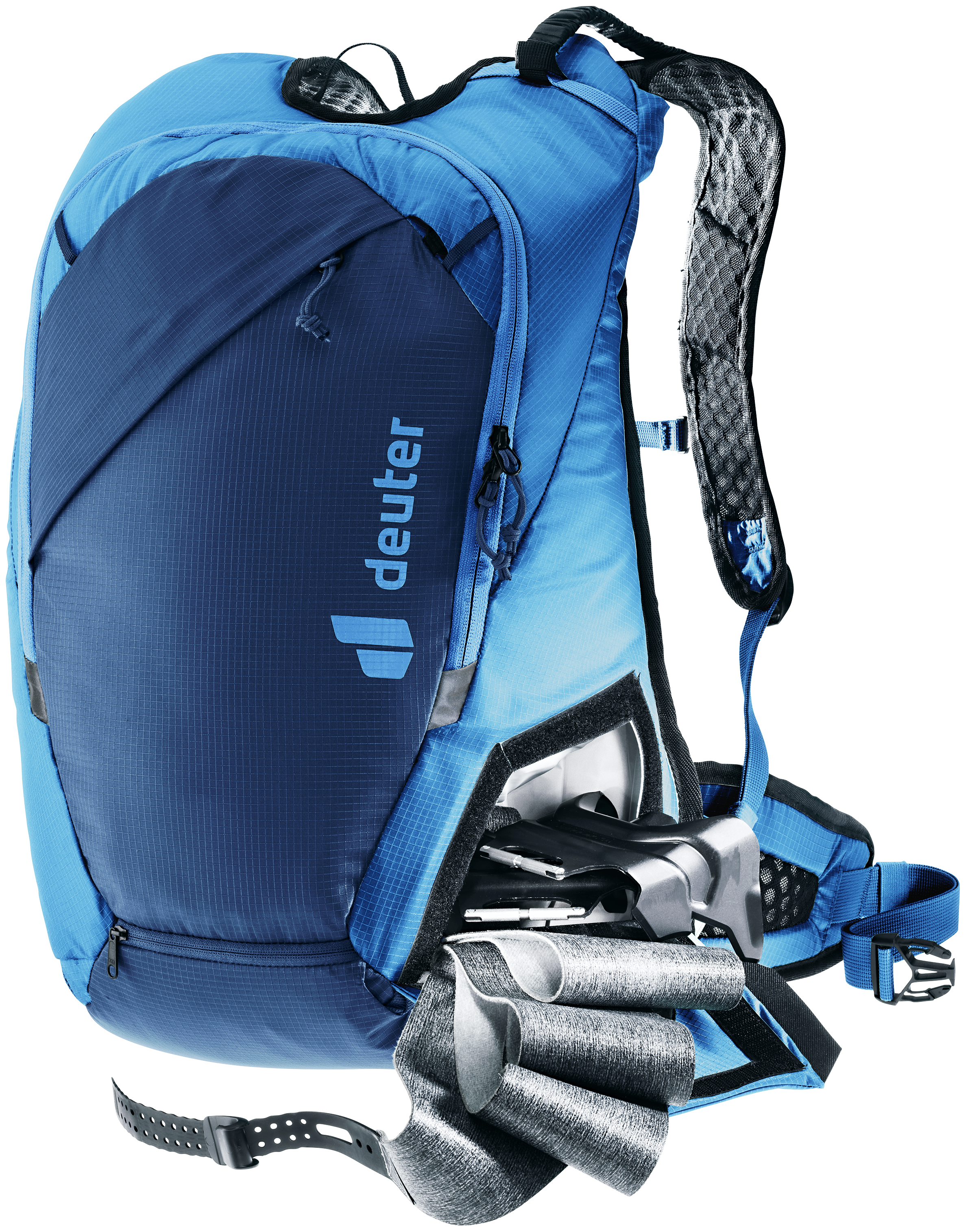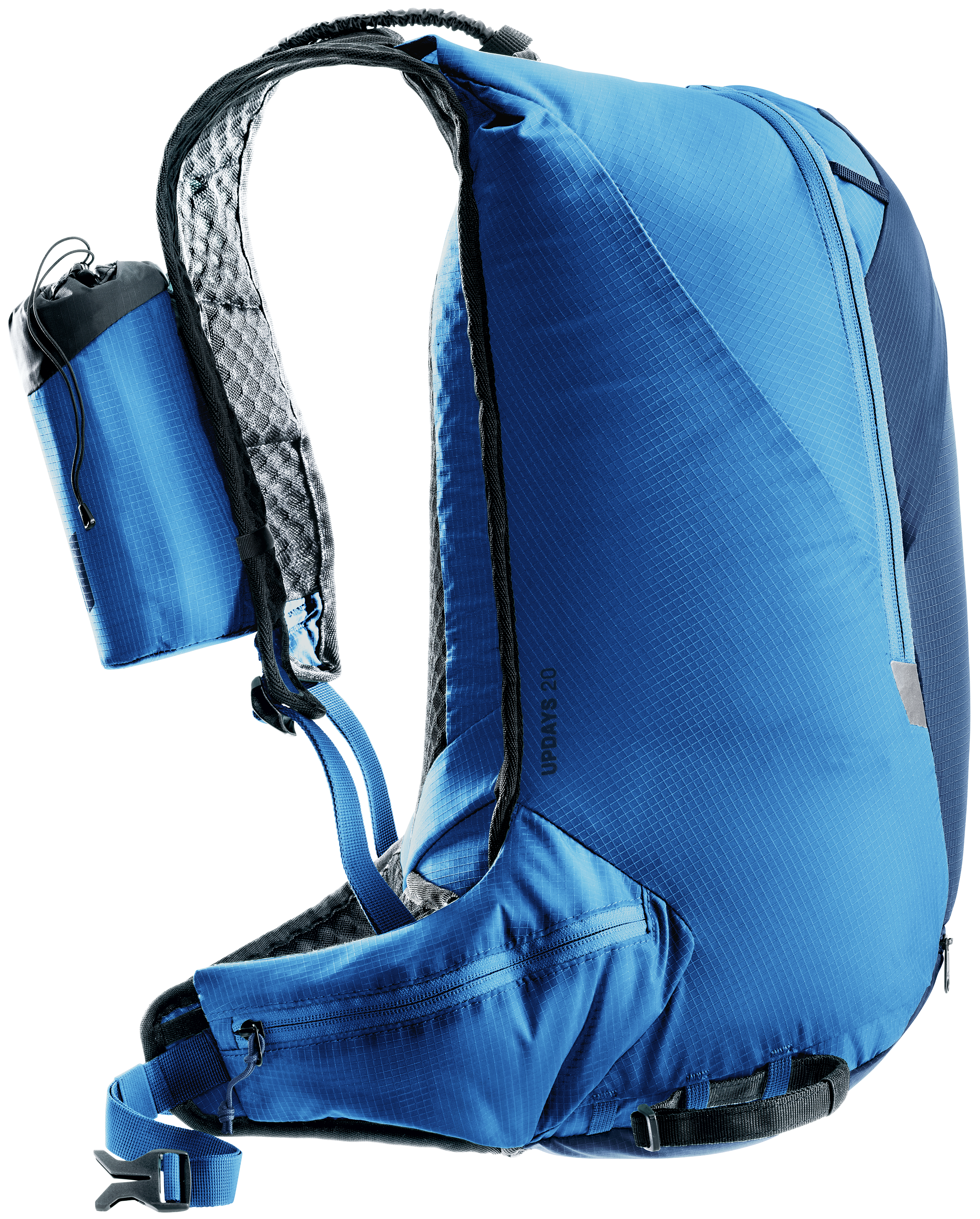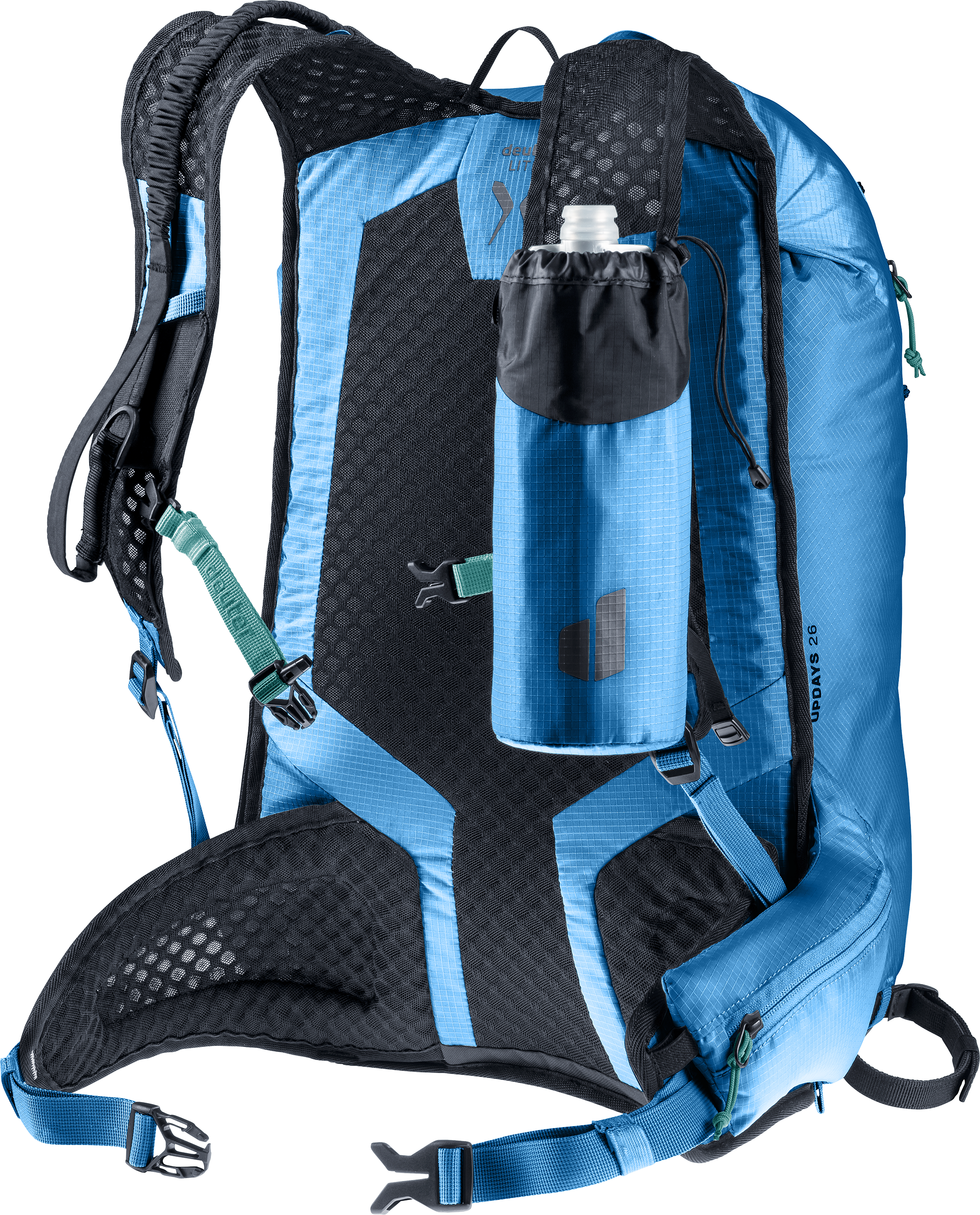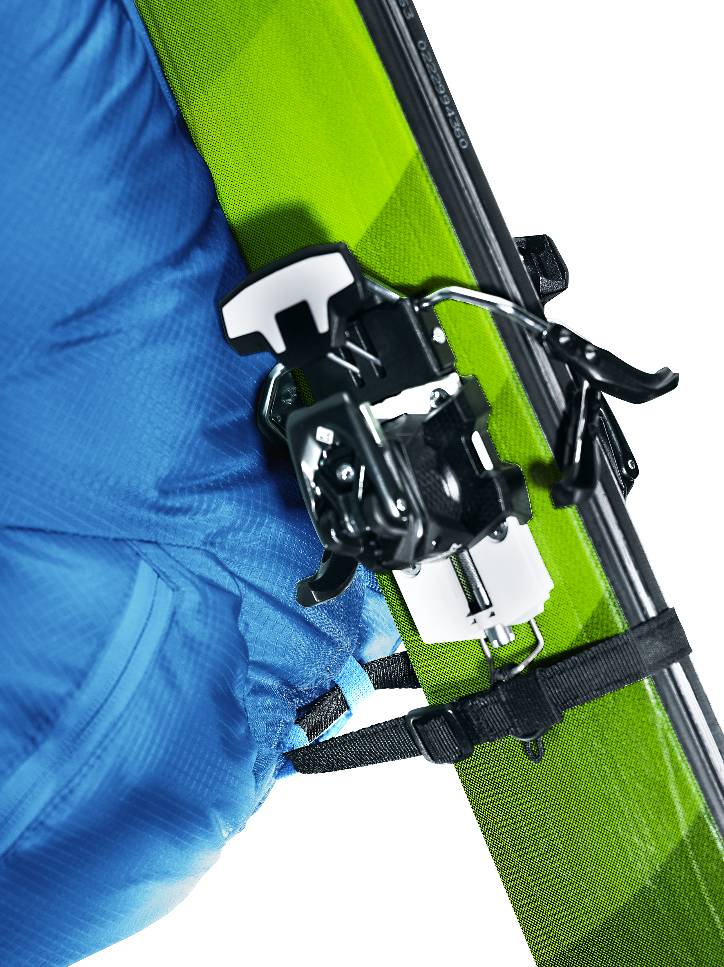 Just 710 g. Ultra-lightweight with deuter Lite comfort for speed ski touring: good ventilation, ergonomic hip fins and shoulder straps with a detachable sternum strap and foam back pad (removable) combine to create a snug fit with zero load wobble. An adjustable quick-fix diagonal ski attachment system with a sliding loop that fits round the ski ends and a bungee cord that wraps round the tips and secures to a hook on the shoulder strap gives the Updays quick and easy handling. An easy-access bottom compartment also makes it quick to get at skins, ski crampons or climbing crampons, without having to take the pack off. A climate neutral product.